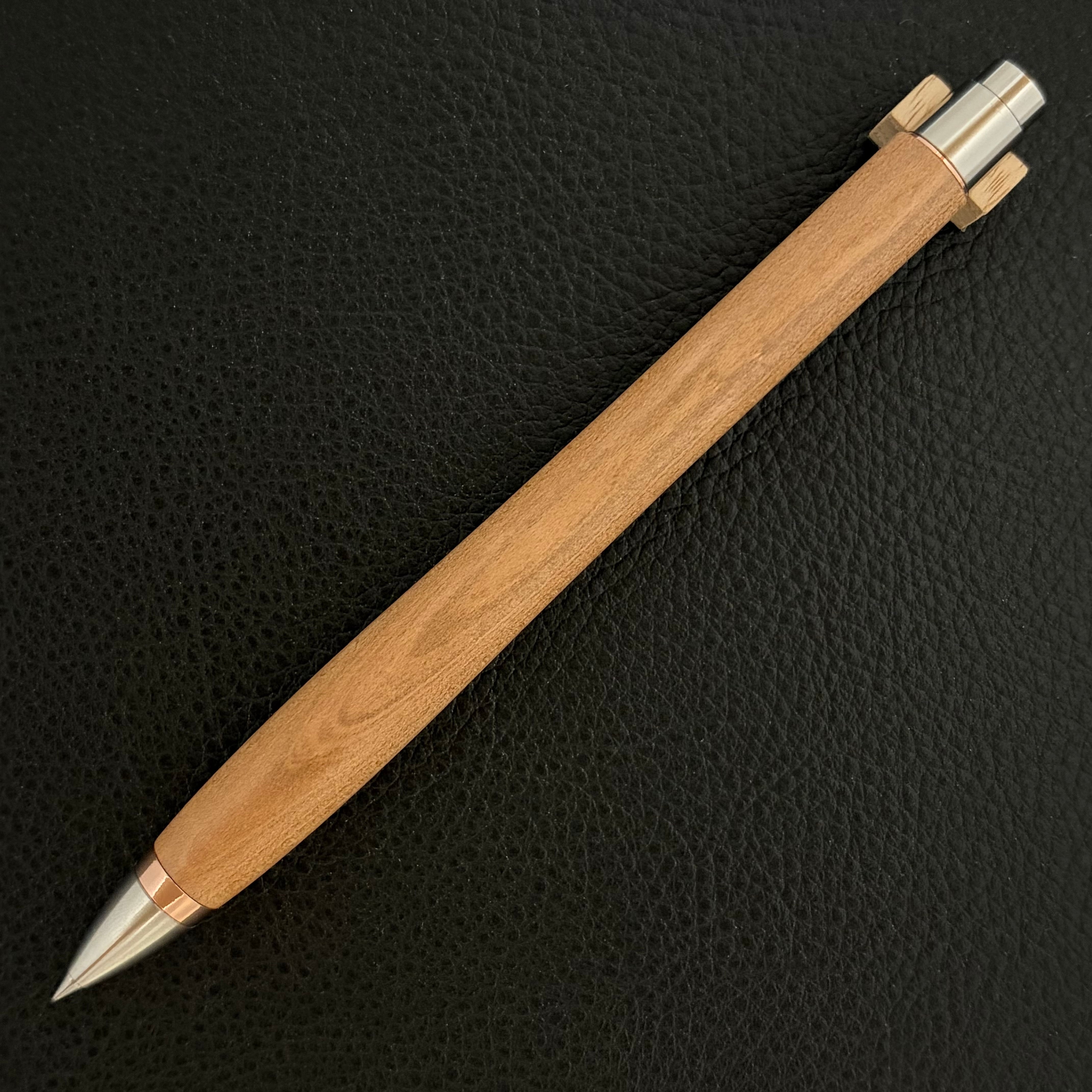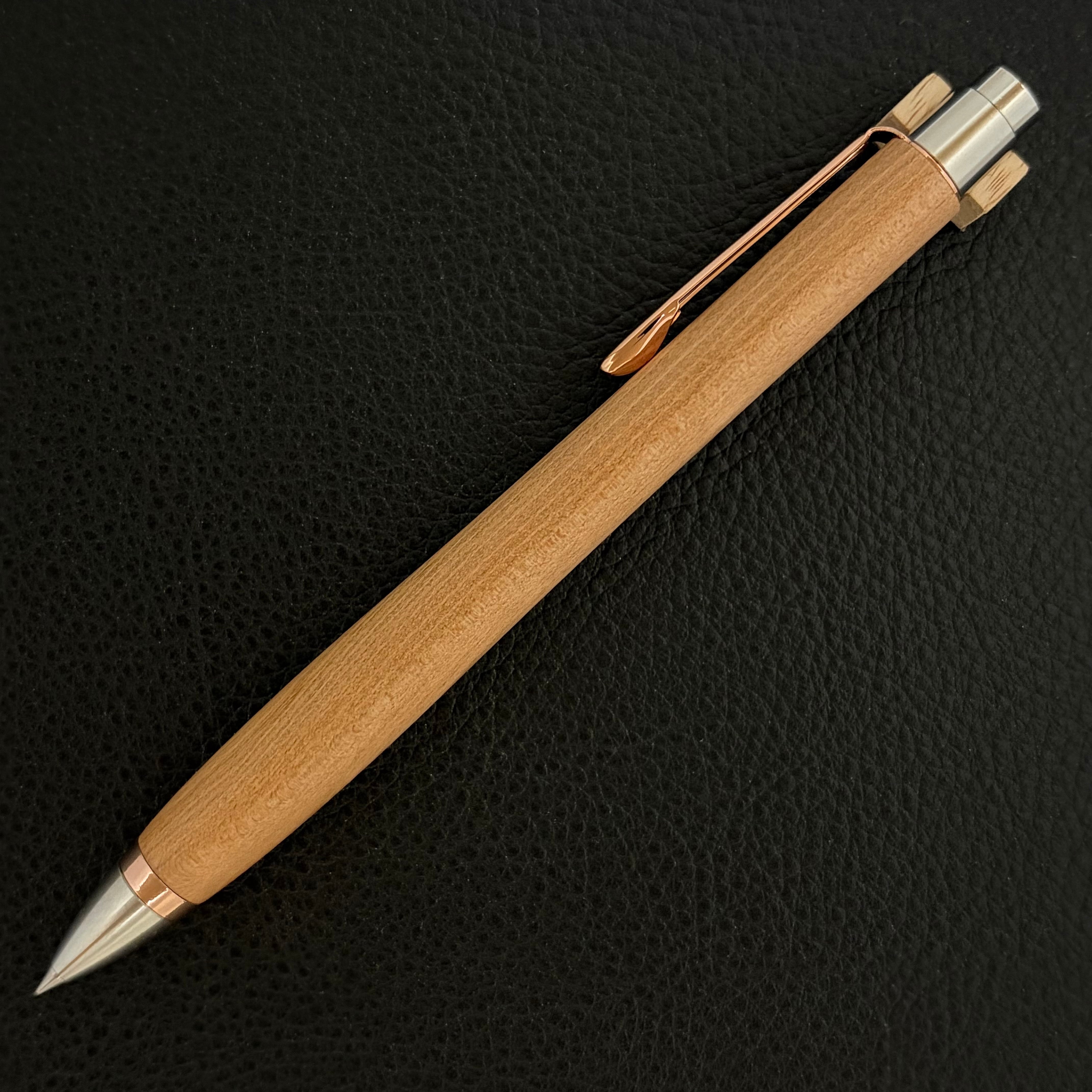ボールペンのノックシステムは、ドイツ最高のクリックメカニズムを採用してあります。このメカニズムはユニークな機構のため、クリックしたときのカチカチ音が静かで、どんな場所でも気兼ねなく使うことができます。滑らかに動くこのプッシュ感覚を一度味わうと他には戻れなくなってしまうほどの魅力があります。 100分の1単位の加工精度で削り出されたペン先は、軸ブレも全くありません。