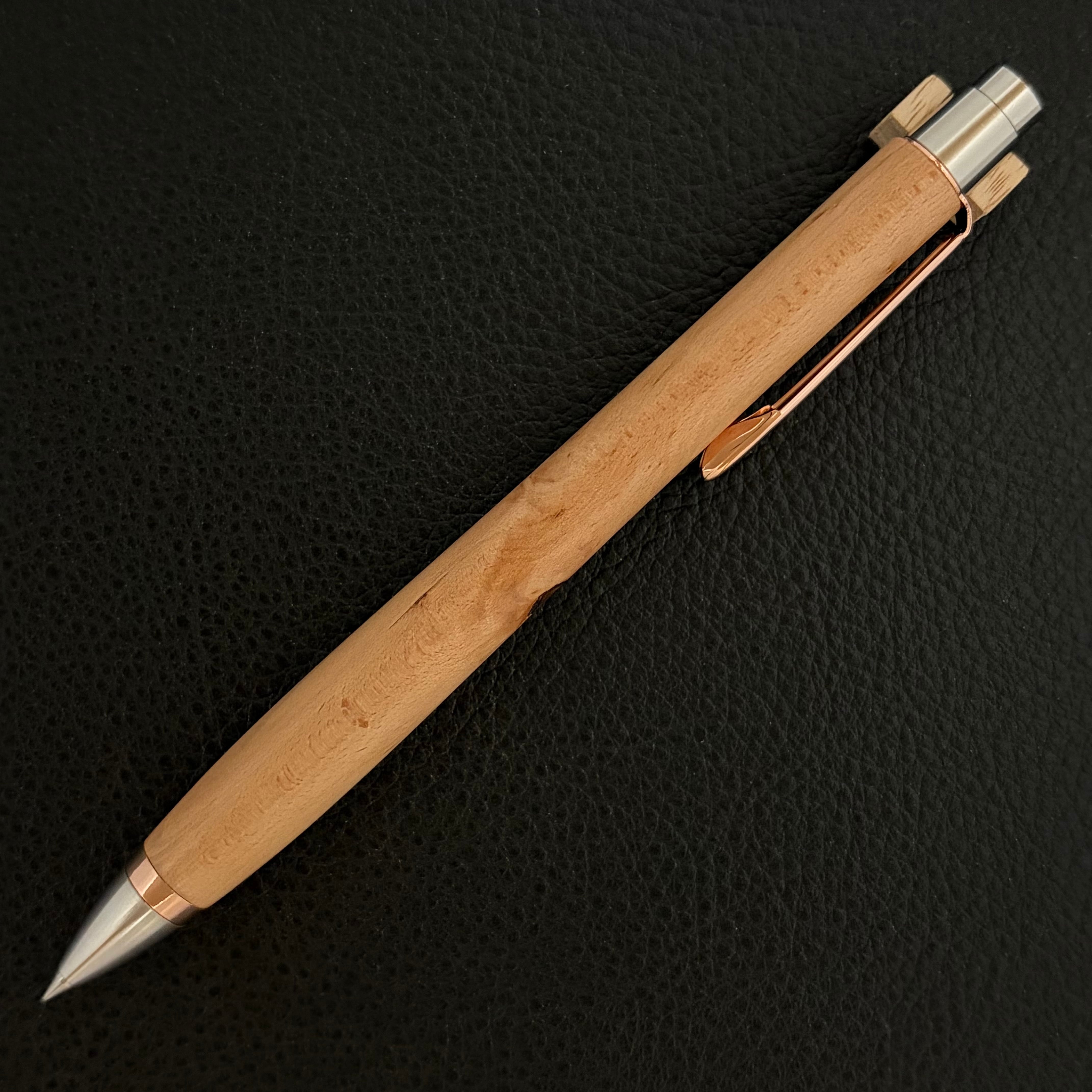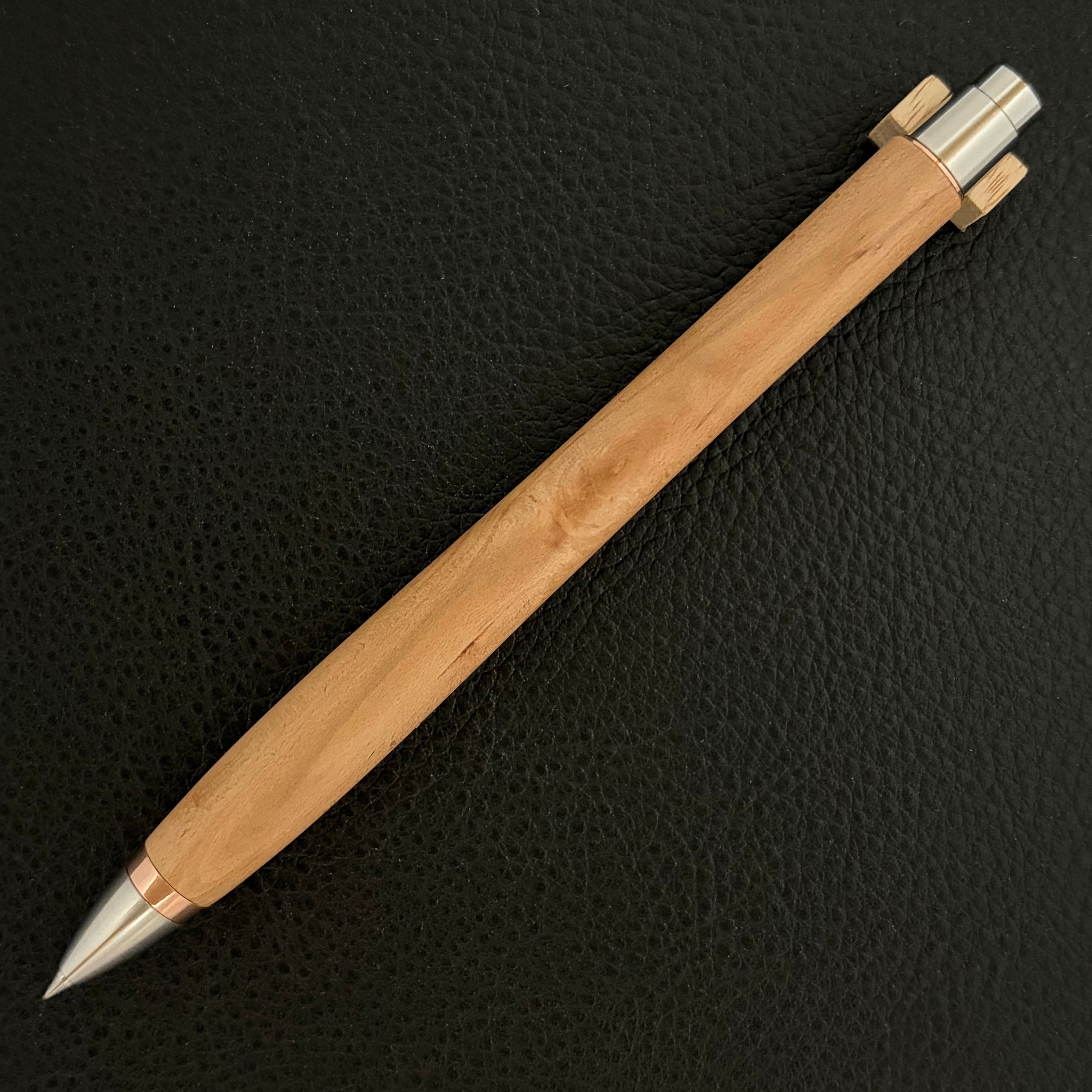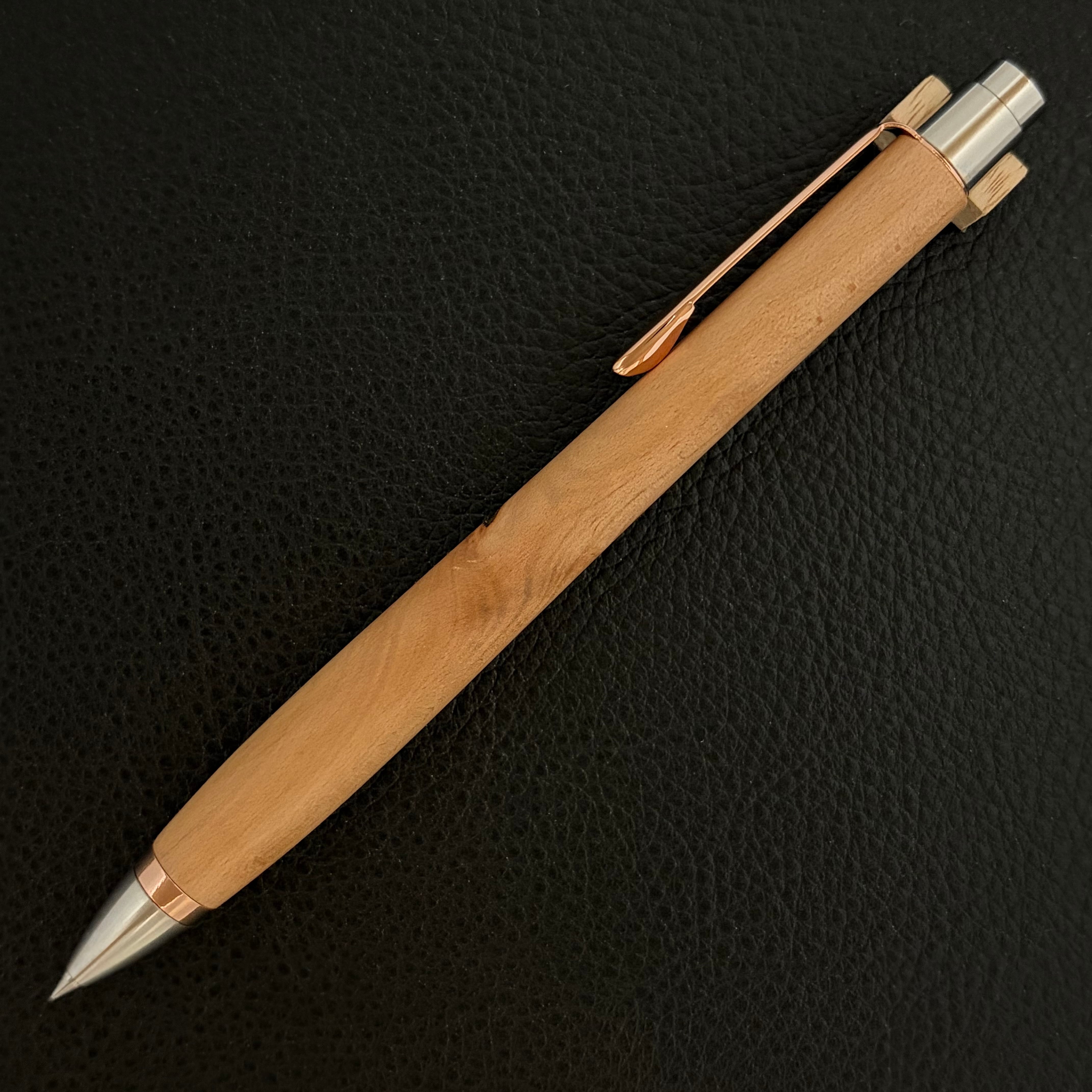 ボールペンのノックシステムは、ドイツ最高のクリックメカニズムを採用してあります。このメカニズムはユニークな機構のため、クリックしたときのカチカチ音が静かで、どんな場所でも気兼ねなく使うことができます。滑らかに動くこのプッシュ感覚を一度味わうと他には戻れなくなってしまうほどの魅力があります。 100分の1単位の加工精度で削り出されたペン先は、軸ブレも全くありません。