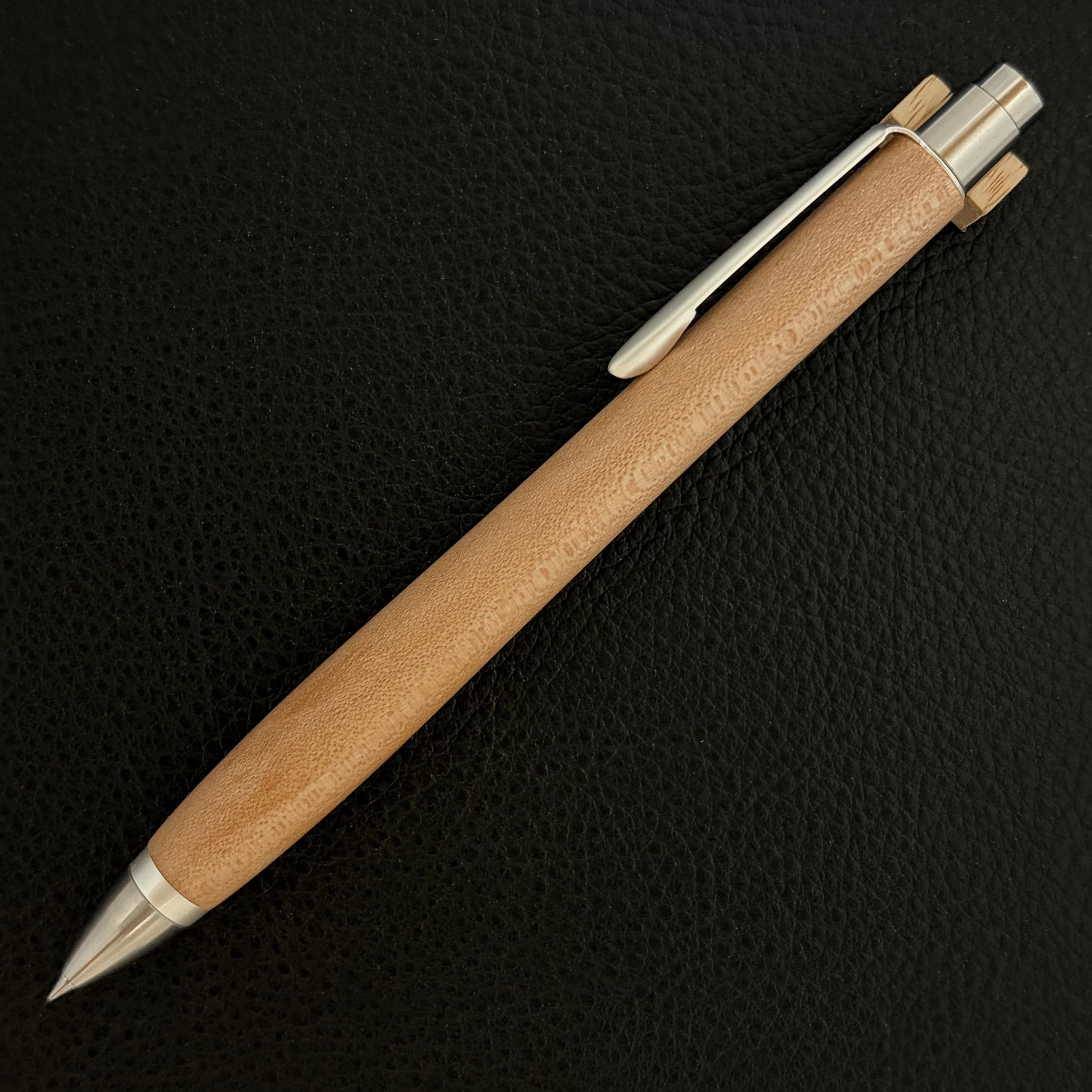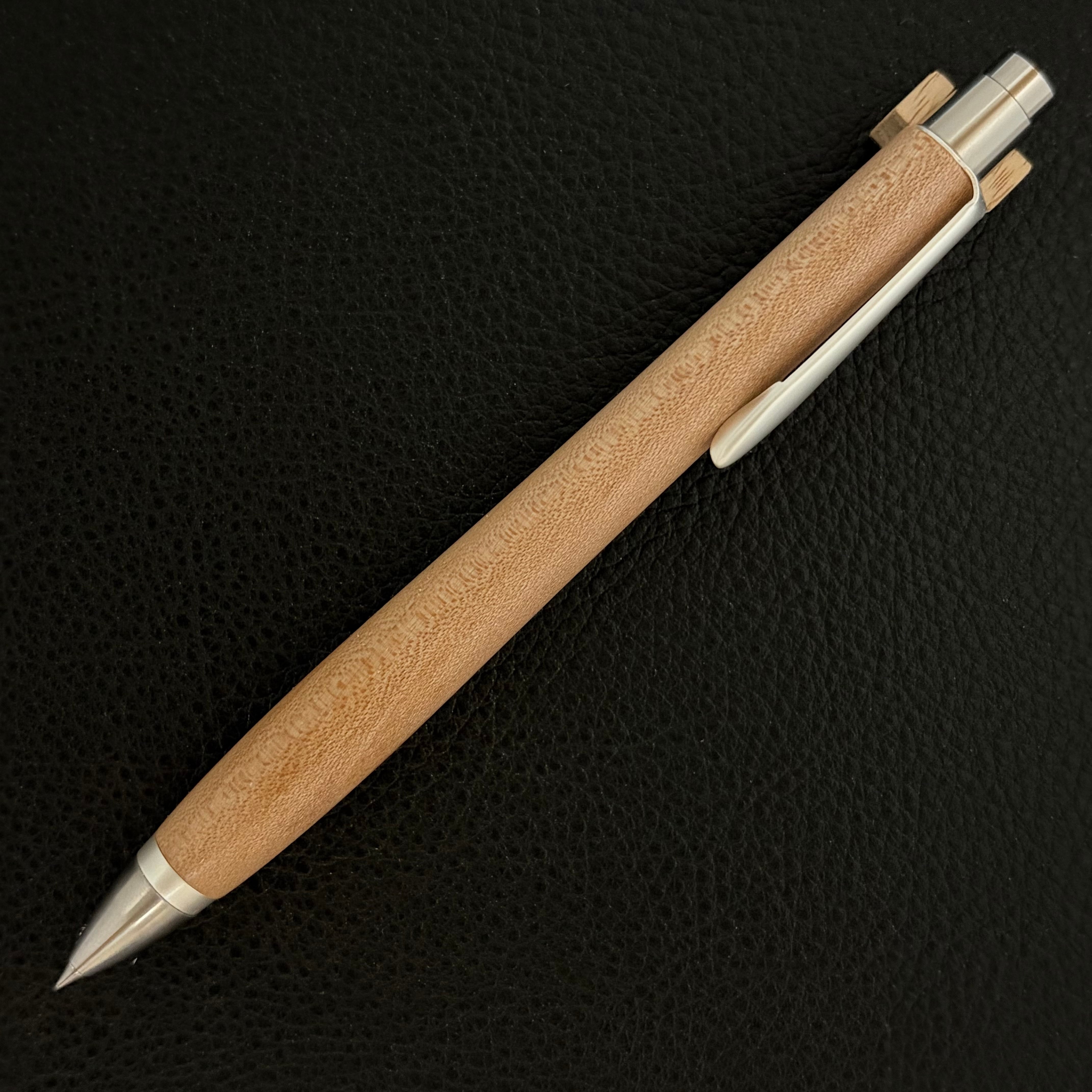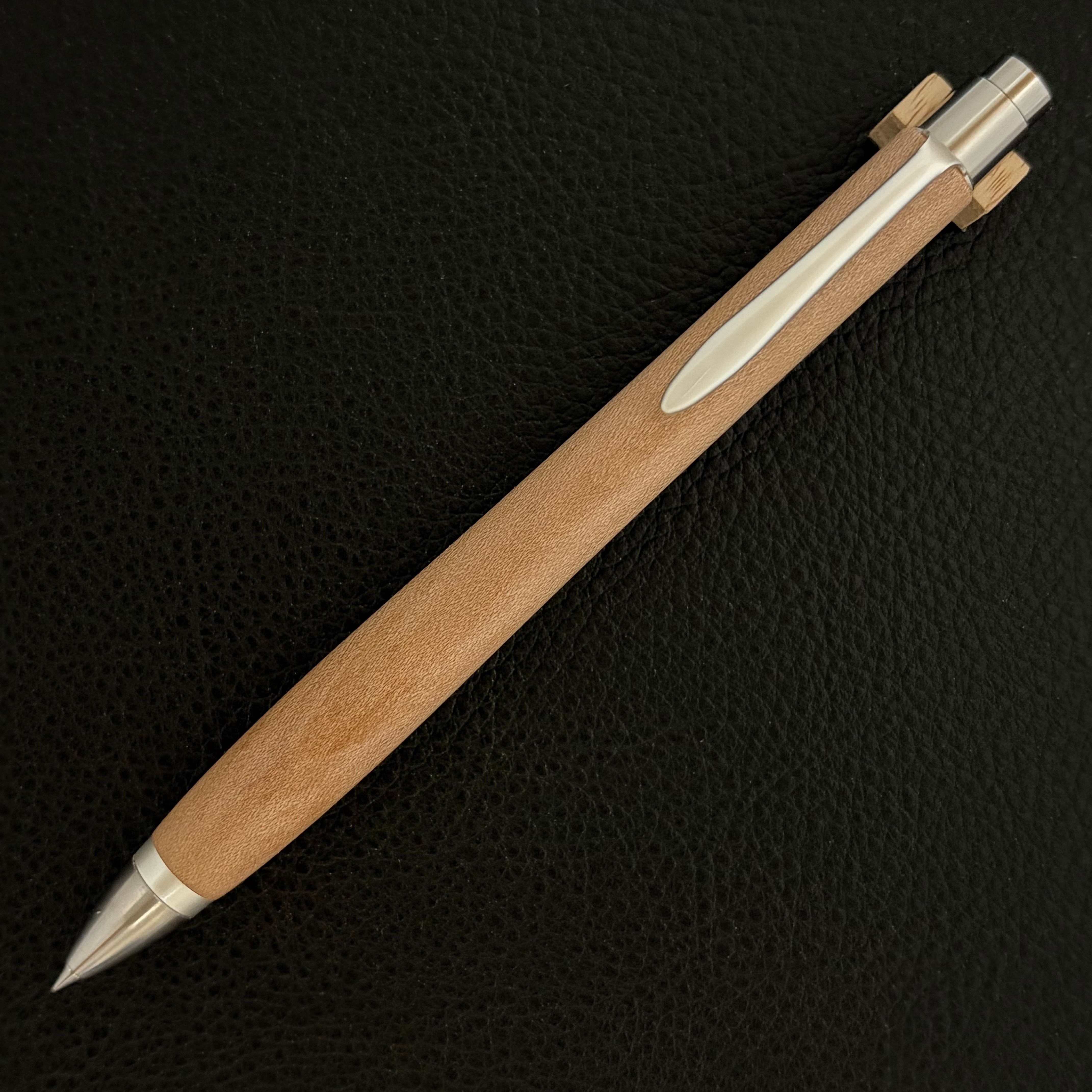 ボールペンのノックシステムは、ドイツ最高のクリックメカニズムを採用してあります。このメカニズムはユニークな機構のため、クリックしたときのカチカチ音が静かで、どんな場所でも気兼ねなく使うことができます。滑らかに動くこのプッシュ感覚を一度味わうと他には戻れなくなってしまうほどの魅力があります。 100分の1単位の加工精度で削り出されたペン先は、軸ブレも全くありません。