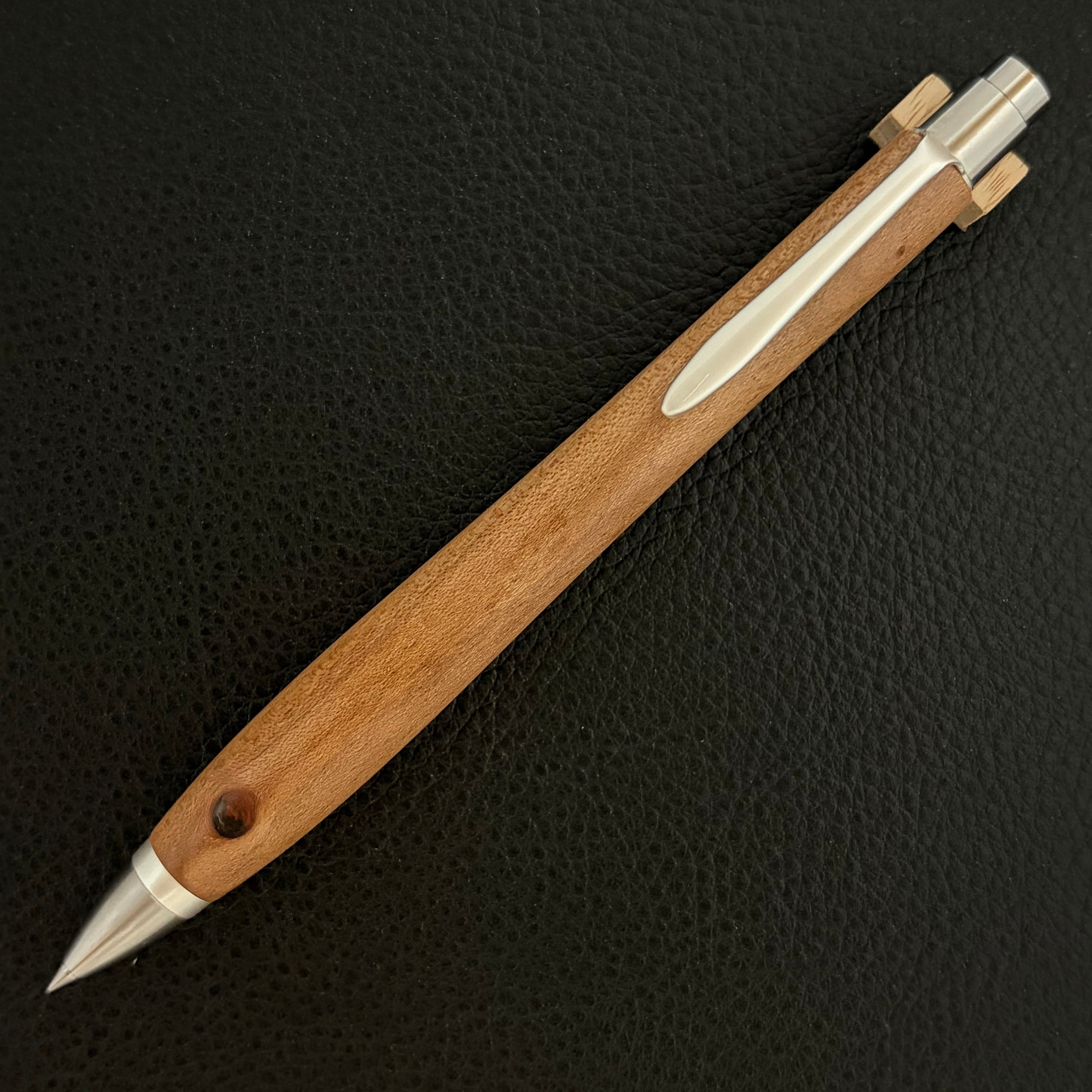 ボールペンのノックシステムは、ドイツ最高のクリックメカニズムを採用してあります。このメカニズムはユニークな機構のため、クリックしたときのカチカチ音が静かで、どんな場所でも気兼ねなく使うことができます。滑らかに動くこのプッシュ感覚を一度味わうと他には戻れなくなってしまうほどの魅力があります。 100分の1単位の加工精度で削り出されたペン先は、軸ブレも全くありません。