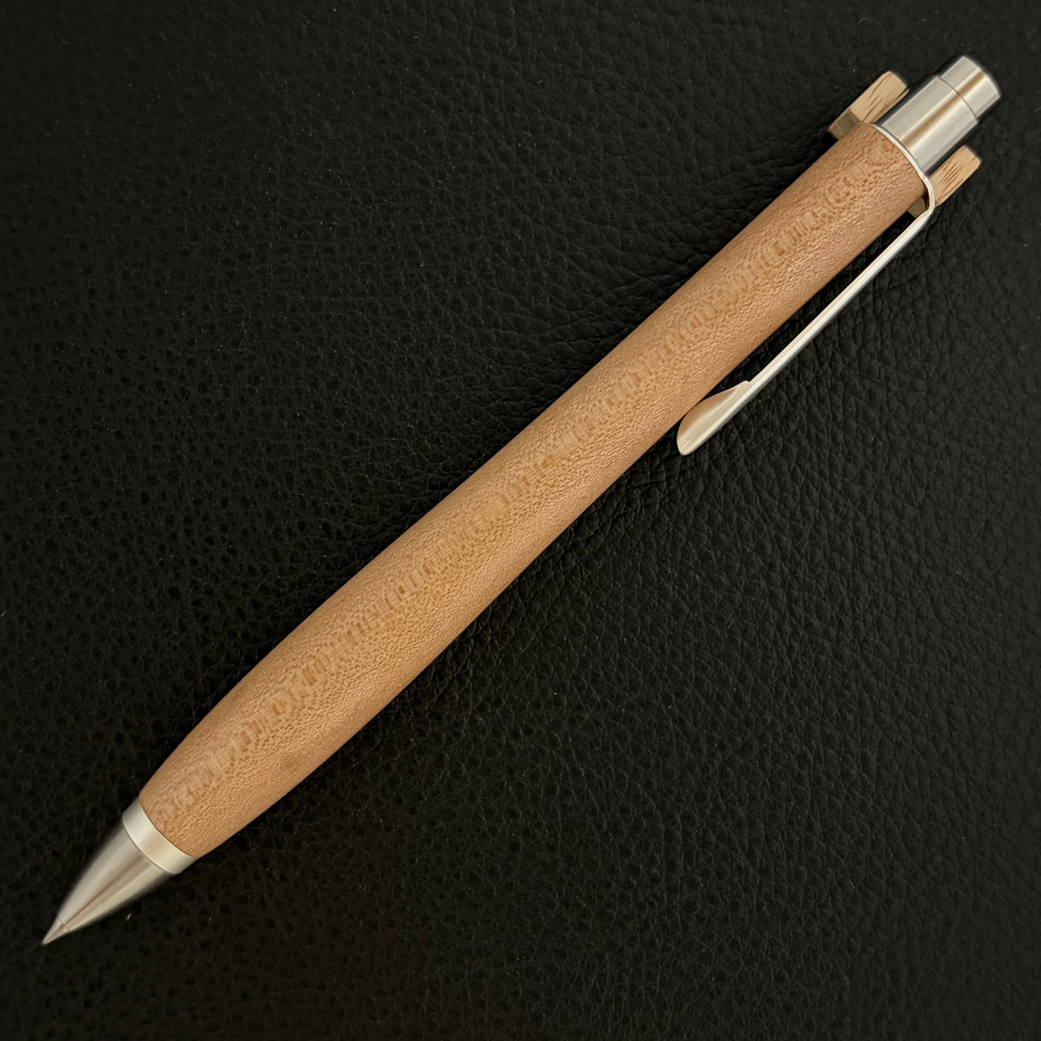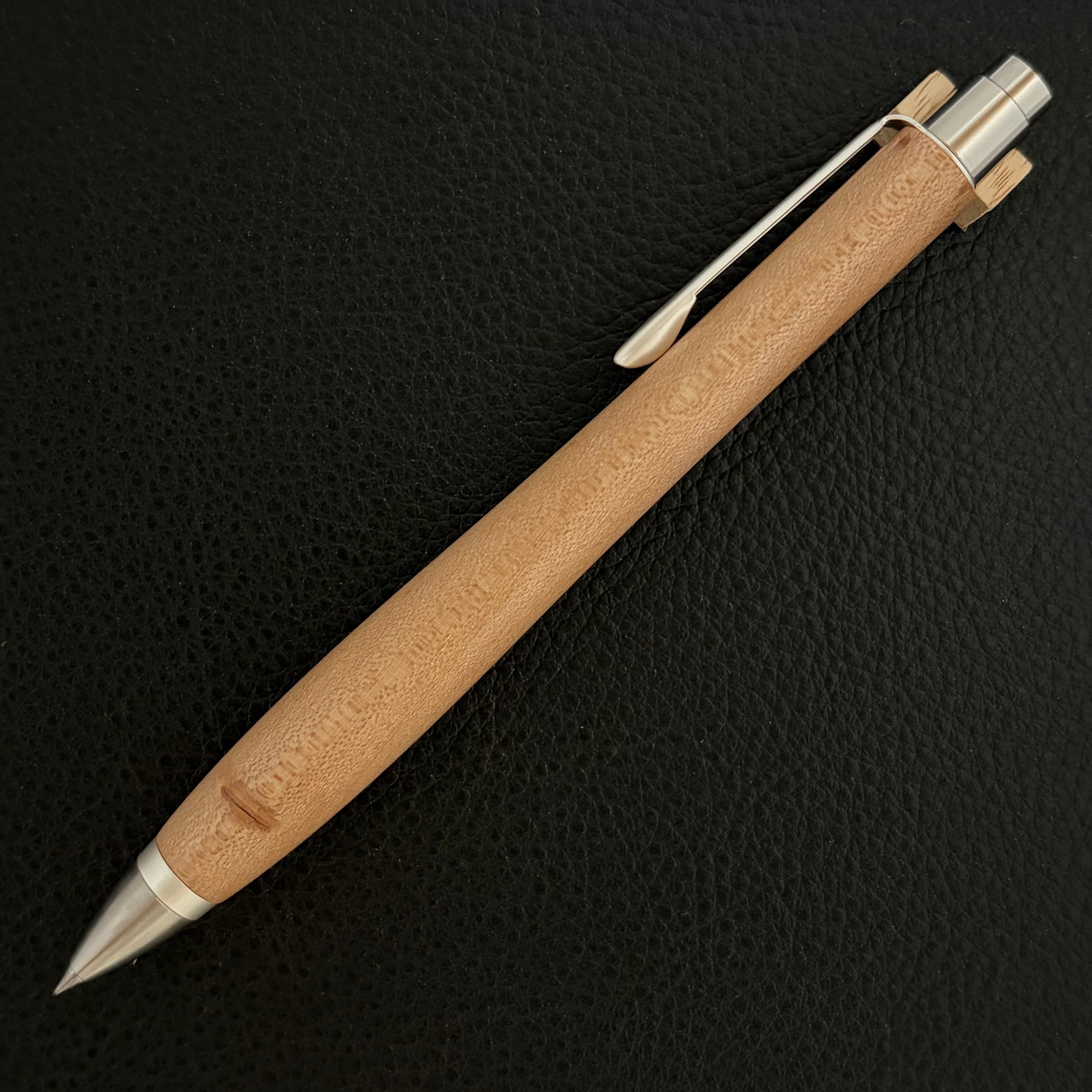 ボールペンのノックシステムは、ドイツ最高のクリックメカニズムを採用してあります。このメカニズムはユニークな機構のため、クリックしたときのカチカチ音が静かで、どんな場所でも気兼ねなく使うことができます。滑らかに動くこのプッシュ感覚を一度味わうと他には戻れなくなってしまうほどの魅力があります。 100分の1単位の加工精度で削り出されたペン先は、軸ブレも全くありません。