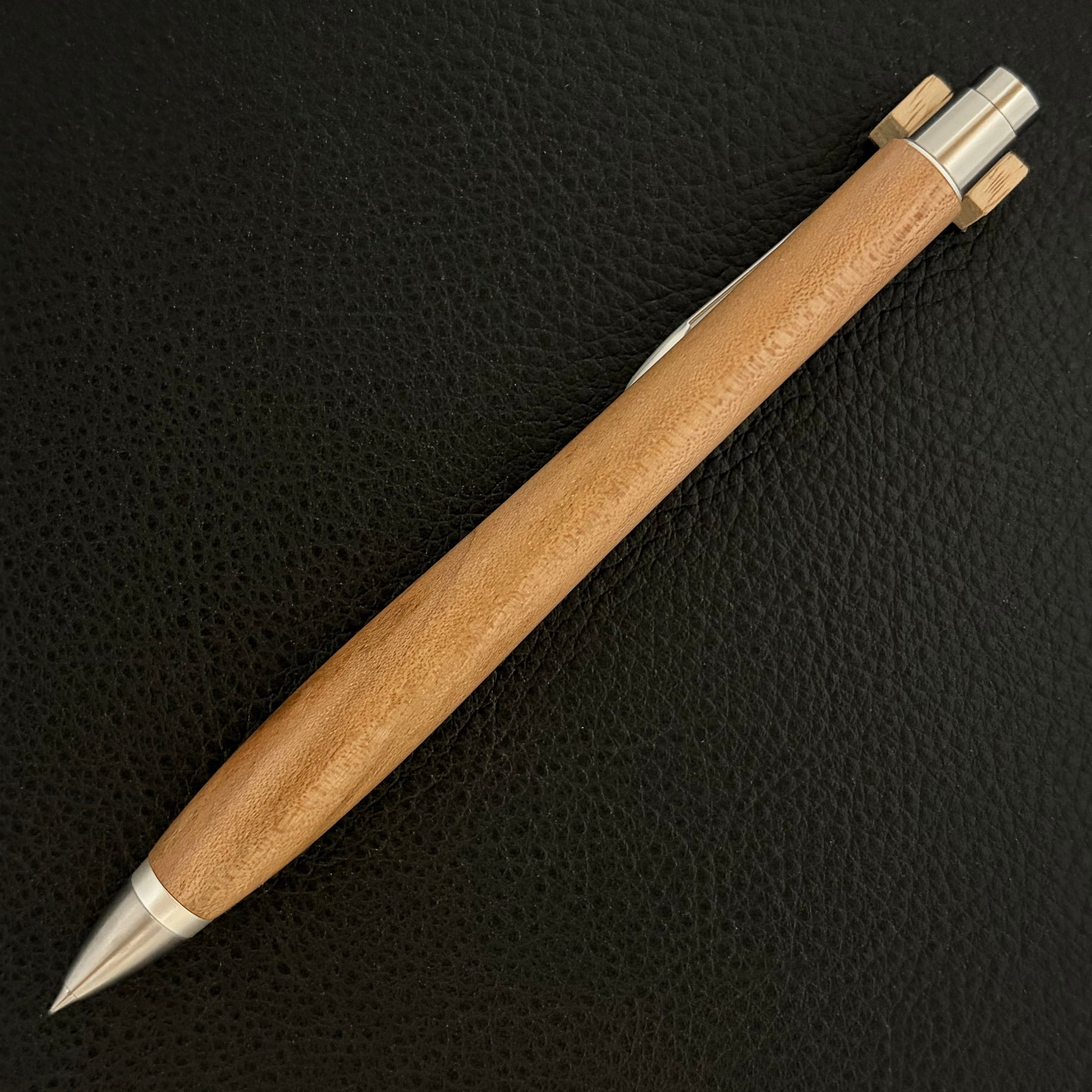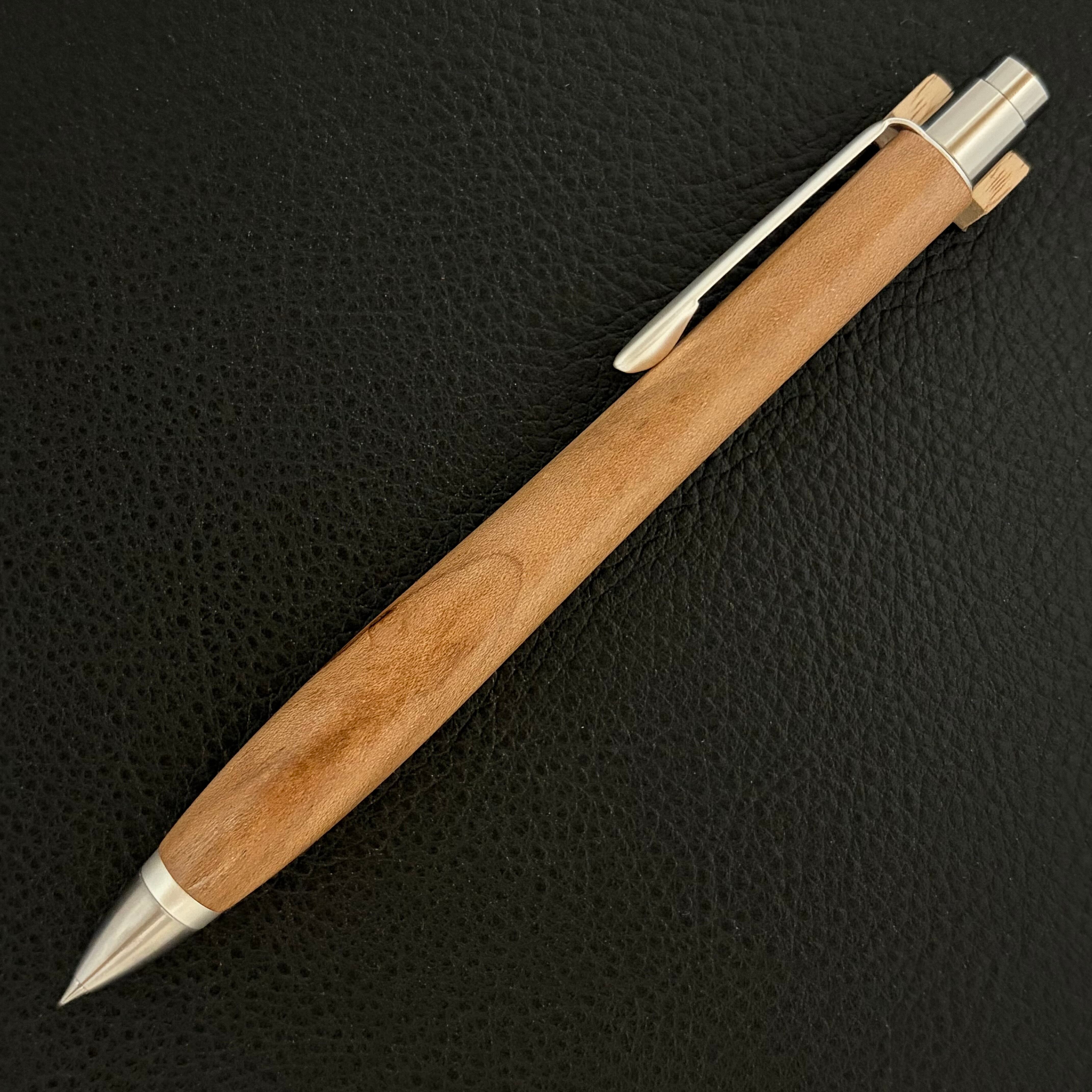 ボールペンのノックシステムは、ドイツ最高のクリックメカニズムを採用してあります。このメカニズムはユニークな機構のため、クリックしたときのカチカチ音が静かで、どんな場所でも気兼ねなく使うことができます。滑らかに動くこのプッシュ感覚を一度味わうと他には戻れなくなってしまうほどの魅力があります。 100分の1単位の加工精度で削り出されたペン先は、軸ブレも全くありません。