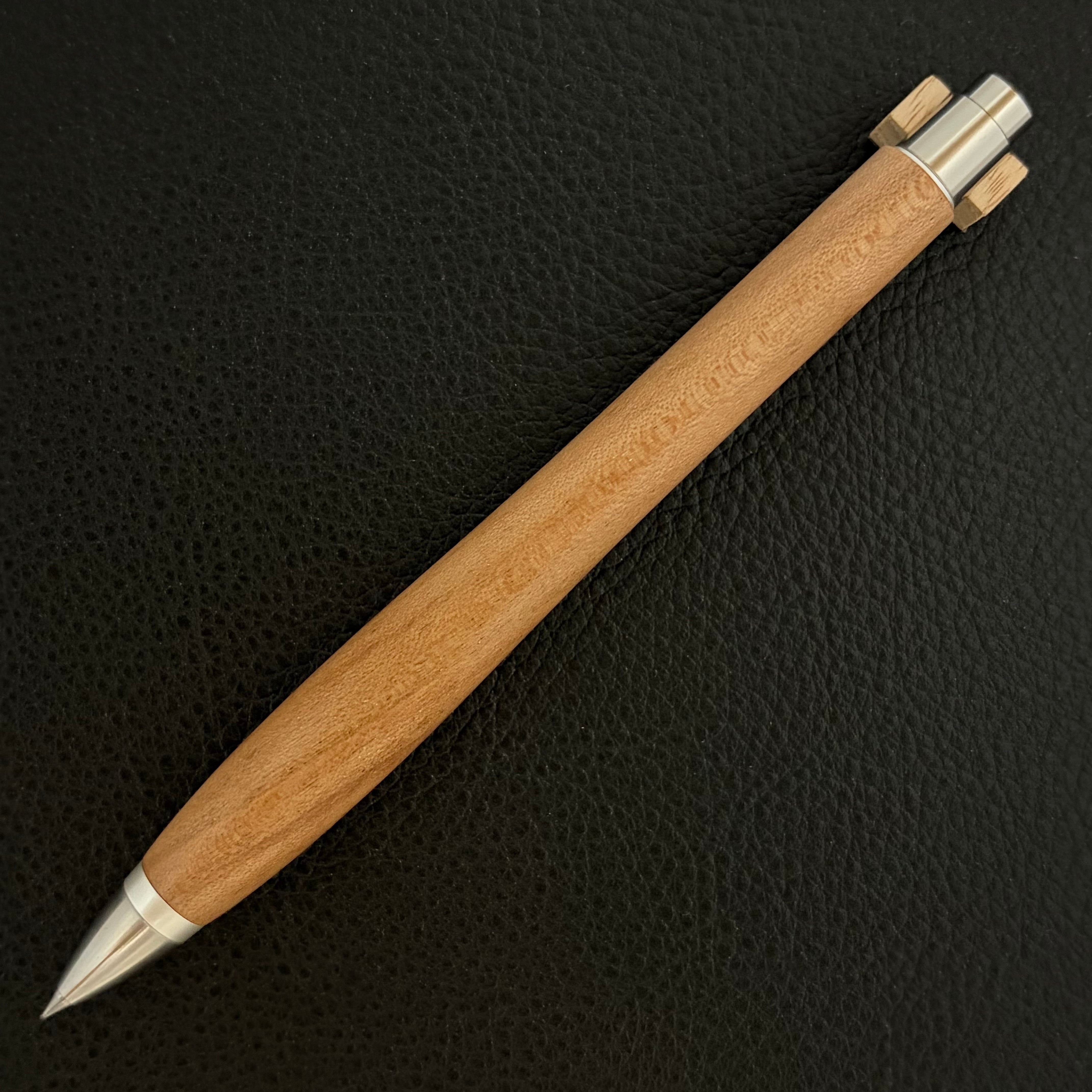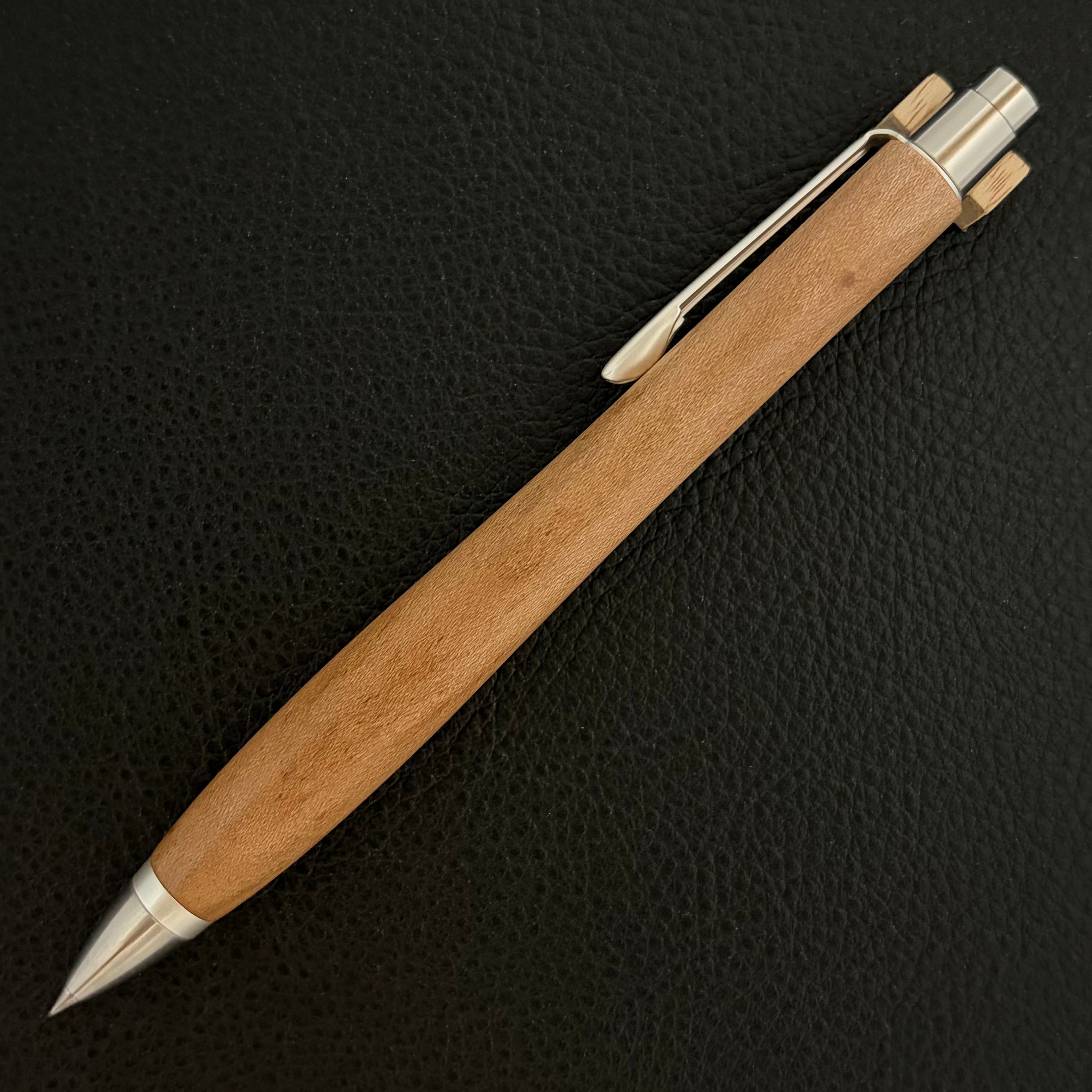 ボールペンのノックシステムは、ドイツ最高のクリックメカニズムを採用してあります。このメカニズムはユニークな機構のため、クリックしたときのカチカチ音が静かで、どんな場所でも気兼ねなく使うことができます。滑らかに動くこのプッシュ感覚を一度味わうと他には戻れなくなってしまうほどの魅力があります。 100分の1単位の加工精度で削り出されたペン先は、軸ブレも全くありません。