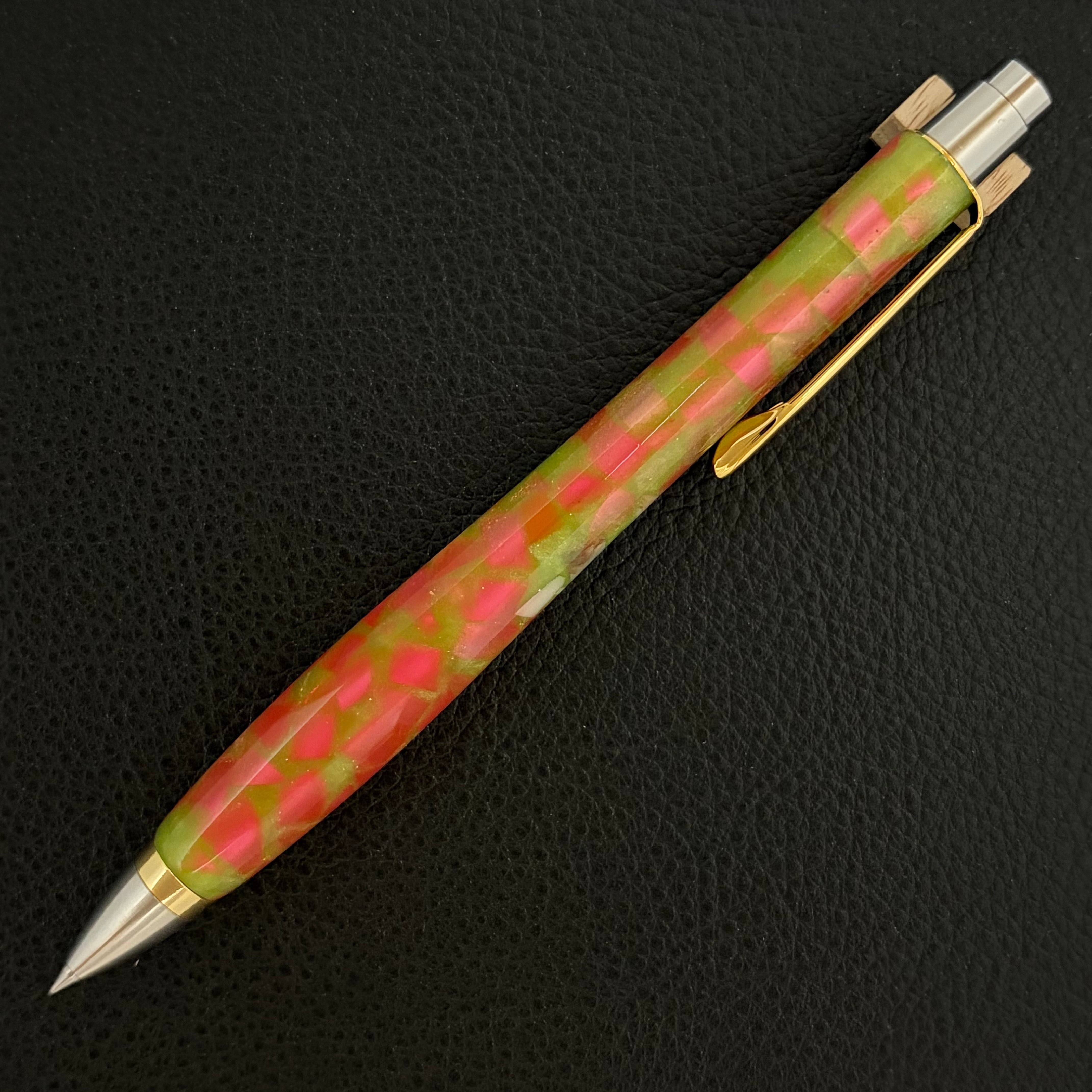 ボールペンのノックシステムは、ドイツ最高のクリックメカニズムを採用してあります。このメカニズムはユニークな機構のため、クリックしたときのカチカチ音が静かで、どんな場所でも気兼ねなく使うことができます。滑らかに動くこのプッシュ感覚を一度味わうと他には戻れなくなってしまうほどの魅力があります。 100分の1単位の加工精度で削り出されたペン先は、軸ブレも全くありません。