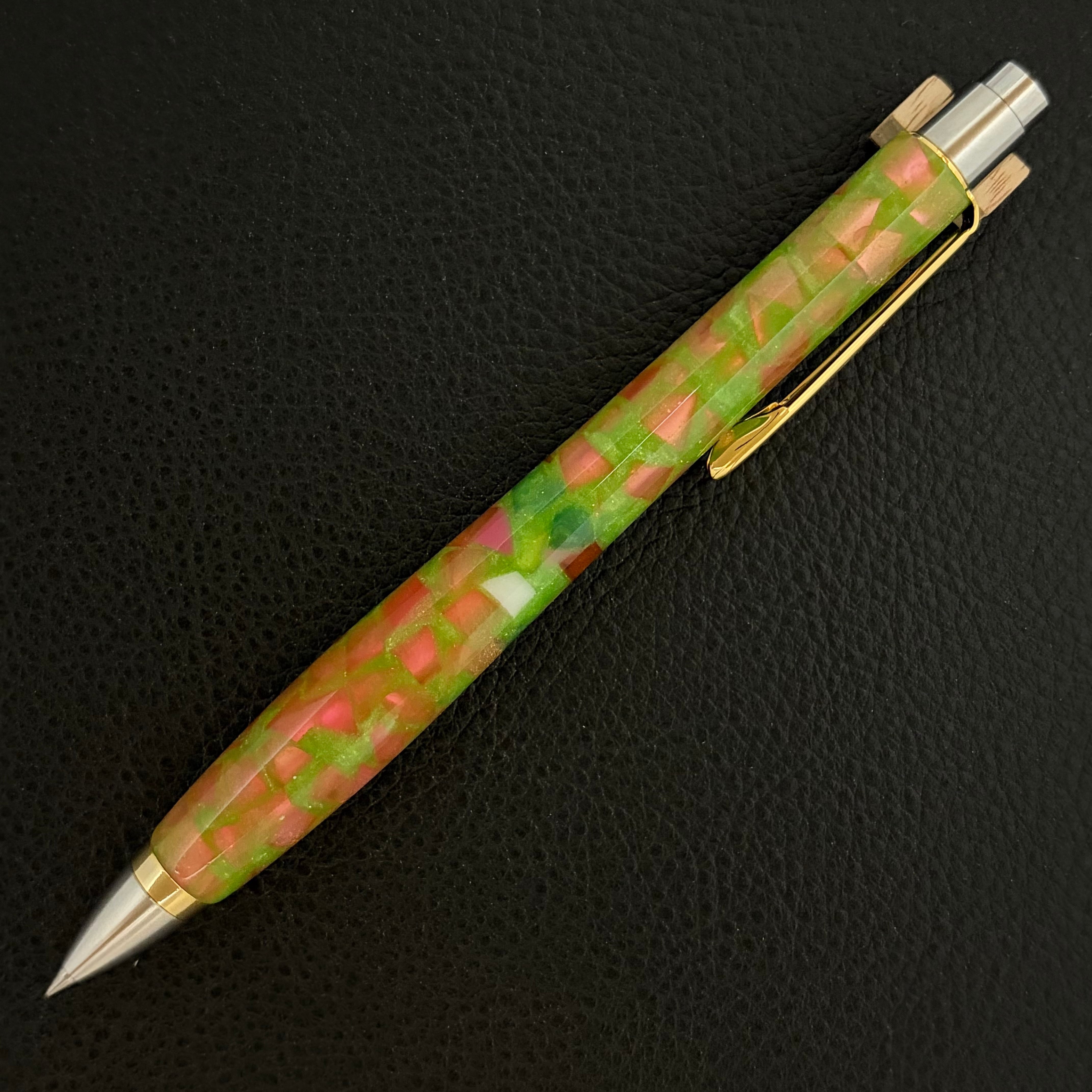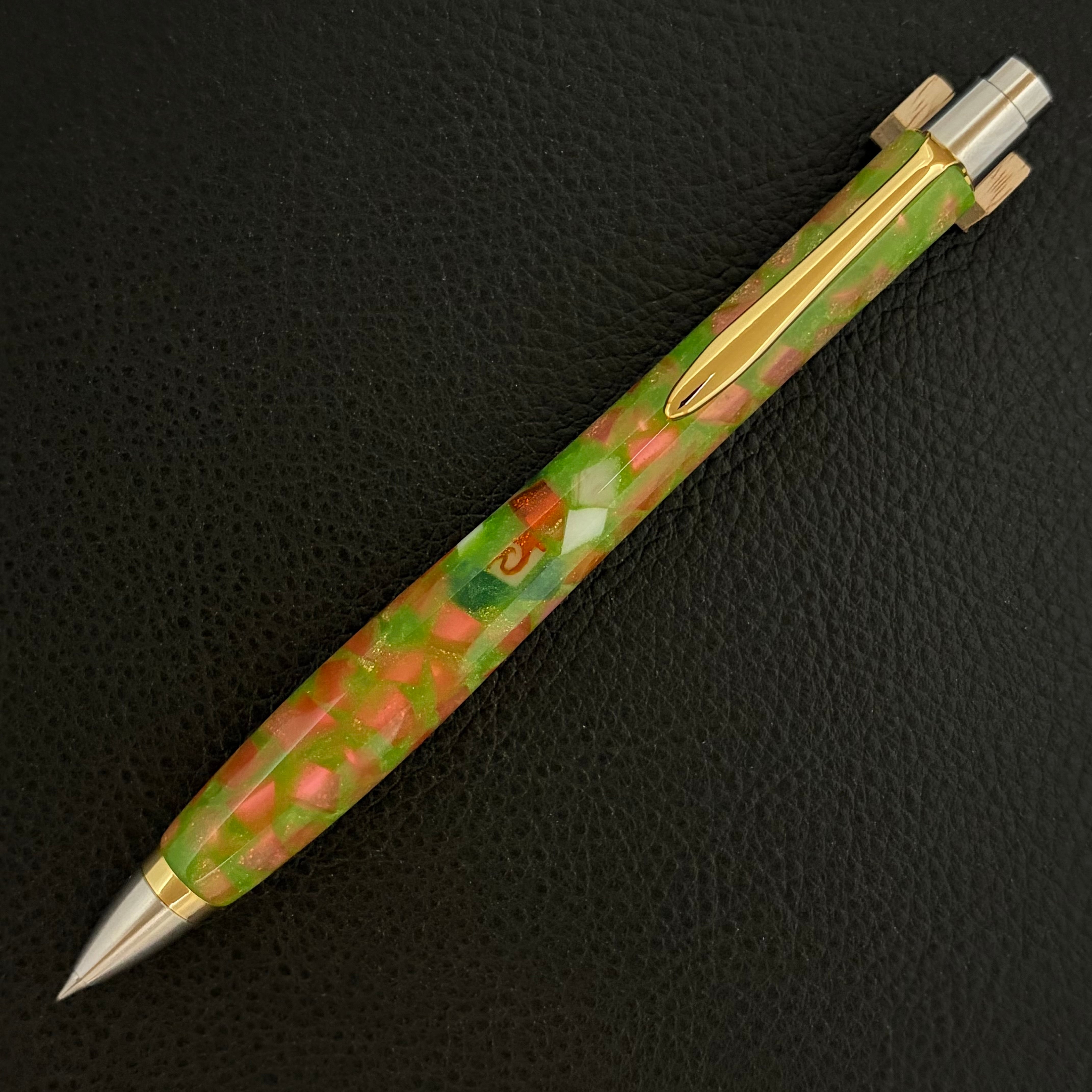 ボールペンのノックシステムは、ドイツ最高のクリックメカニズムを採用してあります。このメカニズムはユニークな機構のため、クリックしたときのカチカチ音が静かで、どんな場所でも気兼ねなく使うことができます。滑らかに動くこのプッシュ感覚を一度味わうと他には戻れなくなってしまうほどの魅力があります。 100分の1単位の加工精度で削り出されたペン先は、軸ブレも全くありません。