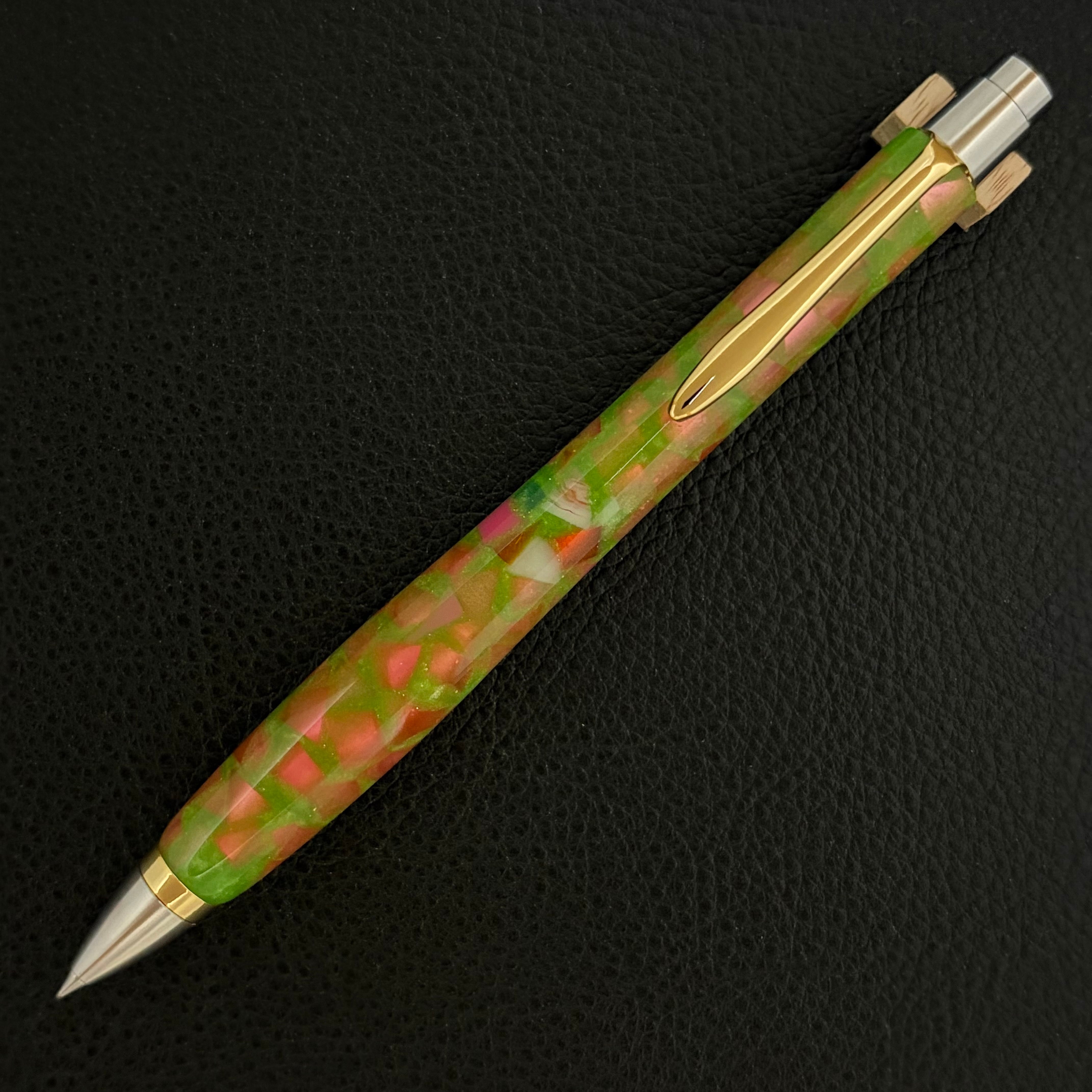 ボールペンのノックシステムは、ドイツ最高のクリックメカニズムを採用してあります。このメカニズムはユニークな機構のため、クリックしたときのカチカチ音が静かで、どんな場所でも気兼ねなく使うことができます。滑らかに動くこのプッシュ感覚を一度味わうと他には戻れなくなってしまうほどの魅力があります。 100分の1単位の加工精度で削り出されたペン先は、軸ブレも全くありません。
