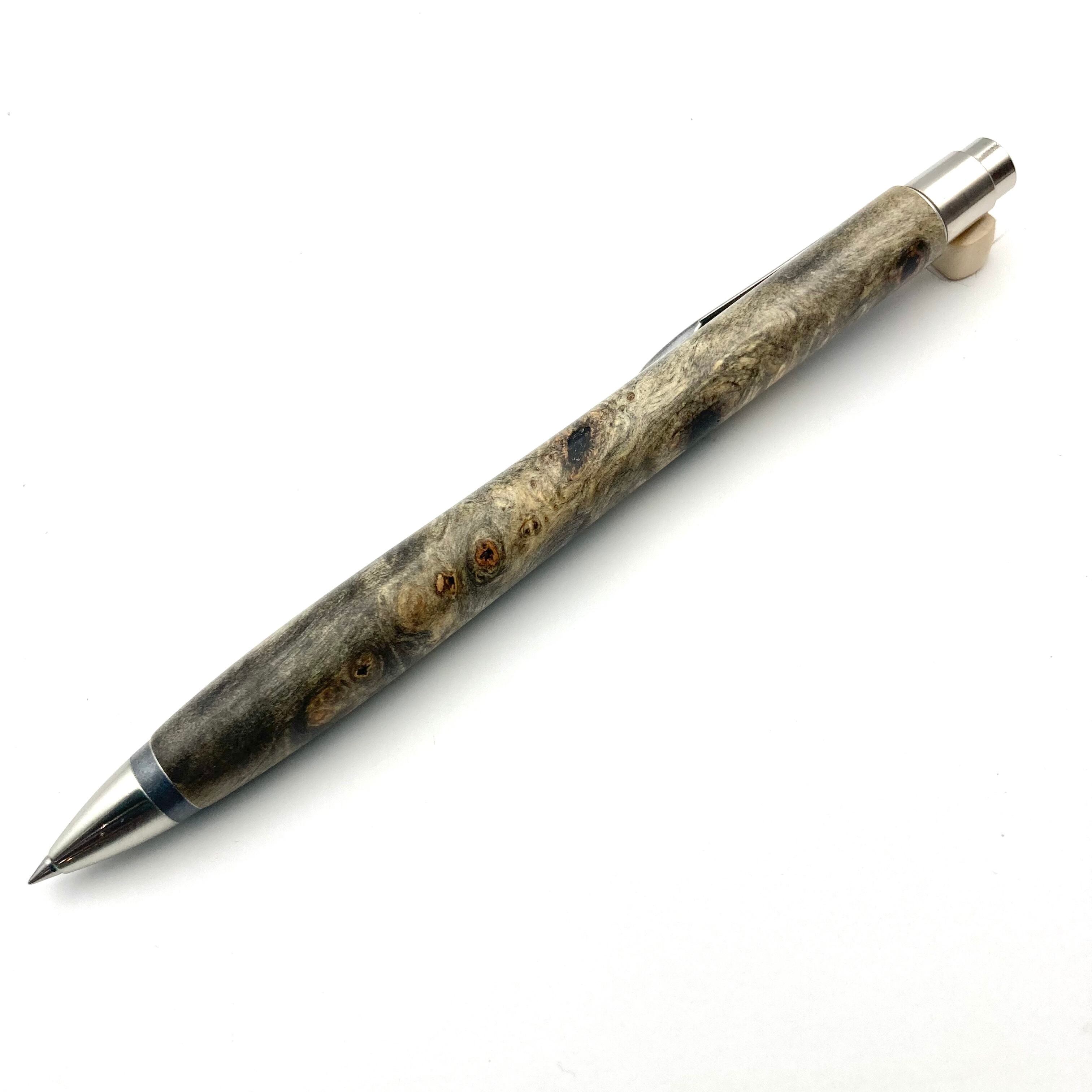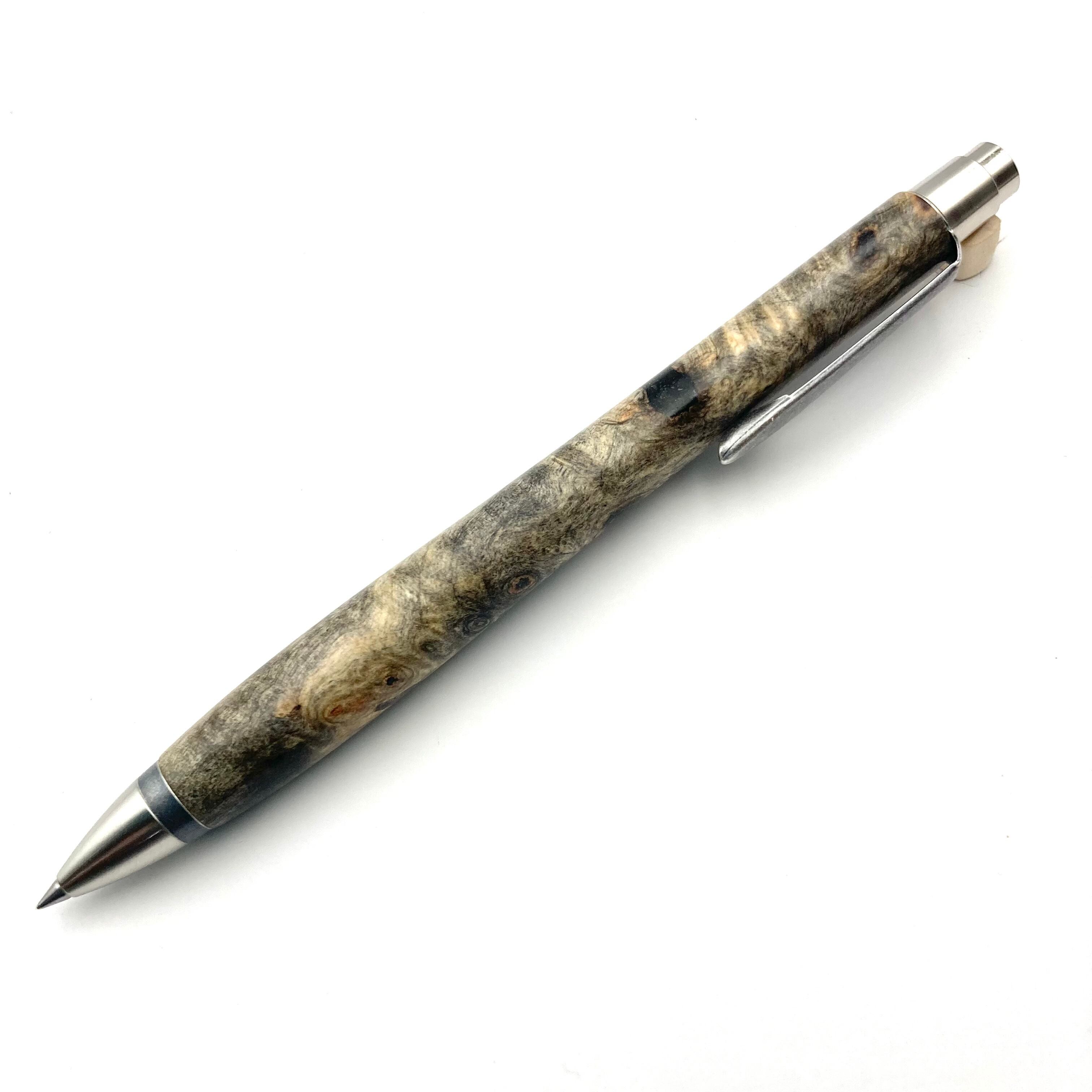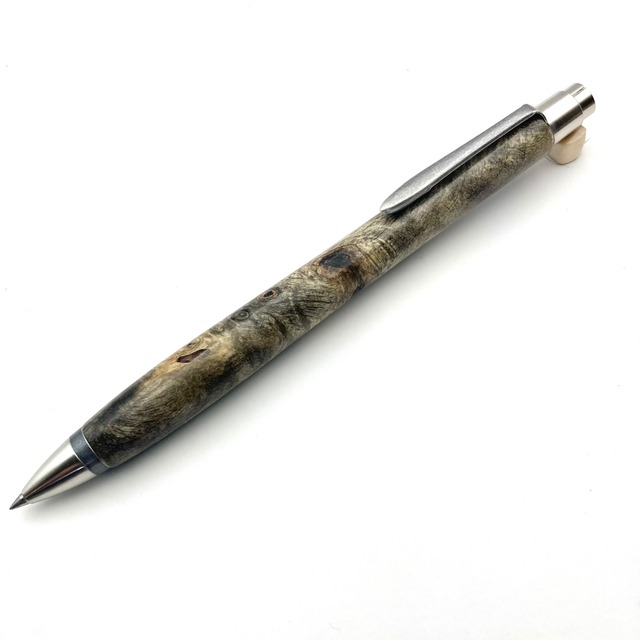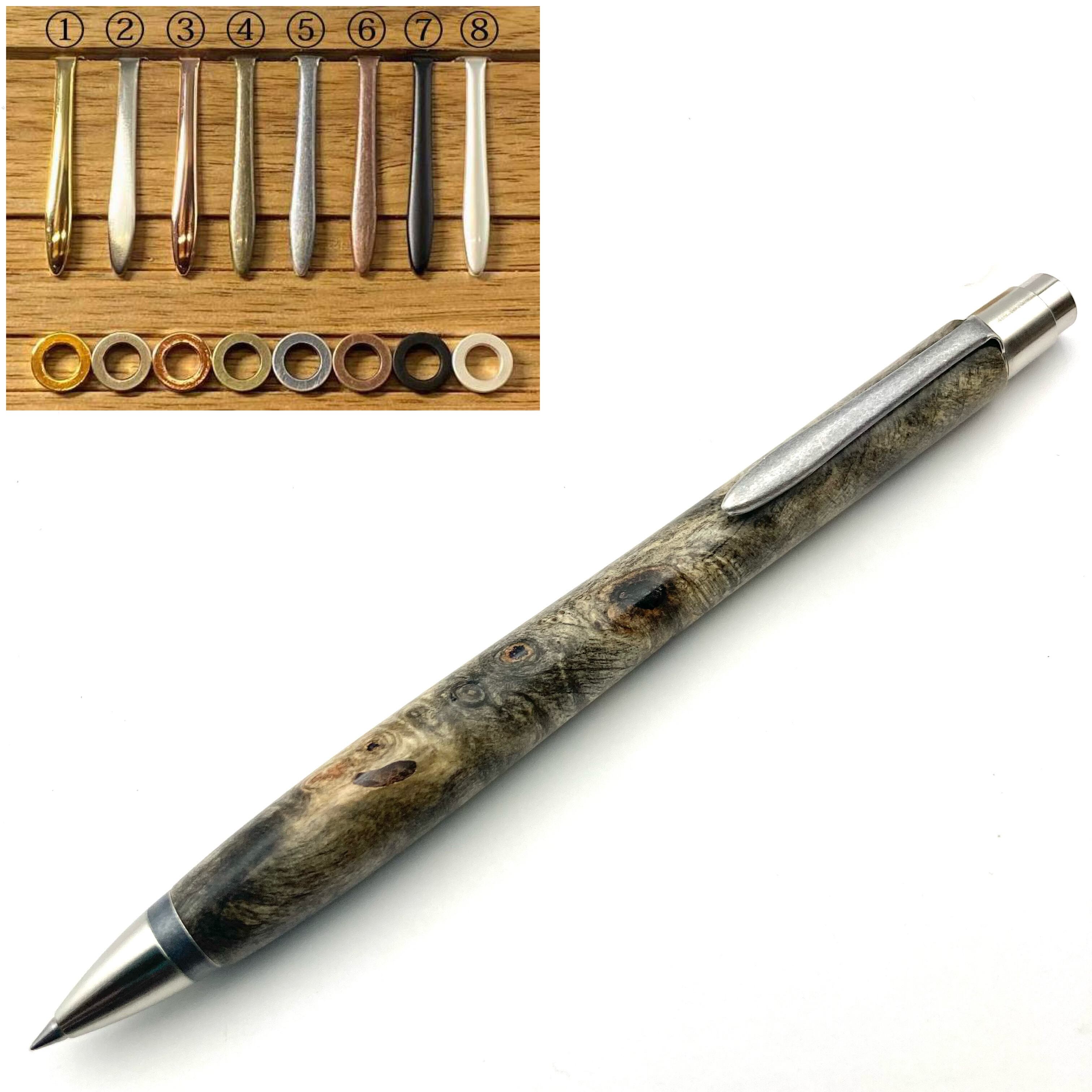 ボールペンのノックシステムは、ドイツ最高のクリックメカニズムを採用してあります。このメカニズムはユニークな機構のため、クリックしたときのカチカチ音が静かで、どんな場所でも気兼ねなく使うことができます。滑らかに動くこのプッシュ感覚を一度味わうと他には戻れなくなってしまうほどの魅力があります。 100分の1単位の加工精度で削り出されたペン先は、軸ブレも全くありません。