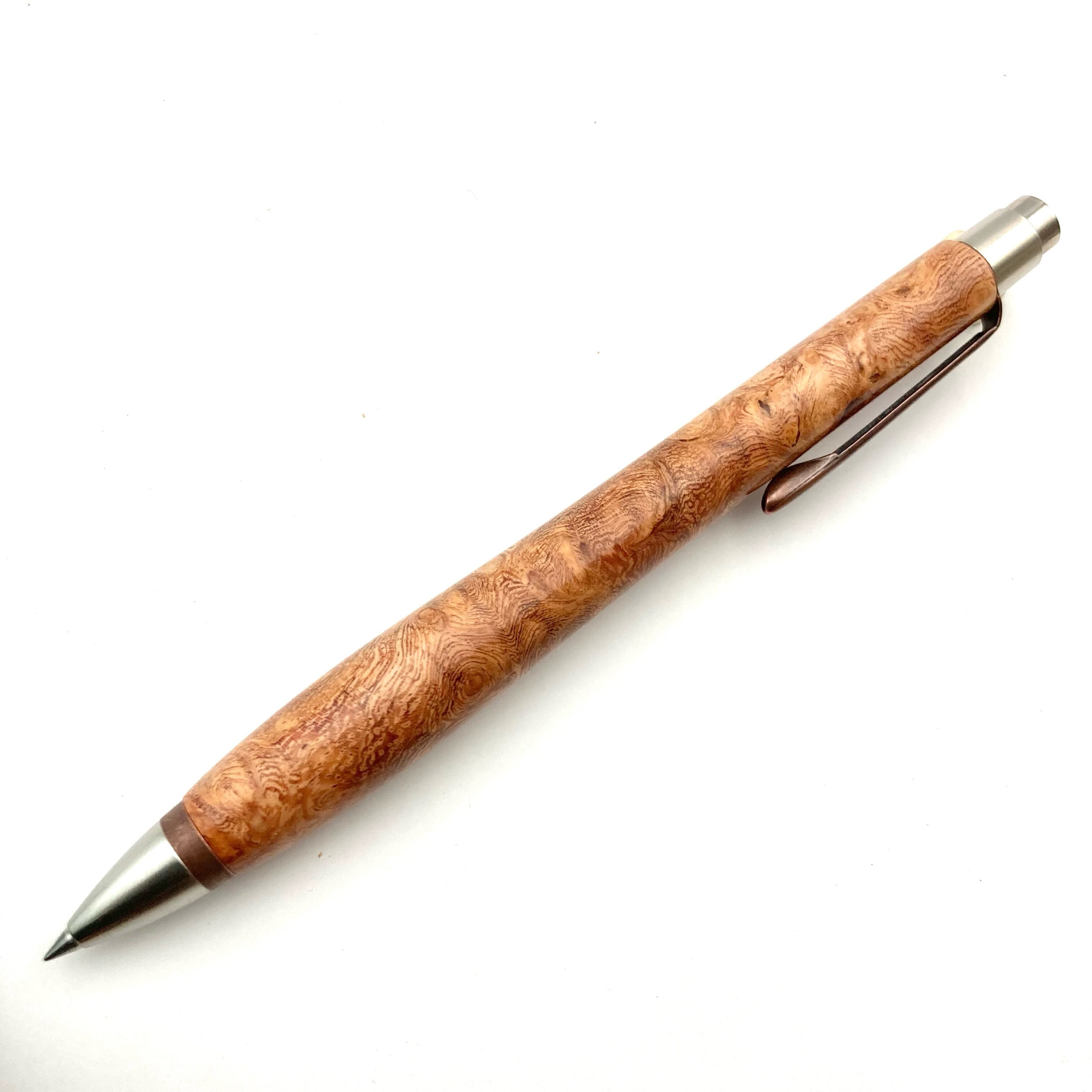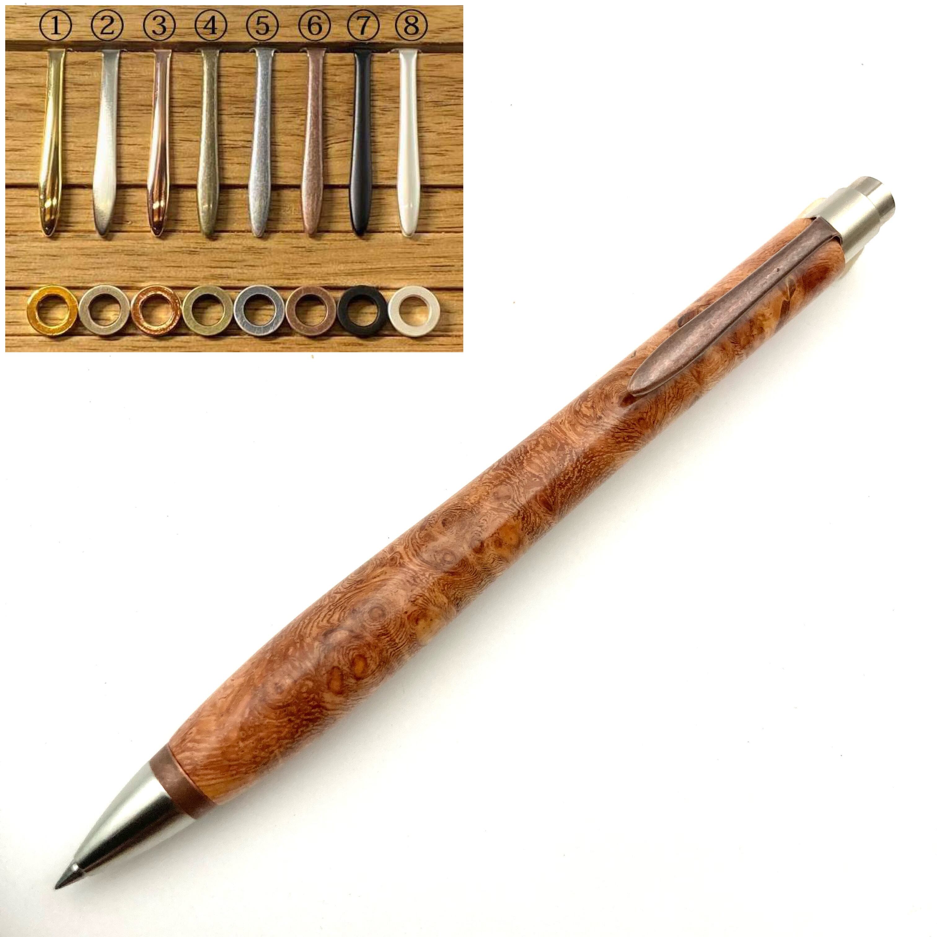 ボールペンのノックシステムは、ドイツ最高のクリックメカニズムを採用してあります。このメカニズムはユニークな機構のため、クリックしたときのカチカチ音が静かで、どんな場所でも気兼ねなく使うことができます。滑らかに動くこのプッシュ感覚を一度味わうと他には戻れなくなってしまうほどの魅力があります。 100分の1単位の加工精度で削り出されたペン先は、軸ブレも全くありません。