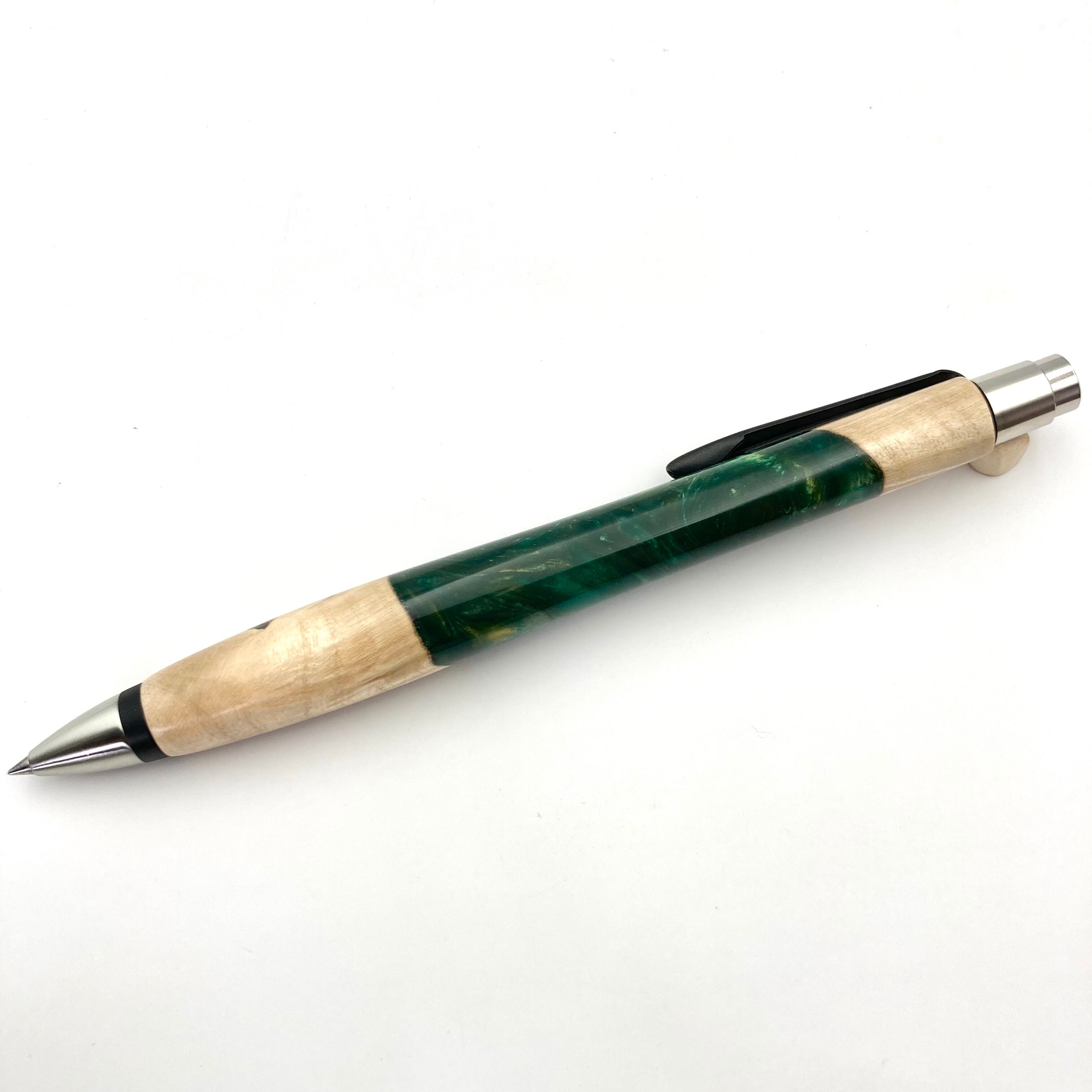 ボールペンのノックシステムは、ドイツ最高のクリックメカニズムを採用してあります。このメカニズムはユニークな機構のため、クリックしたときのカチカチ音が静かで、どんな場所でも気兼ねなく使うことができます。滑らかに動くこのプッシュ感覚を一度味わうと他には戻れなくなってしまうほどの魅力があります。 100分の1単位の加工精度で削り出されたペン先は、軸ブレも全くありません。
