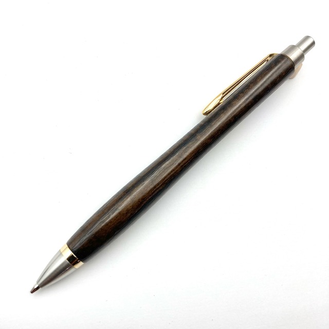 【樹種】大阪の漆塗り職人さんにお願いして、北海道産タモ縮杢に大変希少な国産漆を、何度も塗り重ねて拭き取る(摺り漆)技法で仕上げた黒漆ペンです。
