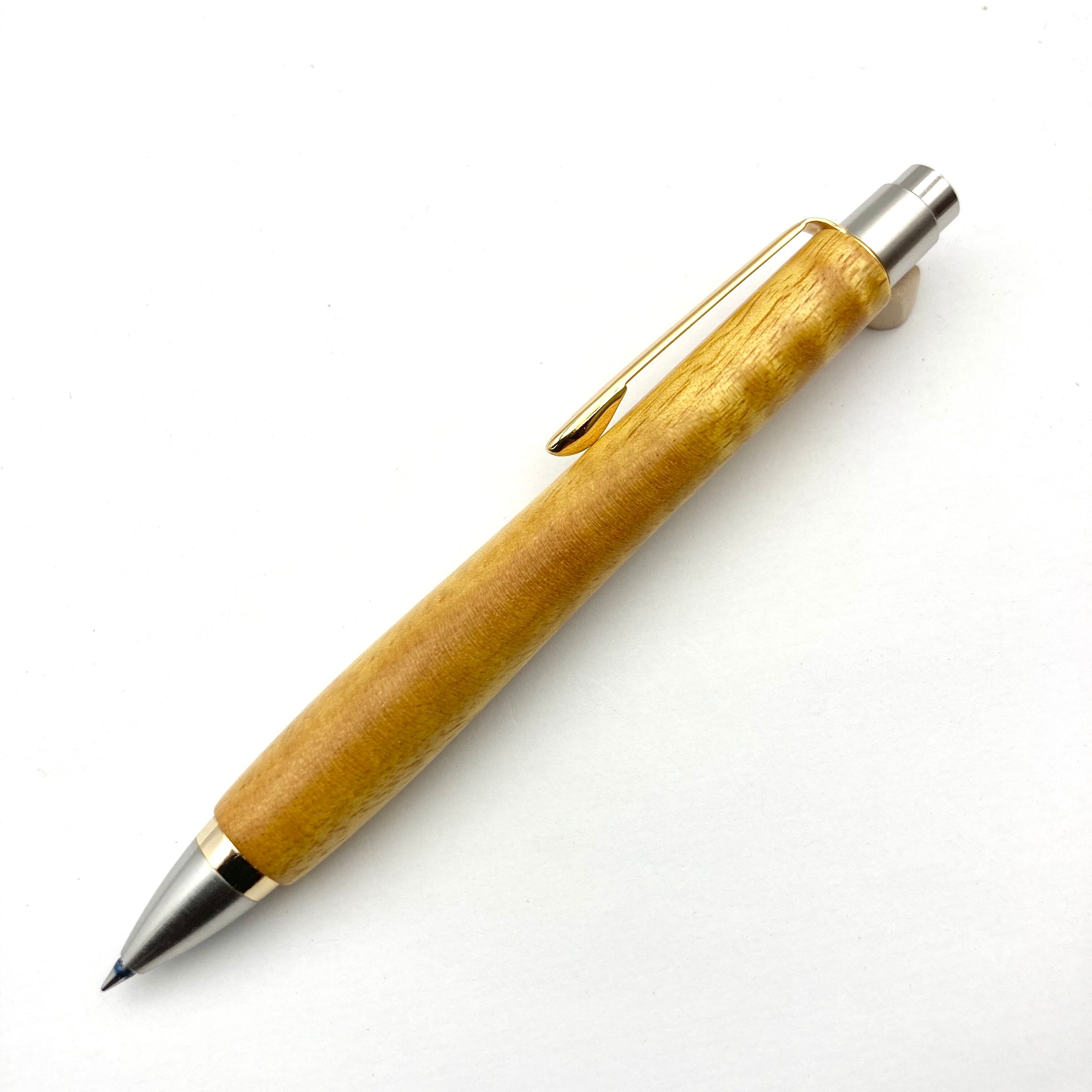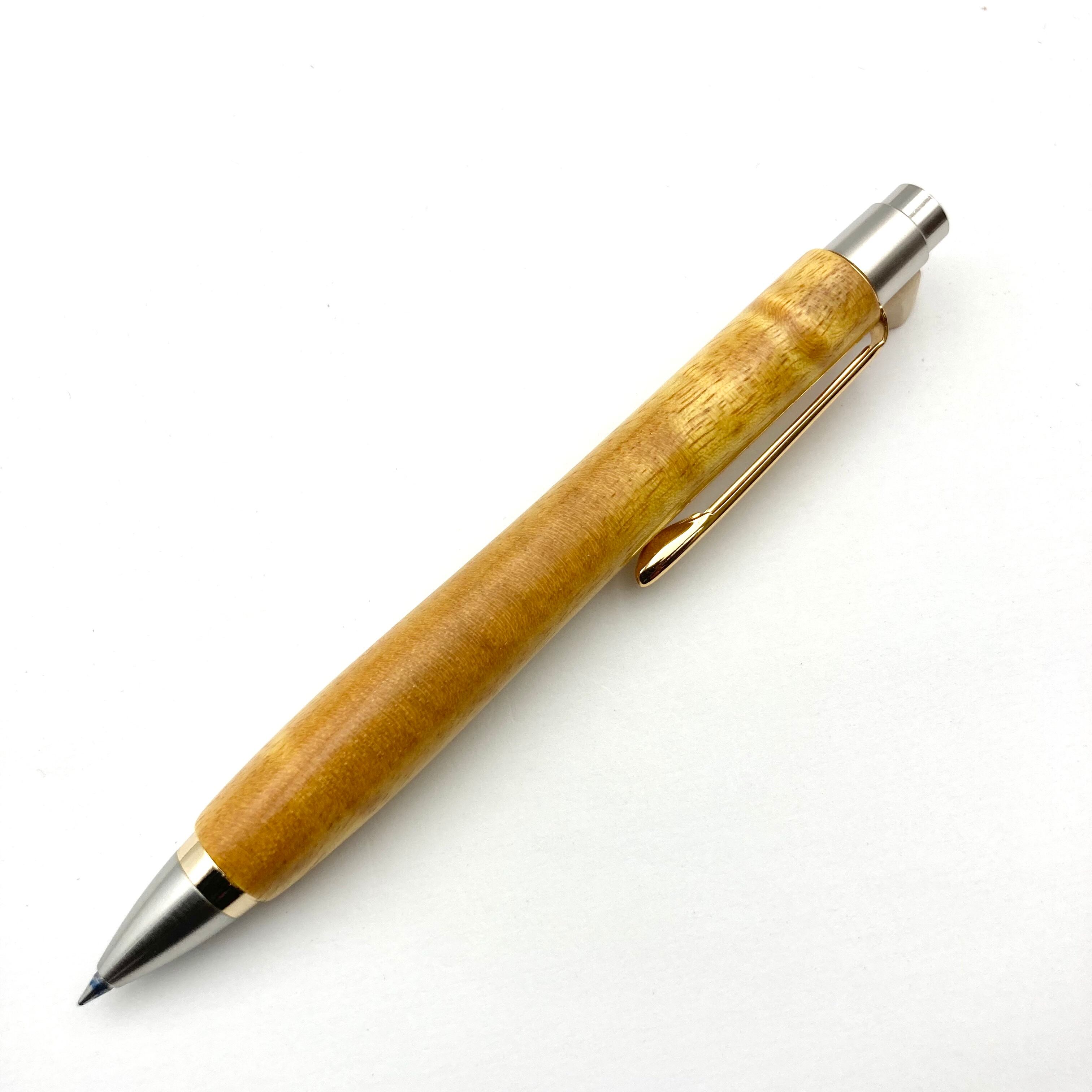 ボールペンのノックシステムは、ドイツ最高のクリックメカニズムを採用してあります。このメカニズムはユニークな機構のため、クリックしたときのカチカチ音が静かで、どんな場所でも気兼ねなく使うことができます。滑らかに動くこのプッシュ感覚を一度味わうと他には戻れなくなってしまうほどの魅力があります。 100分の1単位の加工精度で削り出されたペン先は、軸ブレも全くありません。
