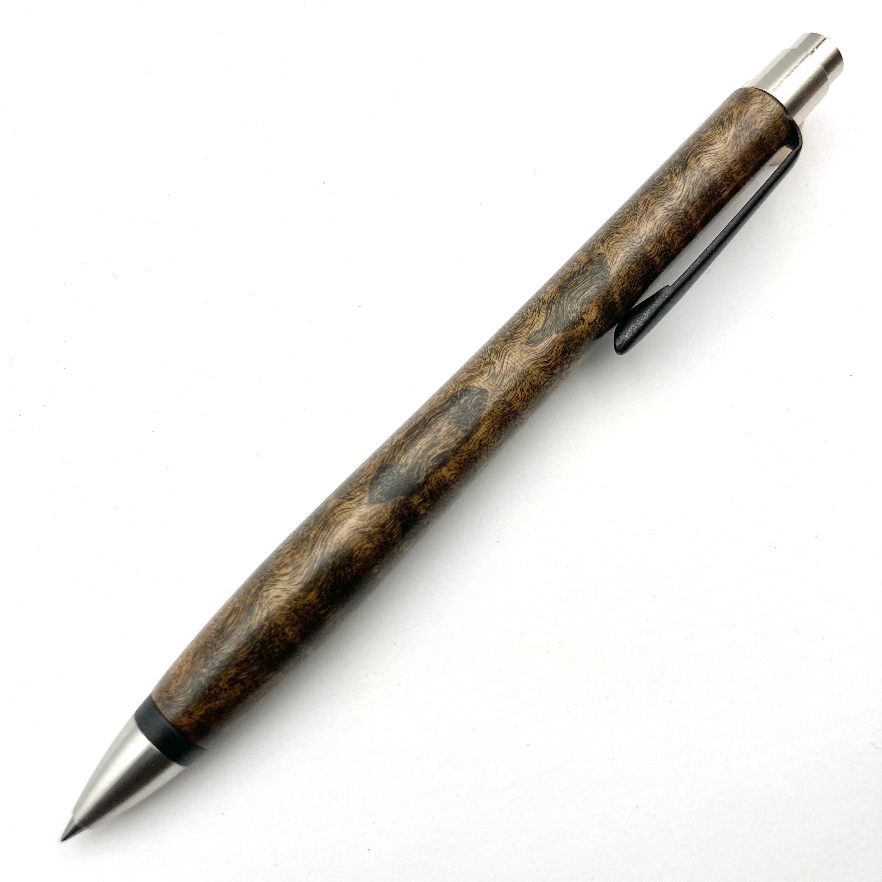 【樹種】大阪の漆塗り職人さんにお願いして、栃縮杢に大変希少な国産漆を、何度も塗り重ねて拭き取る(摺り漆)技法で仕上げた黒漆ペンです。