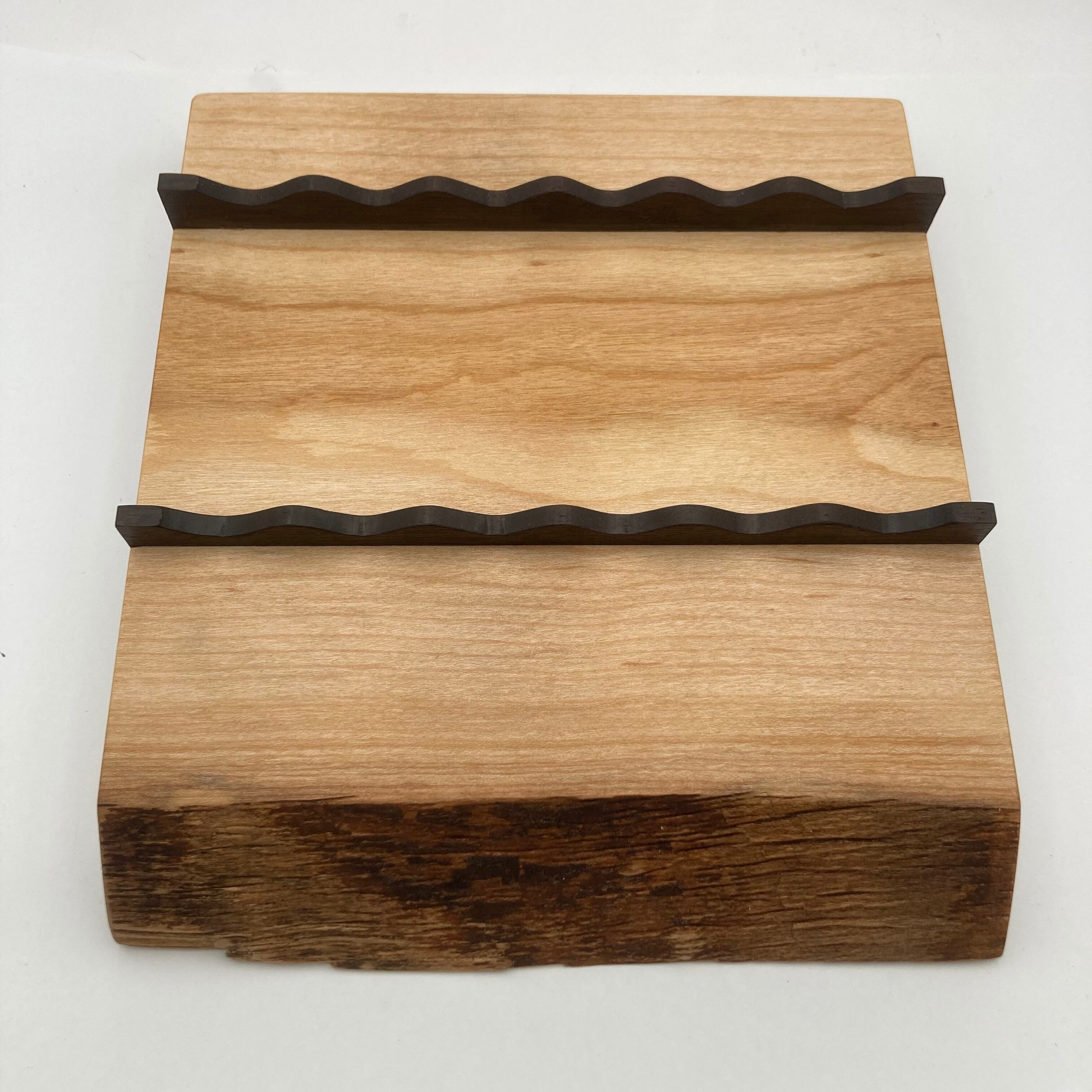 耳付き一枚板を天然オイルで仕上げてあり、ペンの長さや太さが違っても置けるように作られています。