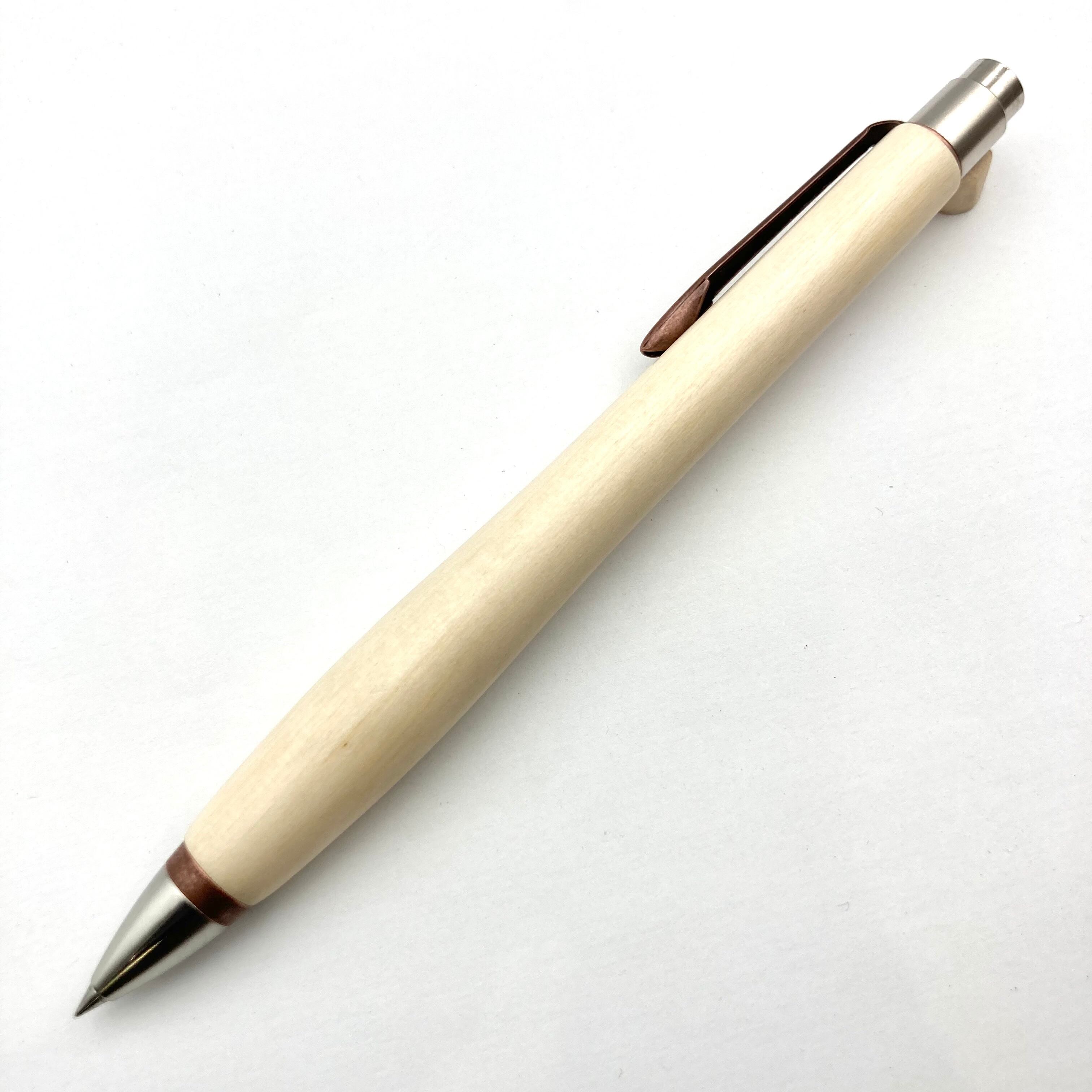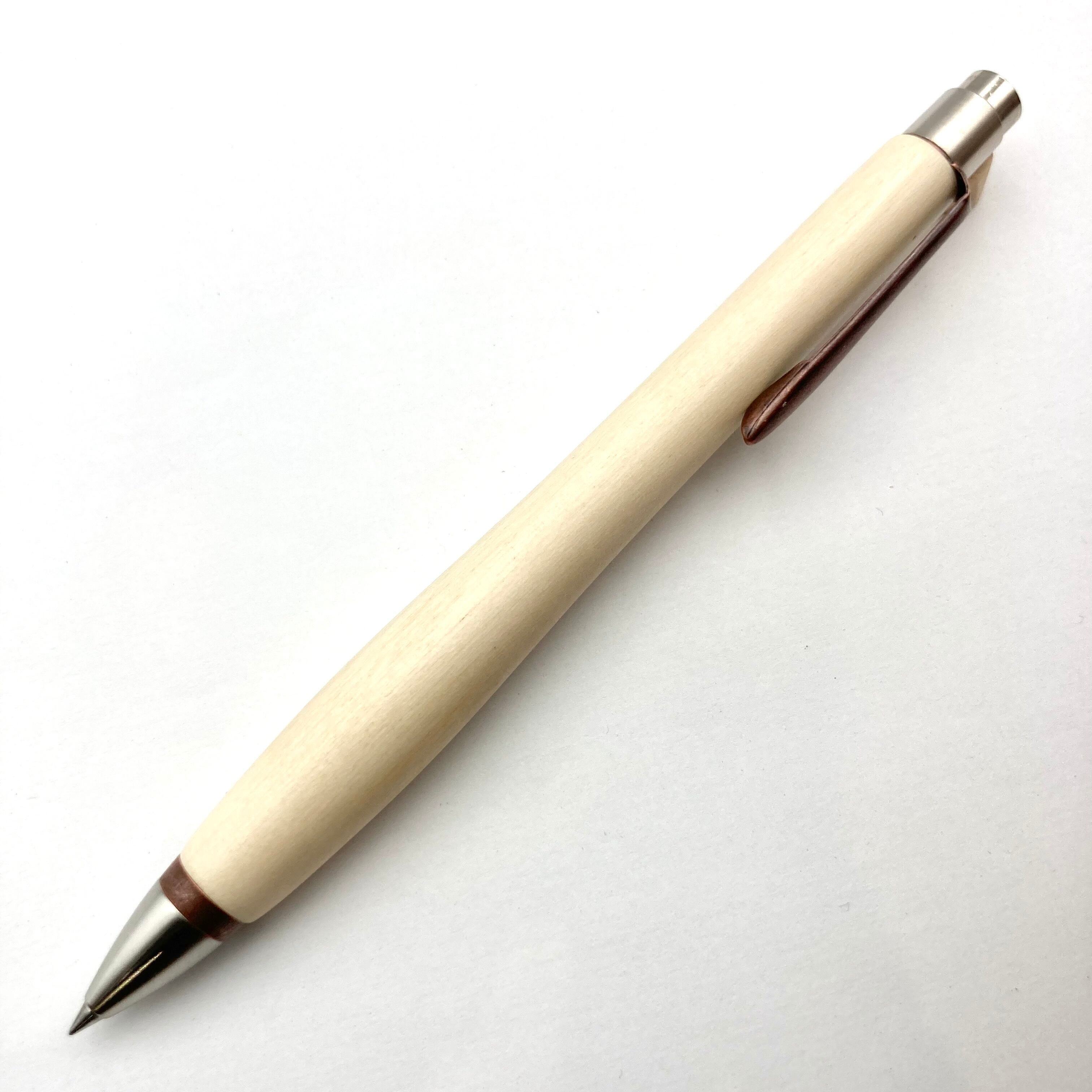 ボールペンのノックシステムは、ドイツ最高のクリックメカニズムを採用してあります。このメカニズムはユニークな機構のため、クリックしたときのカチカチ音が静かで、どんな場所でも気兼ねなく使うことができます。滑らかに動くこのプッシュ感覚を一度味わうと他には戻れなくなってしまうほどの魅力があります。 100分の1単位の加工精度で削り出されたペン先は、軸ブレも全くありません。
