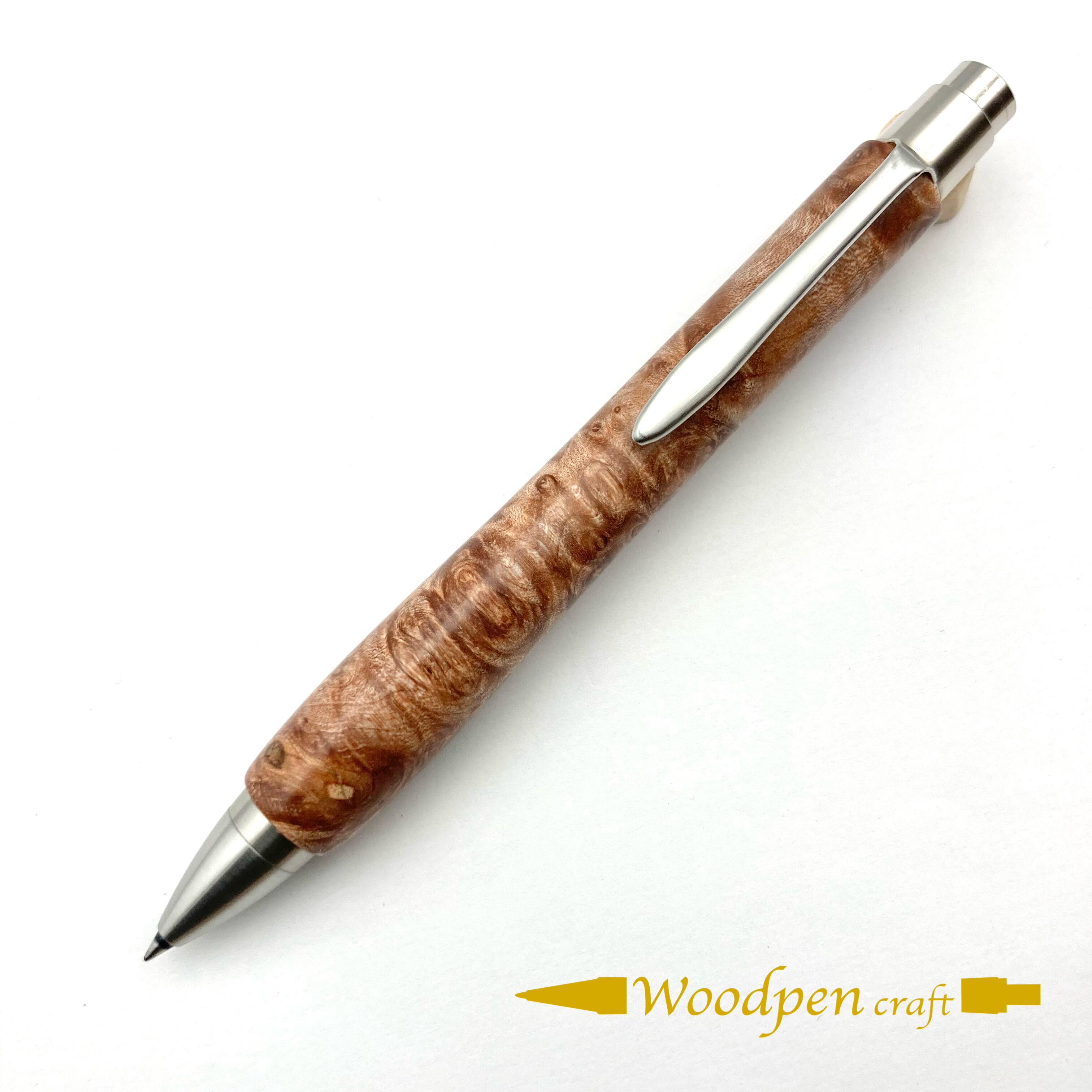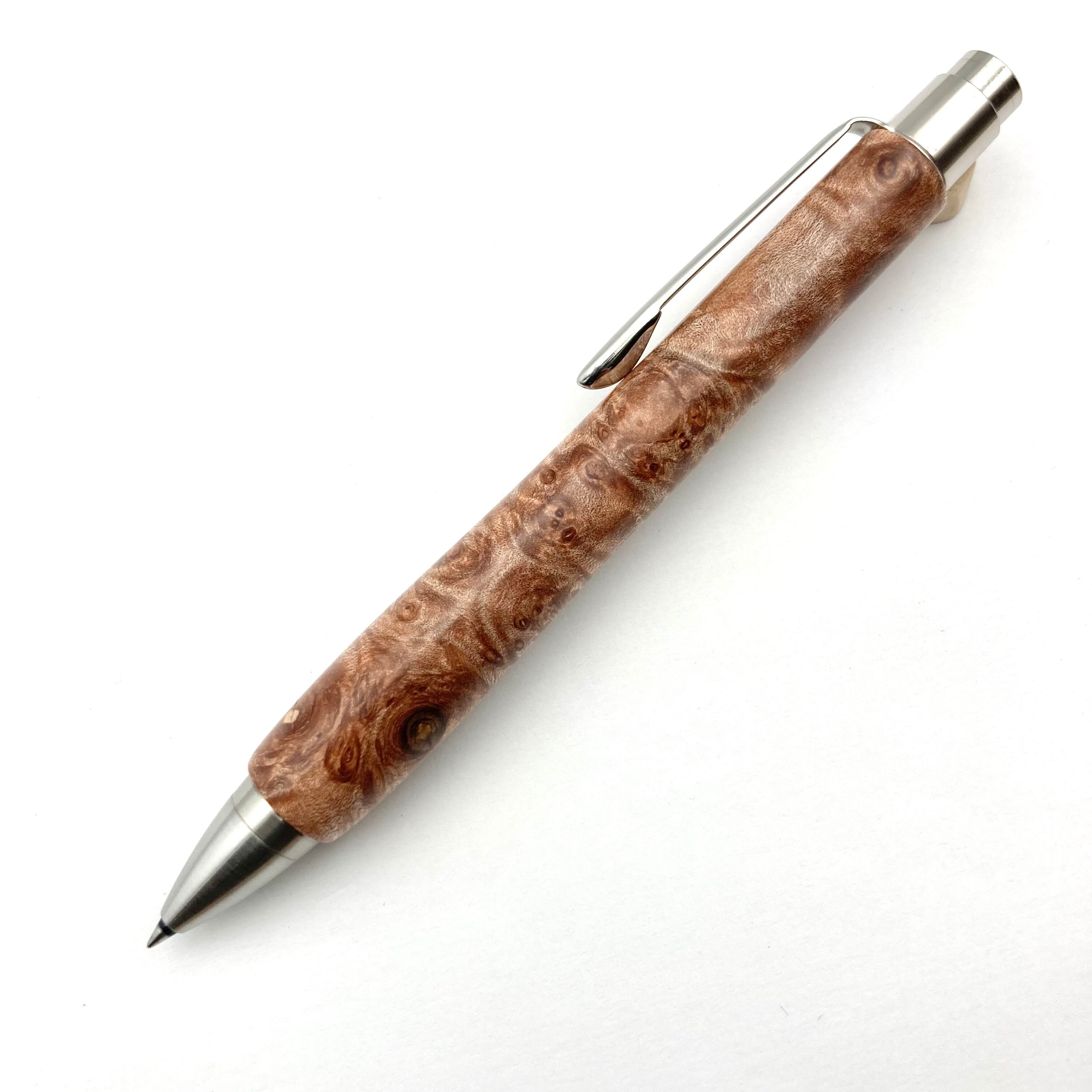 ボールペンのノックシステムは、ドイツ最高のクリックメカニズムを採用してあります。このメカニズムはユニークな機構のため、クリックしたときのカチカチ音が静かで、どんな場所でも気兼ねなく使うことができます。滑らかに動くこのプッシュ感覚を一度味わうと他には戻れなくなってしまうほどの魅力があります。 100分の1単位の加工精度で削り出されたペン先は、軸ブレも全くありません。