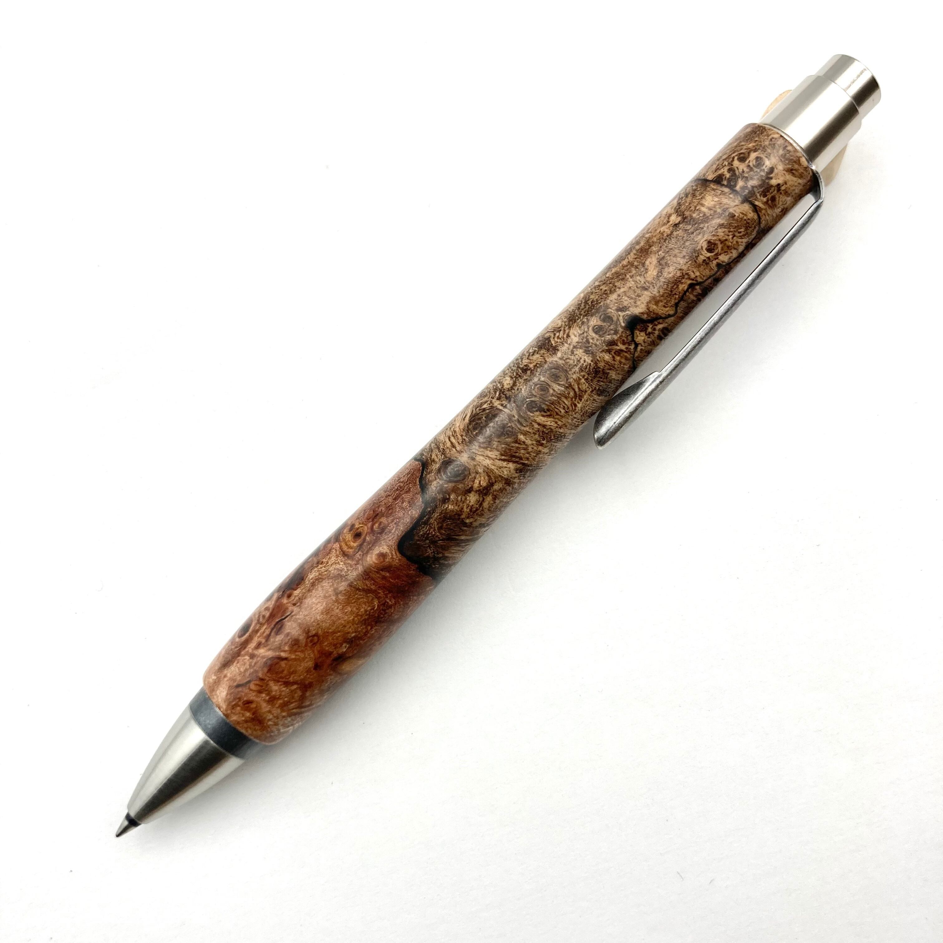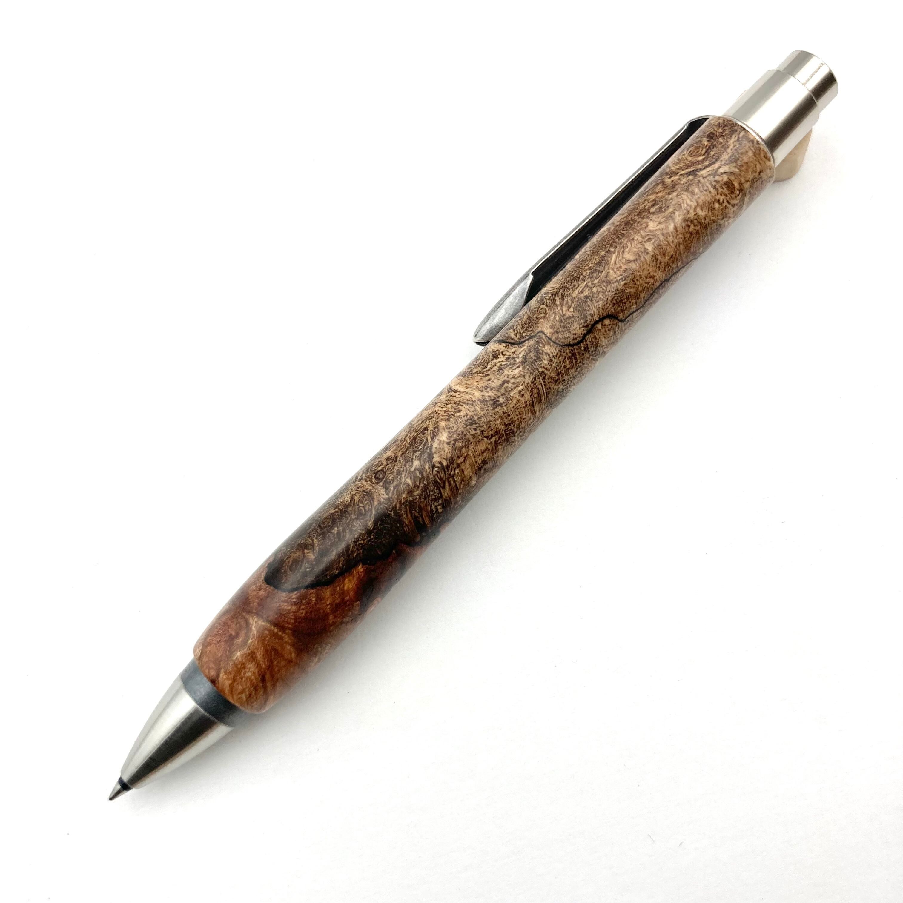 ボールペンのノックシステムは、ドイツ最高のクリックメカニズムを採用してあります。このメカニズムはユニークな機構のため、クリックしたときのカチカチ音が静かで、どんな場所でも気兼ねなく使うことができます。滑らかに動くこのプッシュ感覚を一度味わうと他には戻れなくなってしまうほどの魅力があります。 100分の1単位の加工精度で削り出されたペン先は、軸ブレも全くありません。