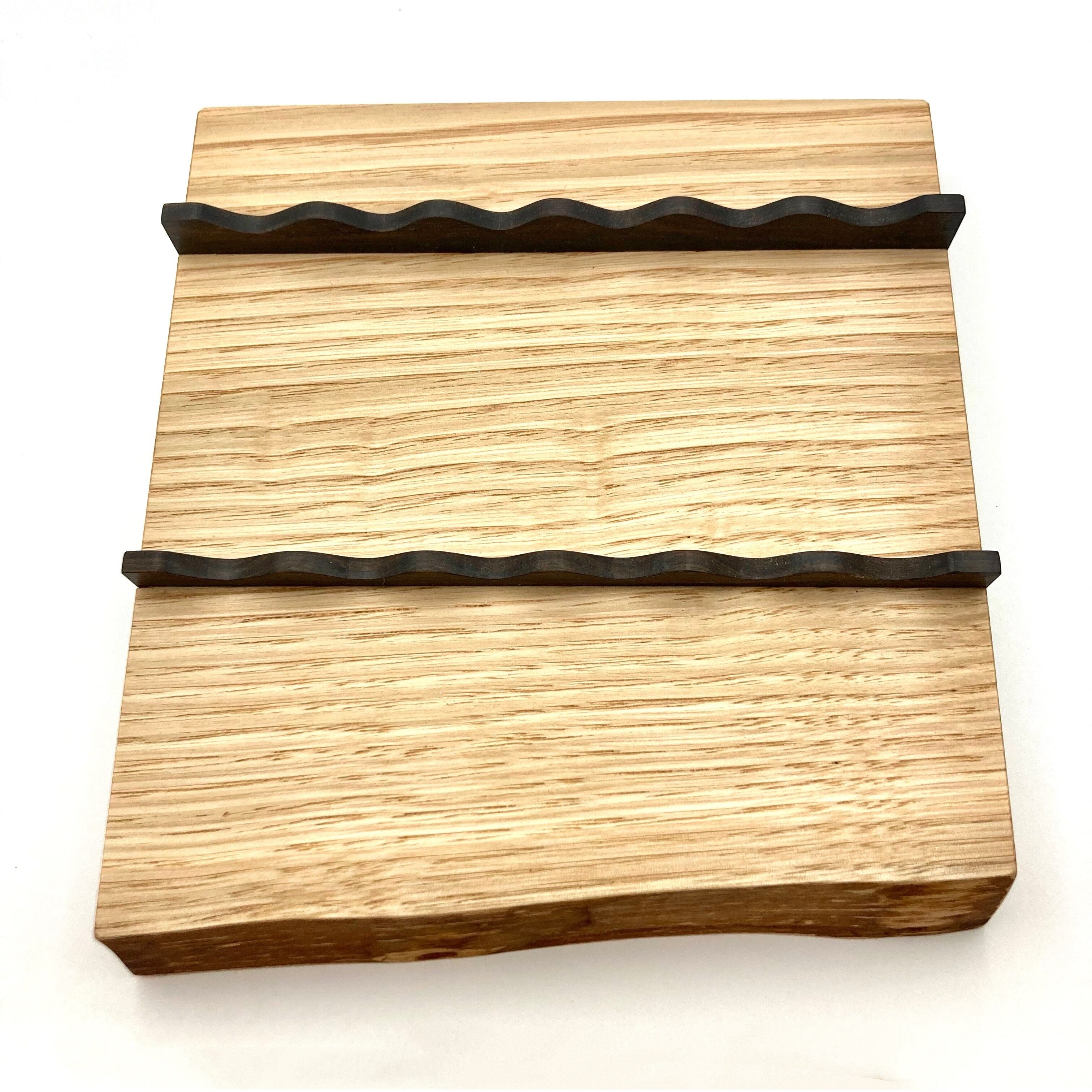 耳付き一枚板を天然オイルで仕上げてあり、ペンの長さや太さが違っても置けるように作られています。ペンに傷が付きにくいように波形の部分も木を使っています。