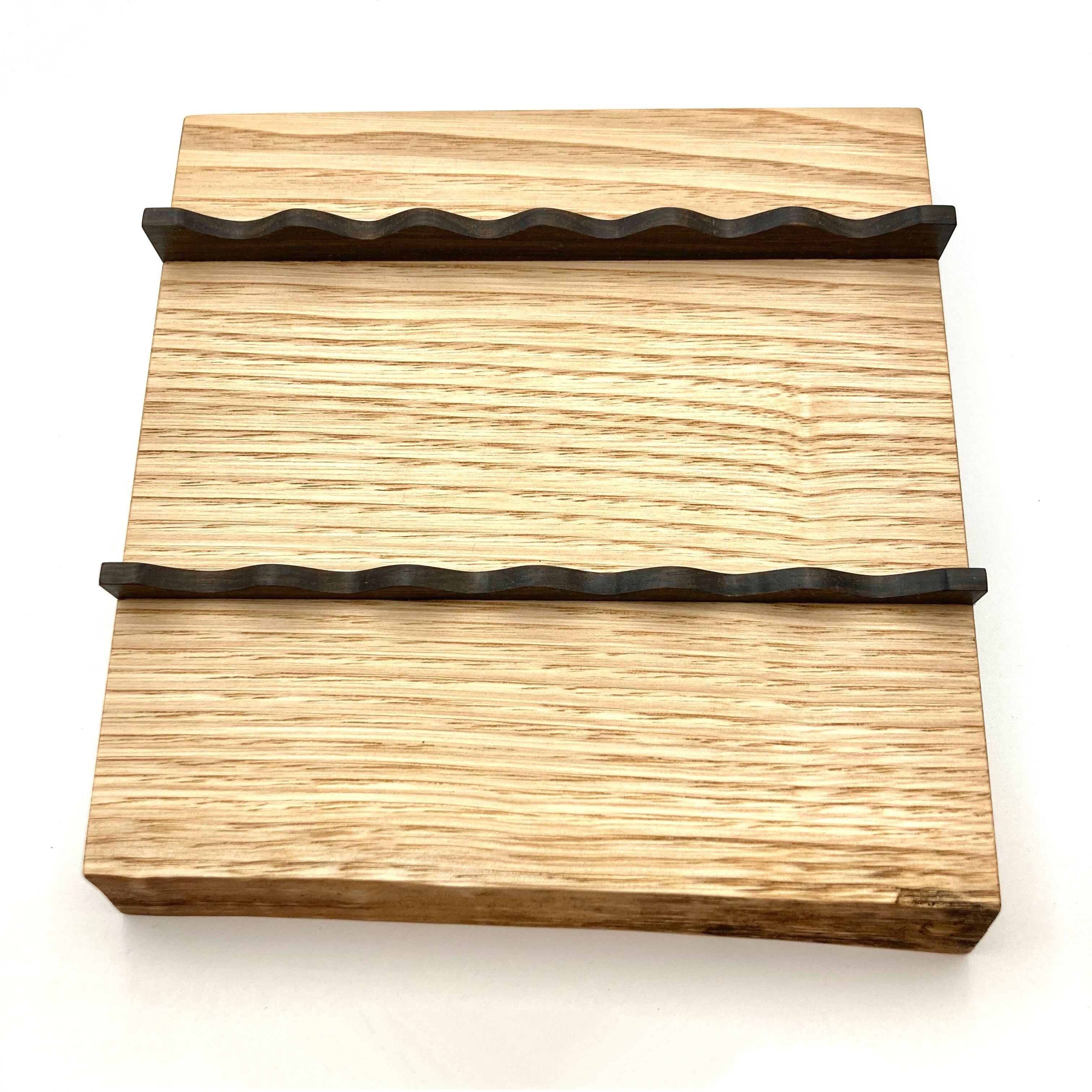 耳付き一枚板を天然オイルで仕上げてあり、ペンの長さや太さが違っても置けるように作られています。ペンに傷が付きにくいように波形の部分も木を使っています。