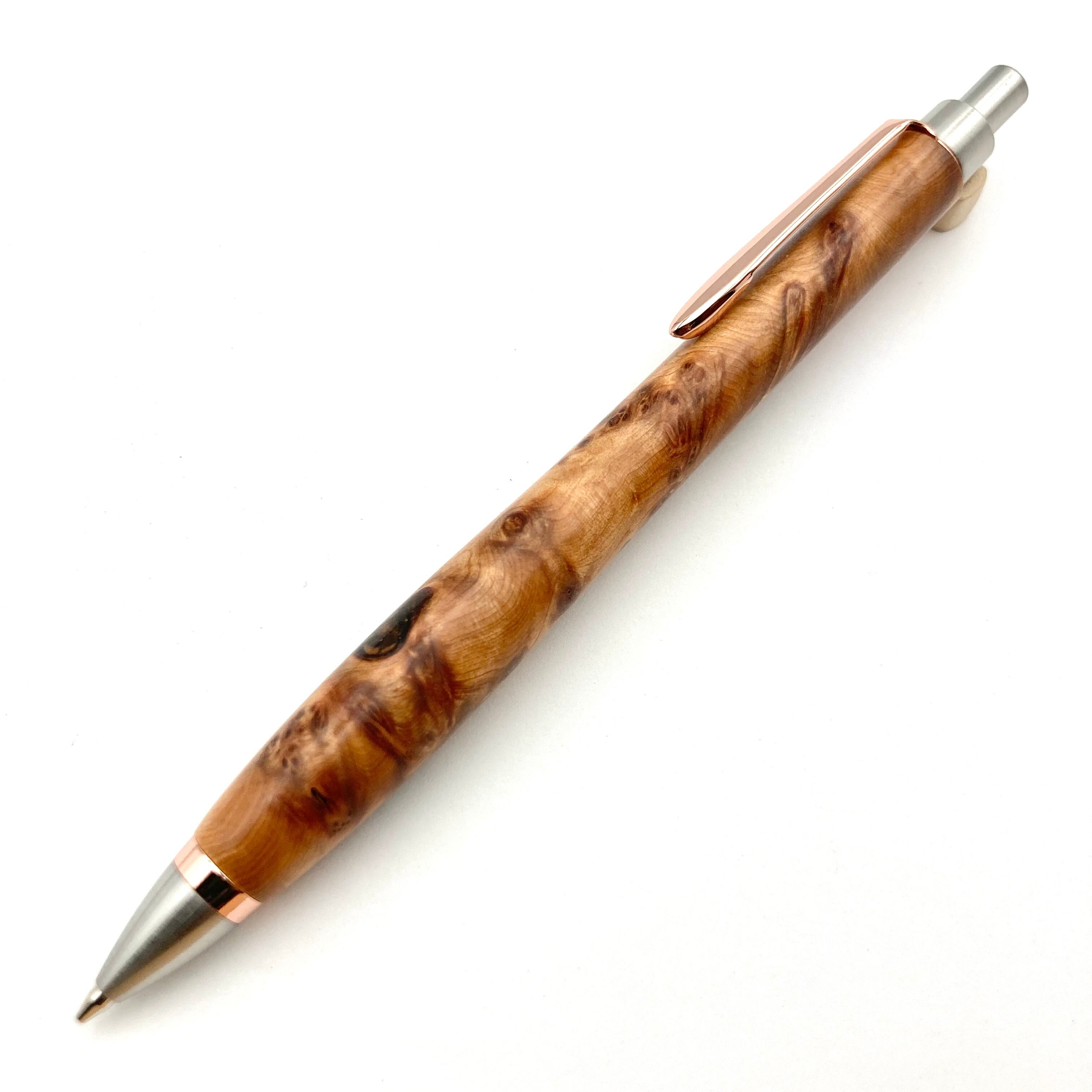 ペンシルは軸ブレが起こりにくい固定式口金を採用し、木の表情を最大限に楽しめる木軸の長さと、書き心地にこだわったバランスで金具を設計してあります。