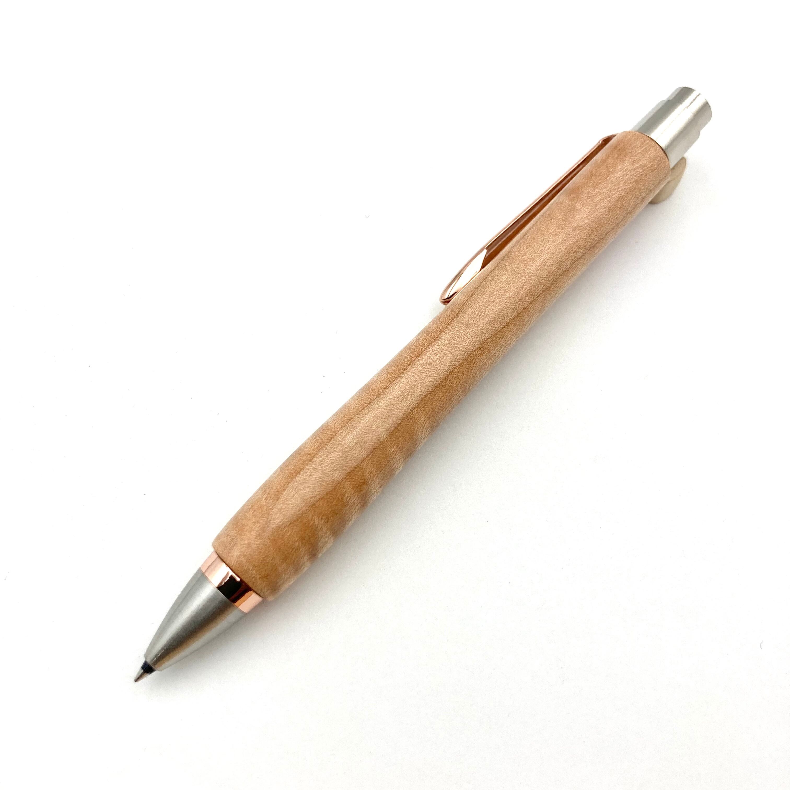 ボールペンのノックシステムは、ドイツ最高のクリックメカニズムを採用してあります。このメカニズムはユニークな機構のため、クリックしたときのカチカチ音が静かで、どんな場所でも気兼ねなく使うことができます。滑らかに動くこのプッシュ感覚を一度味わうと他には戻れなくなってしまうほどの魅力があります。 100分の1単位の加工精度で削り出されたペン先は、軸ブレも全くありません。