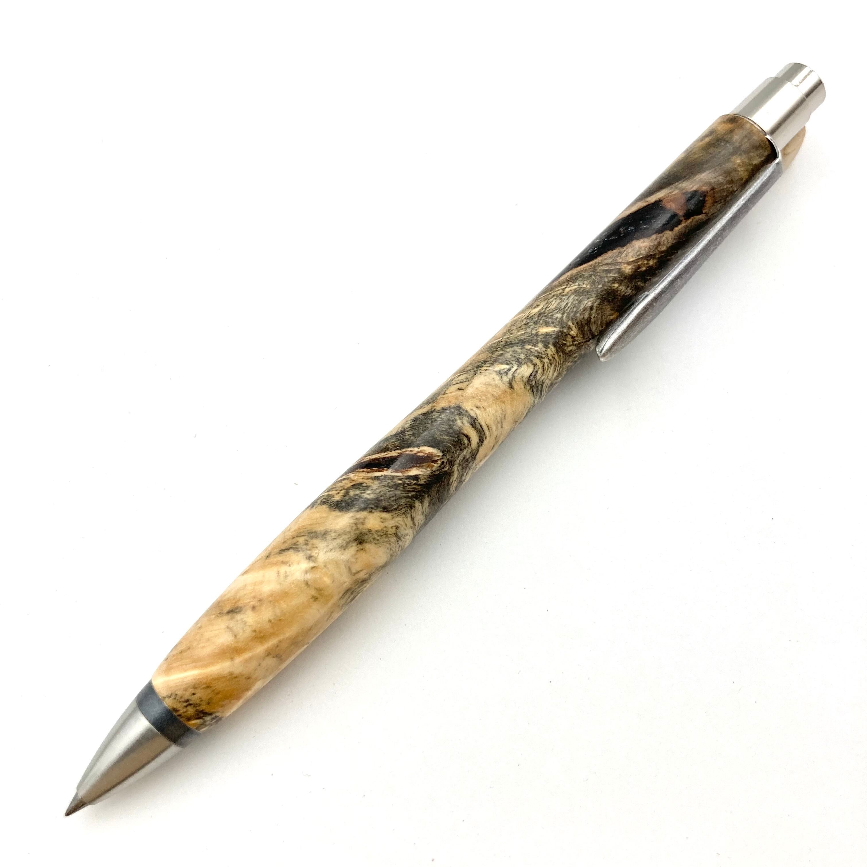 ボールペンのノックシステムは、ドイツ最高のクリックメカニズムを採用してあります。このメカニズムはユニークな機構のため、クリックしたときのカチカチ音が静かで、どんな場所でも気兼ねなく使うことができます。滑らかに動くこのプッシュ感覚を一度味わうと他には戻れなくなってしまうほどの魅力があります。 100分の1単位の加工精度で削り出されたペン先は、軸ブレも全くありません。