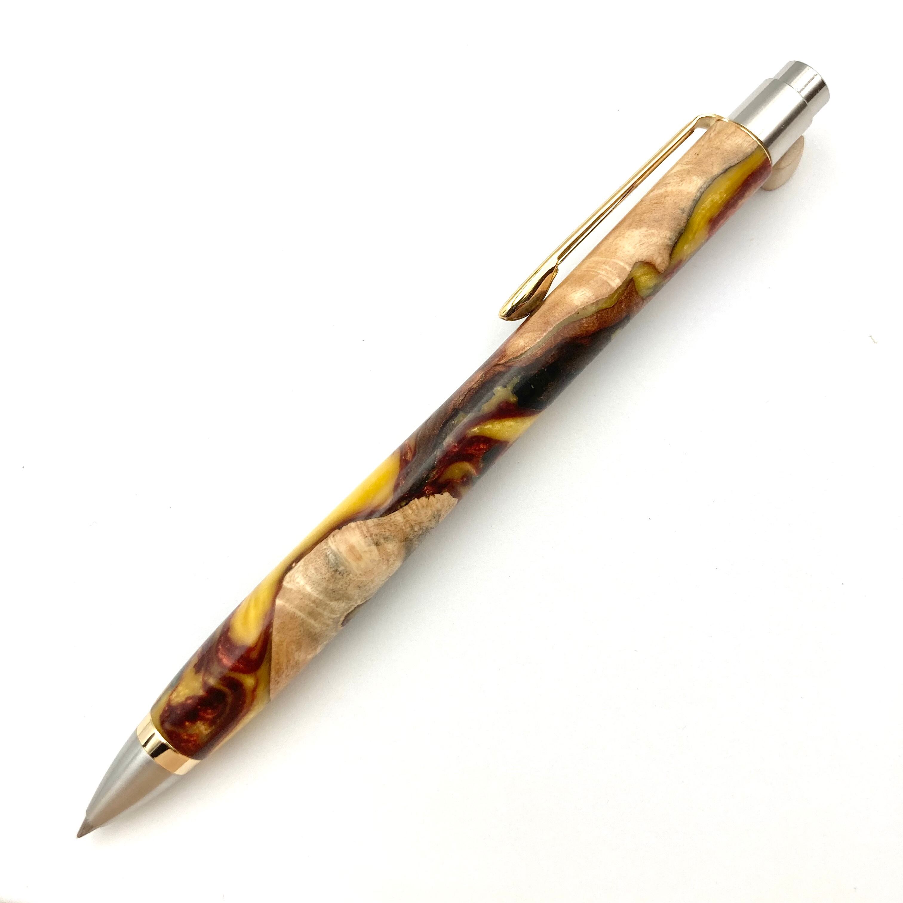 ボールペンのノックシステムは、ドイツ最高のクリックメカニズムを採用してあります。このメカニズムはユニークな機構のため、クリックしたときのカチカチ音が静かで、どんな場所でも気兼ねなく使うことができます。滑らかに動くこのプッシュ感覚を一度味わうと他には戻れなくなってしまうほどの魅力があります。 100分の1単位の加工精度で削り出されたペン先は、軸ブレも全くありません。