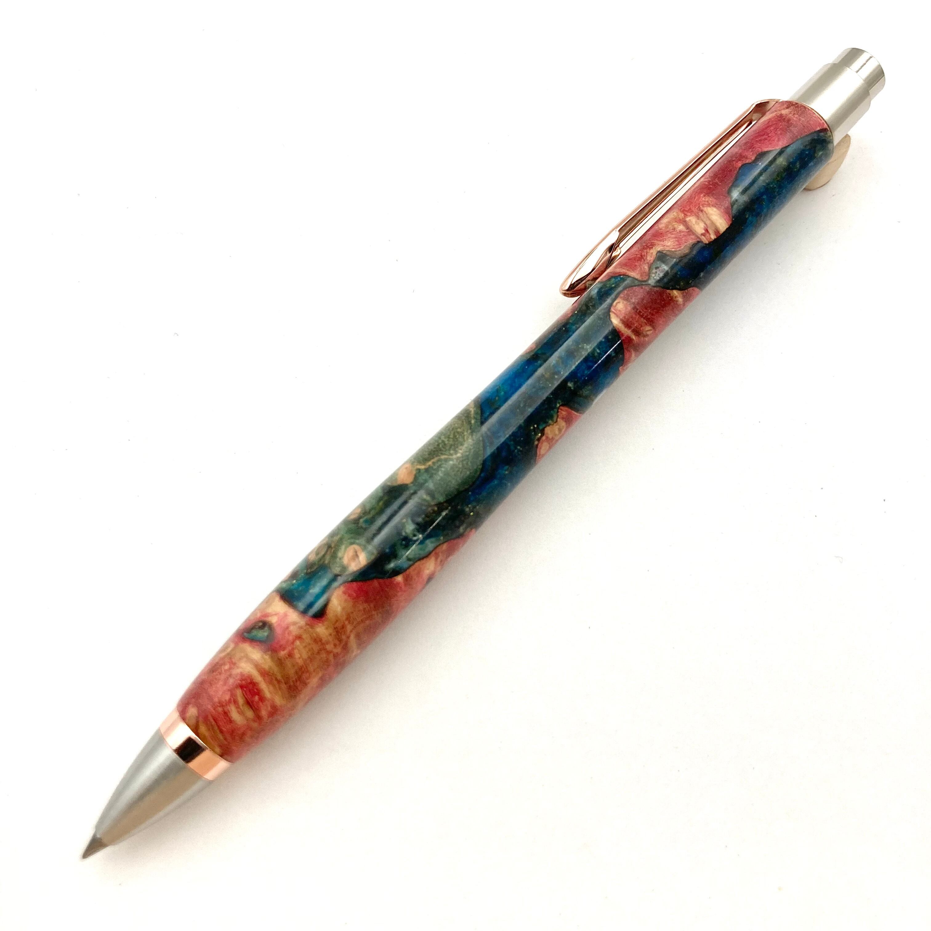 ボールペンのノックシステムは、ドイツ最高のクリックメカニズムを採用してあります。このメカニズムはユニークな機構のため、クリックしたときのカチカチ音が静かで、どんな場所でも気兼ねなく使うことができます。滑らかに動くこのプッシュ感覚を一度味わうと他には戻れなくなってしまうほどの魅力があります。 100分の1単位の加工精度で削り出されたペン先は、軸ブレも全くありません。
