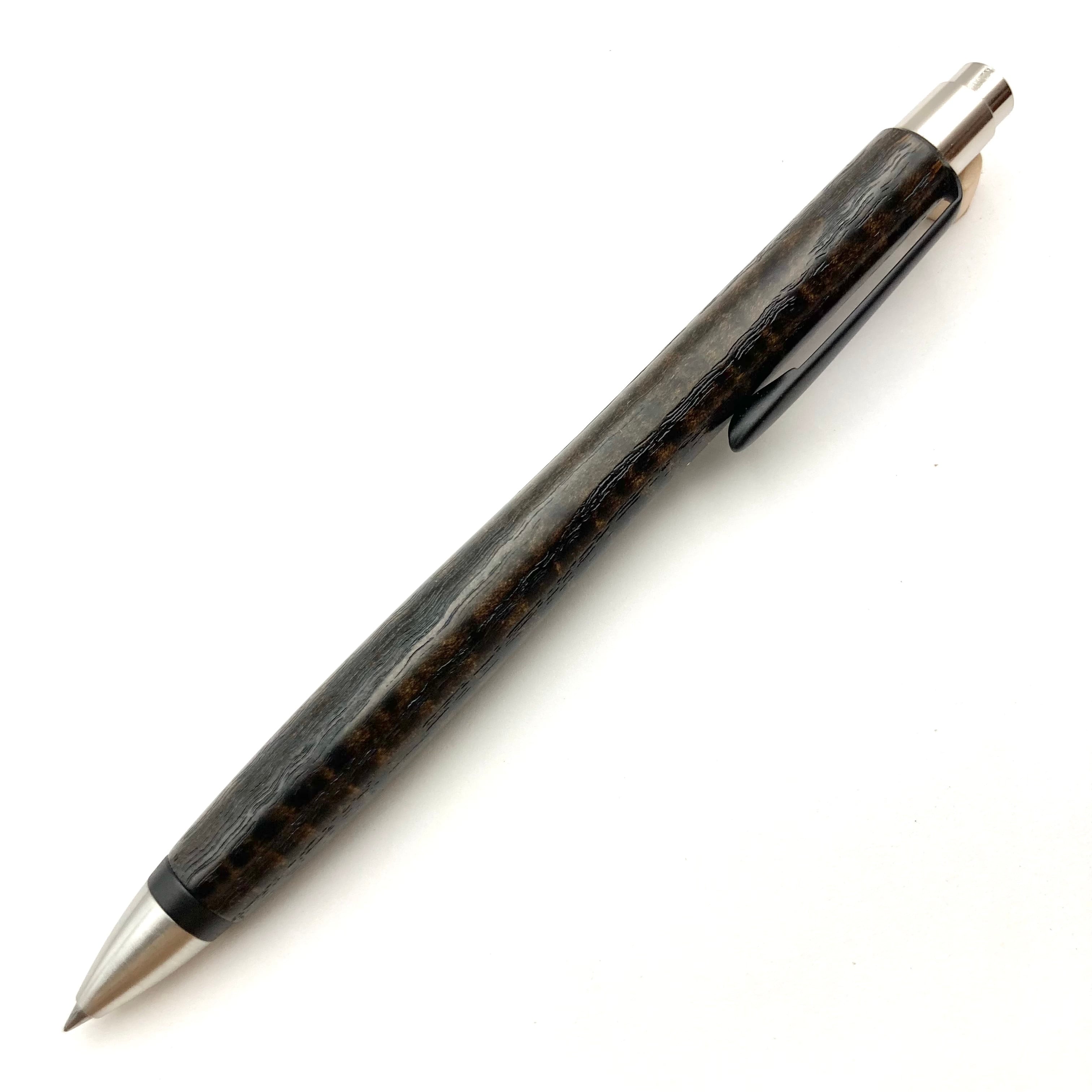 【樹種】大阪の漆塗り職人さんにお願いして、北海道産タモ縮杢に大変希少な国産漆を、何度も塗り重ねて拭き取る(摺り漆)技法で仕上げた黒漆ペンです。