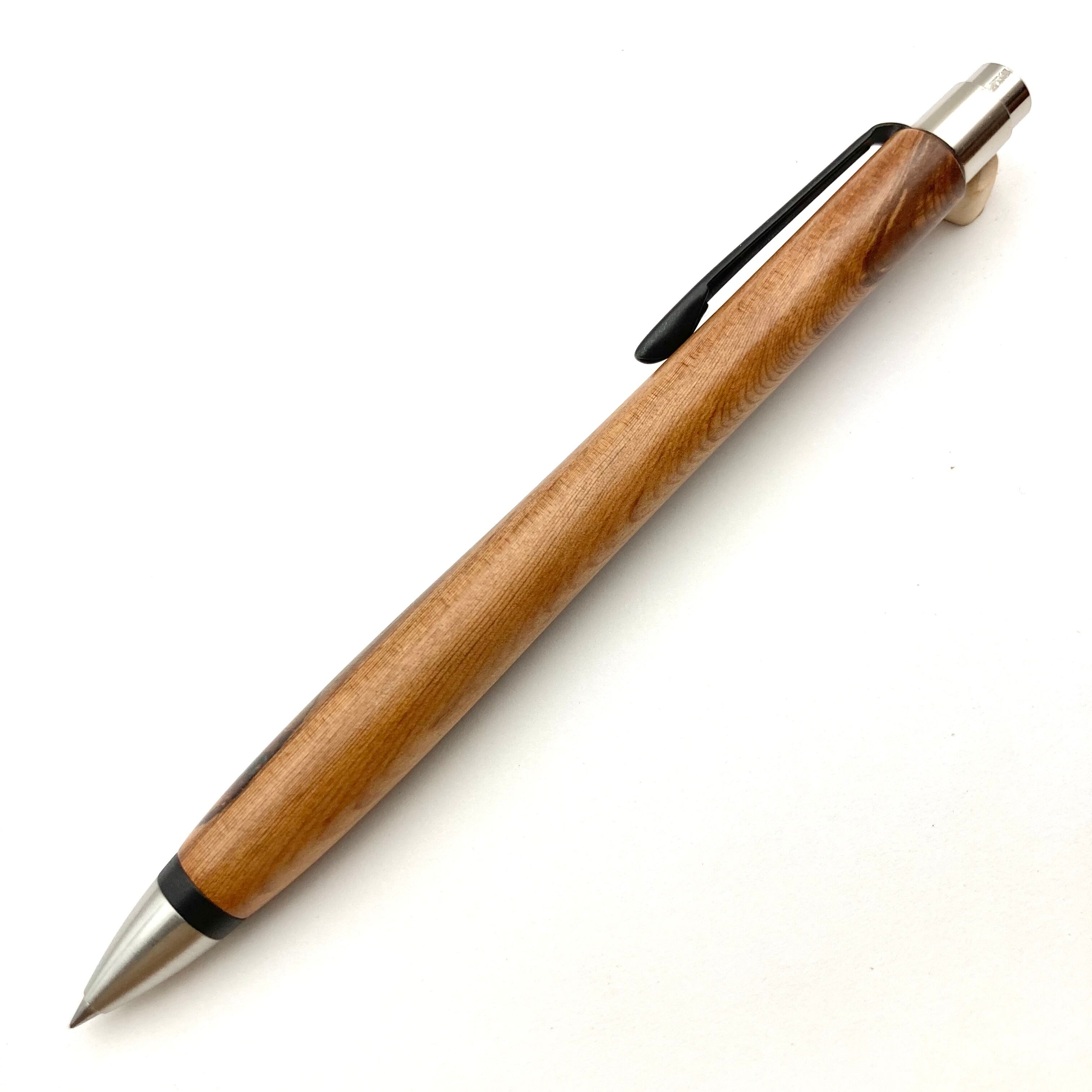 ボールペンのノックシステムは、ドイツ最高のクリックメカニズムを採用してあります。このメカニズムはユニークな機構のため、クリックしたときのカチカチ音が静かで、どんな場所でも気兼ねなく使うことができます。滑らかに動くこのプッシュ感覚を一度味わうと他には戻れなくなってしまうほどの魅力があります。 100分の1単位の加工精度で削り出されたペン先は、軸ブレも全くありません。