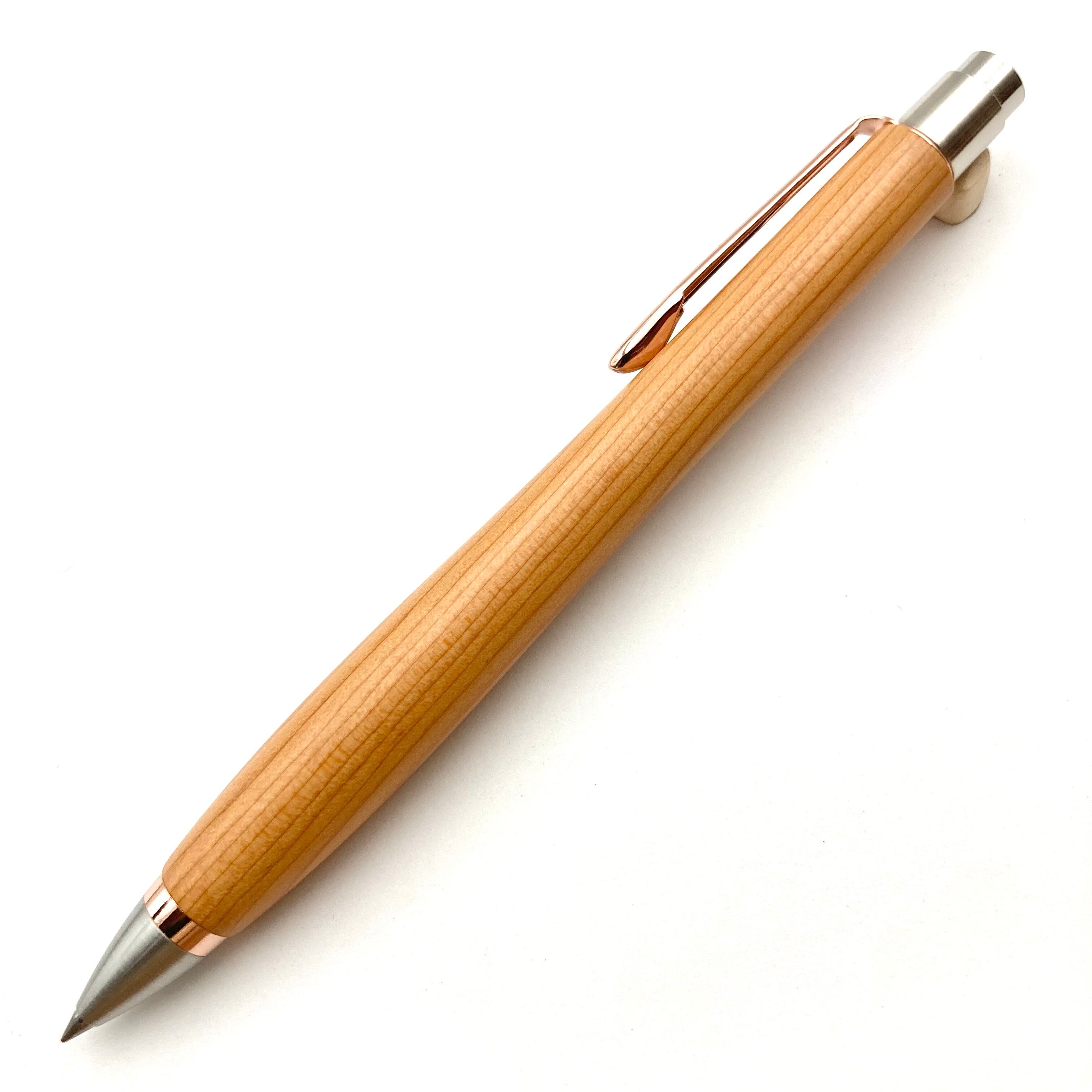 ボールペンのノックシステムは、ドイツ最高のクリックメカニズムを採用してあります。このメカニズムはユニークな機構のため、クリックしたときのカチカチ音が静かで、どんな場所でも気兼ねなく使うことができます。滑らかに動くこのプッシュ感覚を一度味わうと他には戻れなくなってしまうほどの魅力があります。 100分の1単位の加工精度で削り出されたペン先は、軸ブレも全くありません。