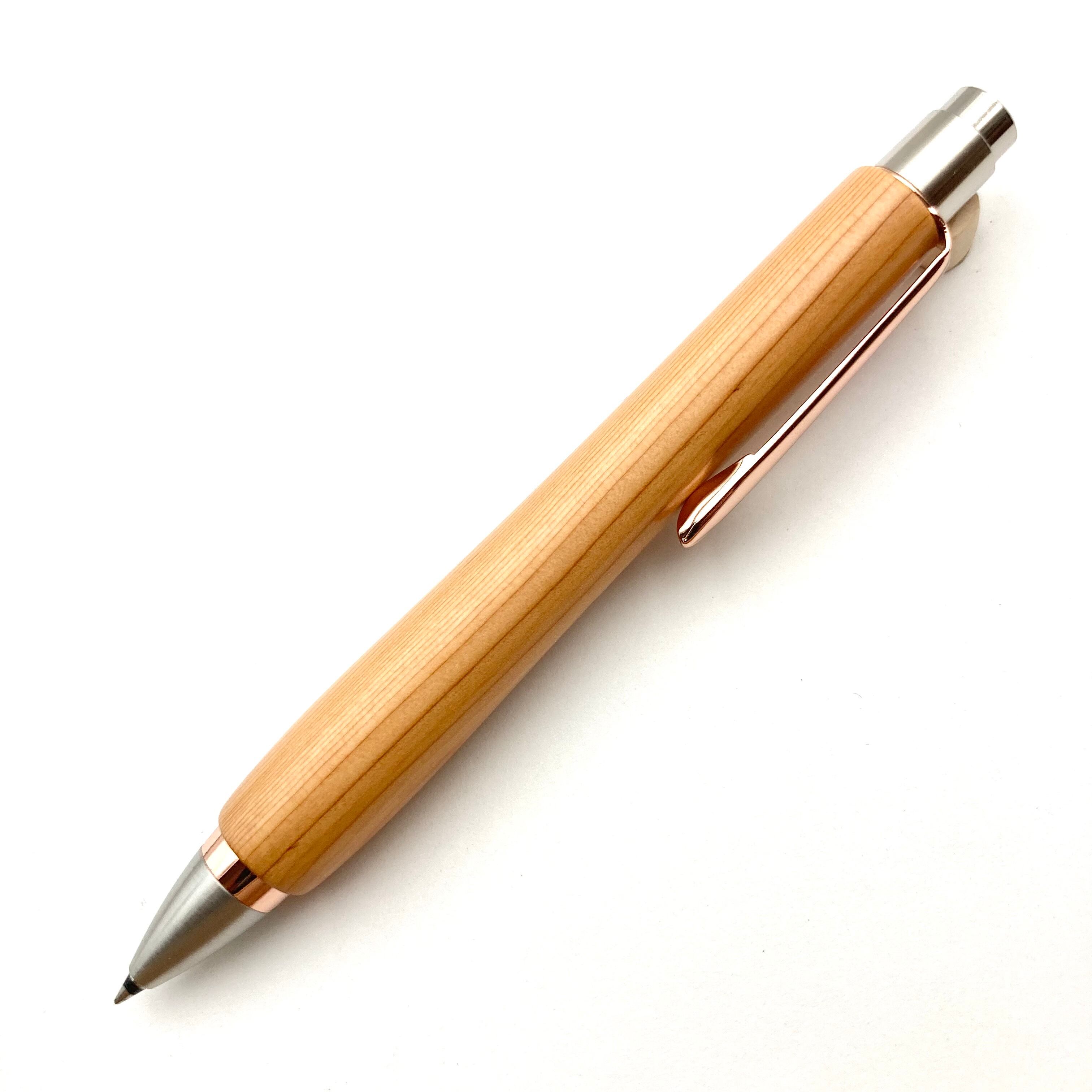 ボールペンのノックシステムは、ドイツ最高のクリックメカニズムを採用してあります。このメカニズムはユニークな機構のため、クリックしたときのカチカチ音が静かで、どんな場所でも気兼ねなく使うことができます。滑らかに動くこのプッシュ感覚を一度味わうと他には戻れなくなってしまうほどの魅力があります。 100分の1単位の加工精度で削り出されたペン先は、軸ブレも全くありません。