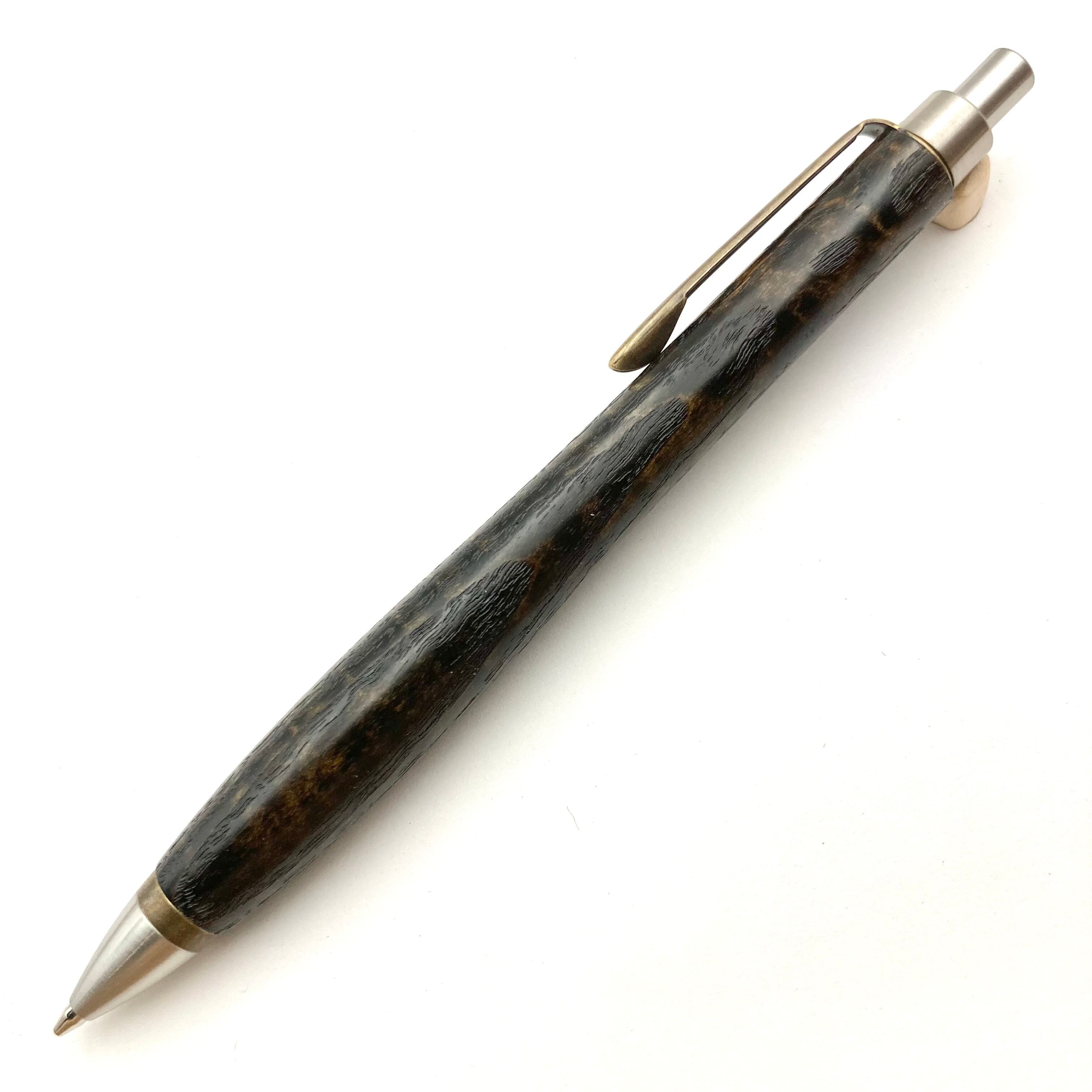 【樹種】大阪の漆塗り職人さんにお願いして、北海道産タモ縮杢に大変希少な国産漆を、何度も塗り重ねて拭き取る(摺り漆)技法で仕上げた黒漆ペンです。