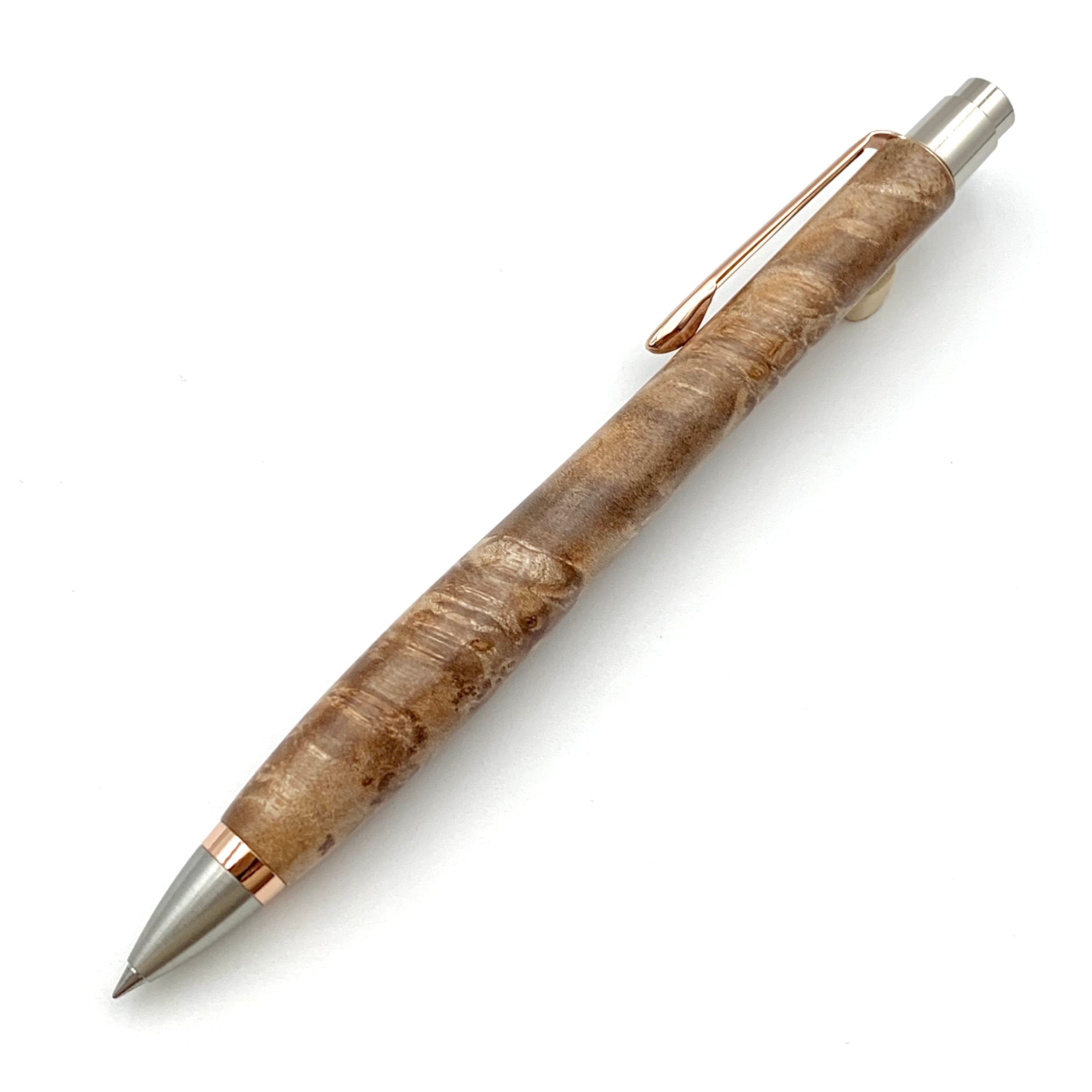 ボールペンのノックシステムは、ドイツ最高のクリックメカニズムを採用してあります。このメカニズムはユニークな機構のため、クリックしたときのカチカチ音が静かで、どんな場所でも気兼ねなく使うことができます。滑らかに動くこのプッシュ感覚を一度味わうと他には戻れなくなってしまうほどの魅力があります。 100分の1単位の加工精度で削り出されたペン先は、軸ブレも全くありません。