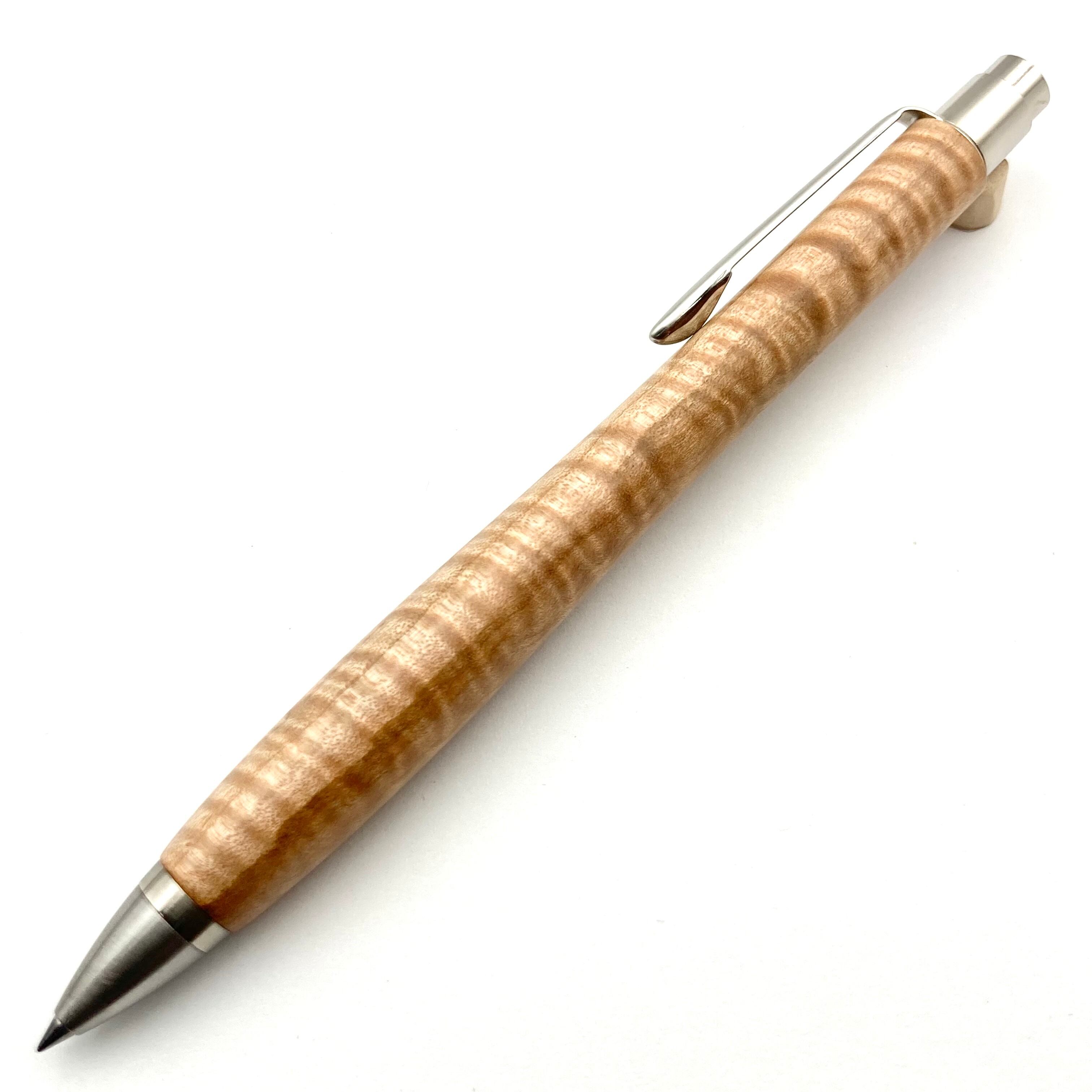 ボールペンのノックシステムは、ドイツ最高のクリックメカニズムを採用してあります。このメカニズムはユニークな機構のため、クリックしたときのカチカチ音が静かで、どんな場所でも気兼ねなく使うことができます。滑らかに動くこのプッシュ感覚を一度味わうと他には戻れなくなってしまうほどの魅力があります。 100分の1単位の加工精度で削り出されたペン先は、軸ブレも全くありません。