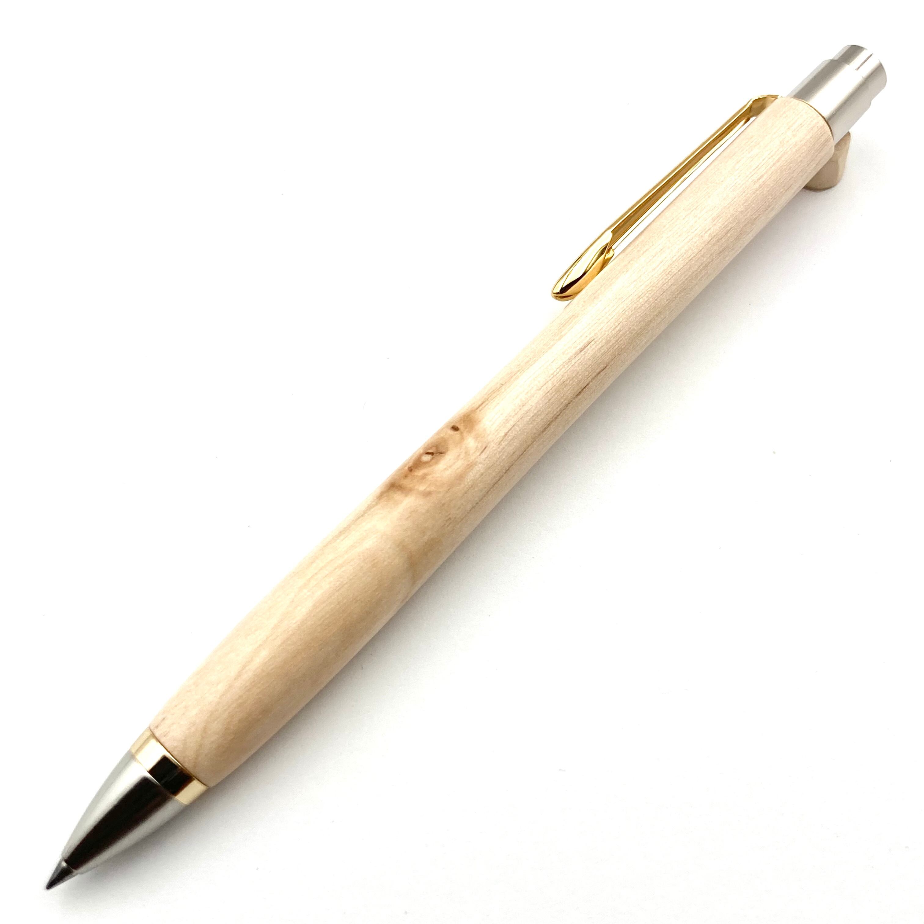 ボールペンのノックシステムは、ドイツ最高のクリックメカニズムを採用してあります。このメカニズムはユニークな機構のため、クリックしたときのカチカチ音が静かで、どんな場所でも気兼ねなく使うことができます。滑らかに動くこのプッシュ感覚を一度味わうと他には戻れなくなってしまうほどの魅力があります。 100分の1単位の加工精度で削り出されたペン先は、軸ブレも全くありません。