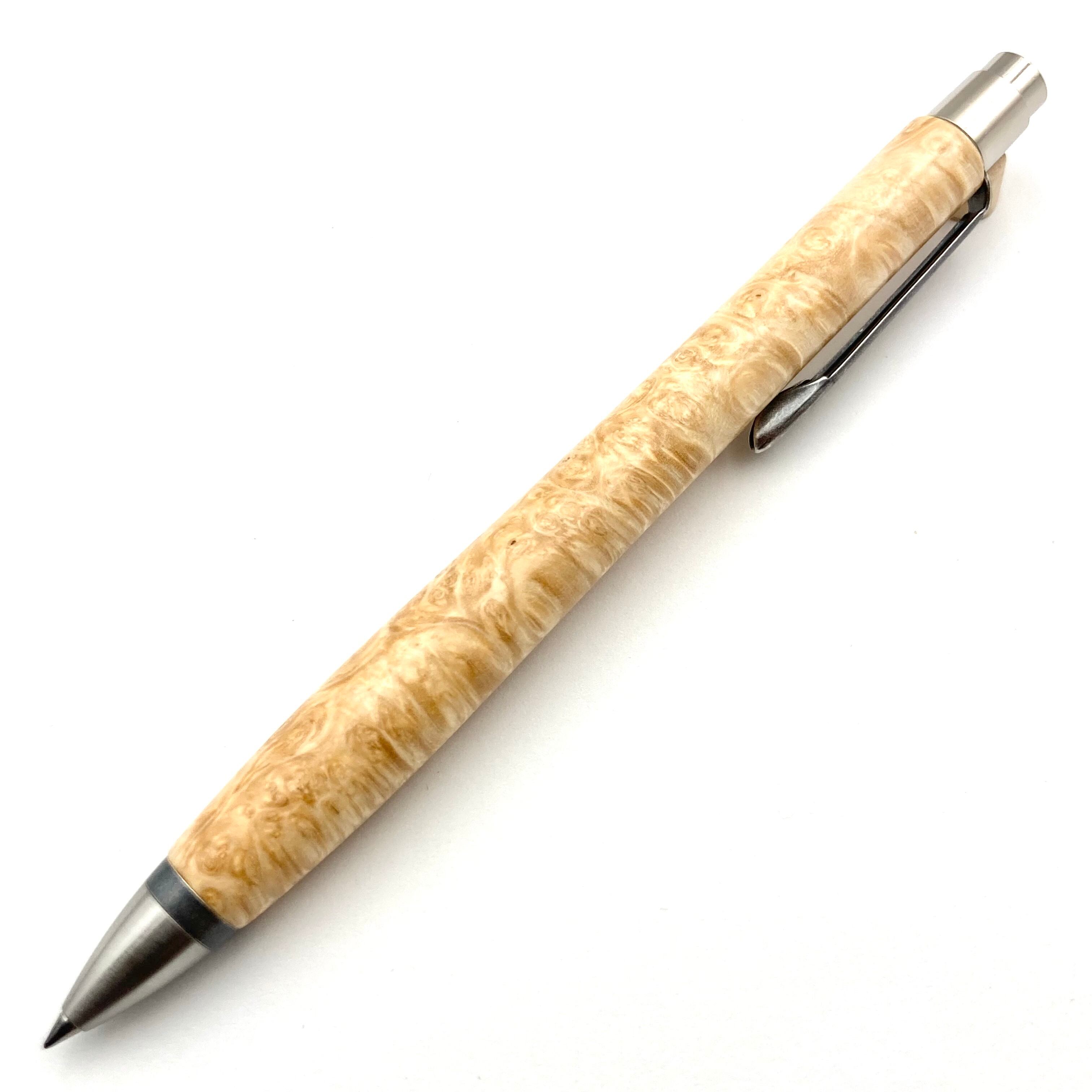 ボールペンのノックシステムは、ドイツ最高のクリックメカニズムを採用してあります。このメカニズムはユニークな機構のため、クリックしたときのカチカチ音が静かで、どんな場所でも気兼ねなく使うことができます。滑らかに動くこのプッシュ感覚を一度味わうと他には戻れなくなってしまうほどの魅力があります。 100分の1単位の加工精度で削り出されたペン先は、軸ブレも全くありません。
