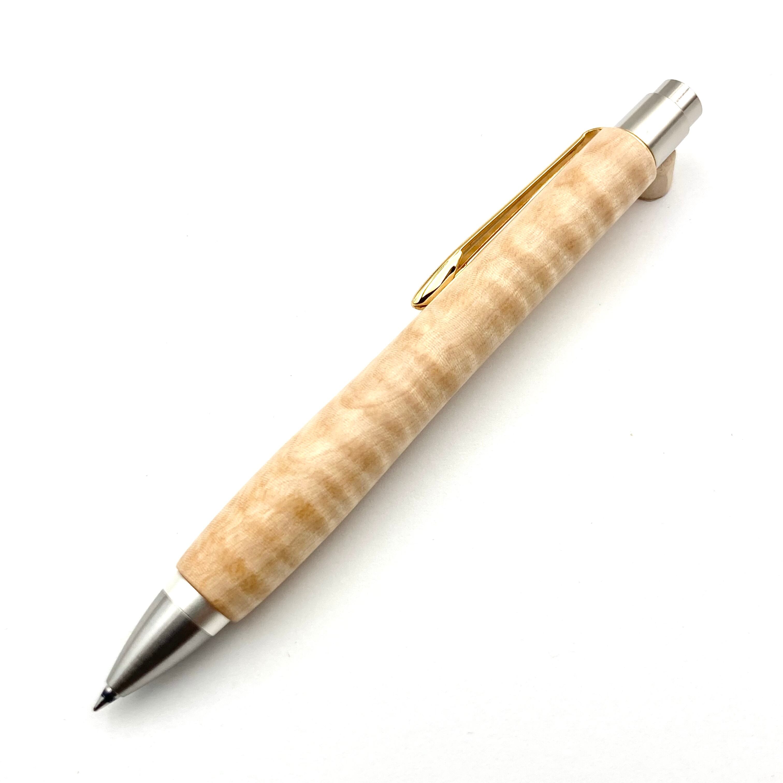 ボールペンのノックシステムは、ドイツ最高のクリックメカニズムを採用してあります。このメカニズムはユニークな機構のため、クリックしたときのカチカチ音が静かで、どんな場所でも気兼ねなく使うことができます。滑らかに動くこのプッシュ感覚を一度味わうと他には戻れなくなってしまうほどの魅力があります。 100分の1単位の加工精度で削り出されたペン先は、軸ブレも全くありません。