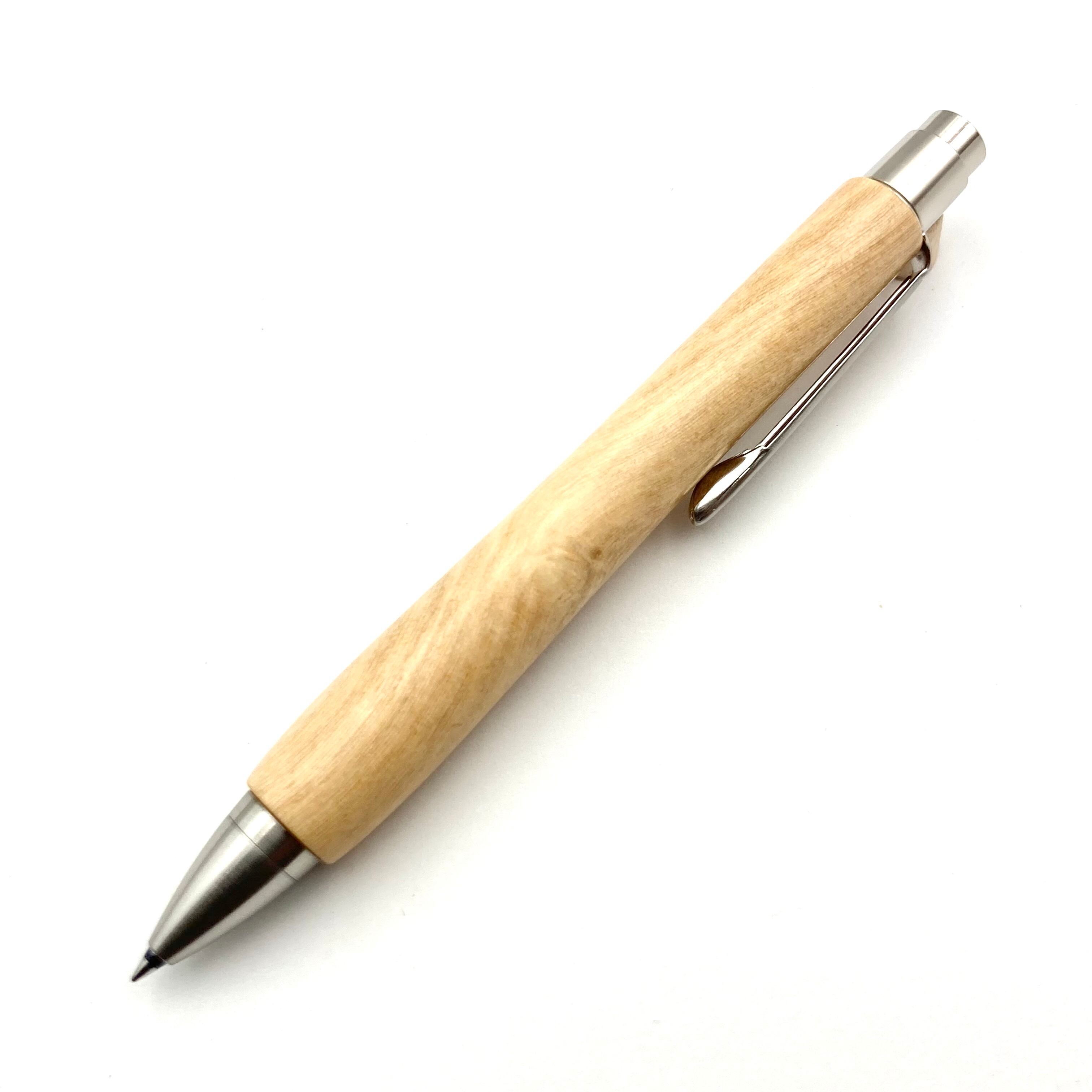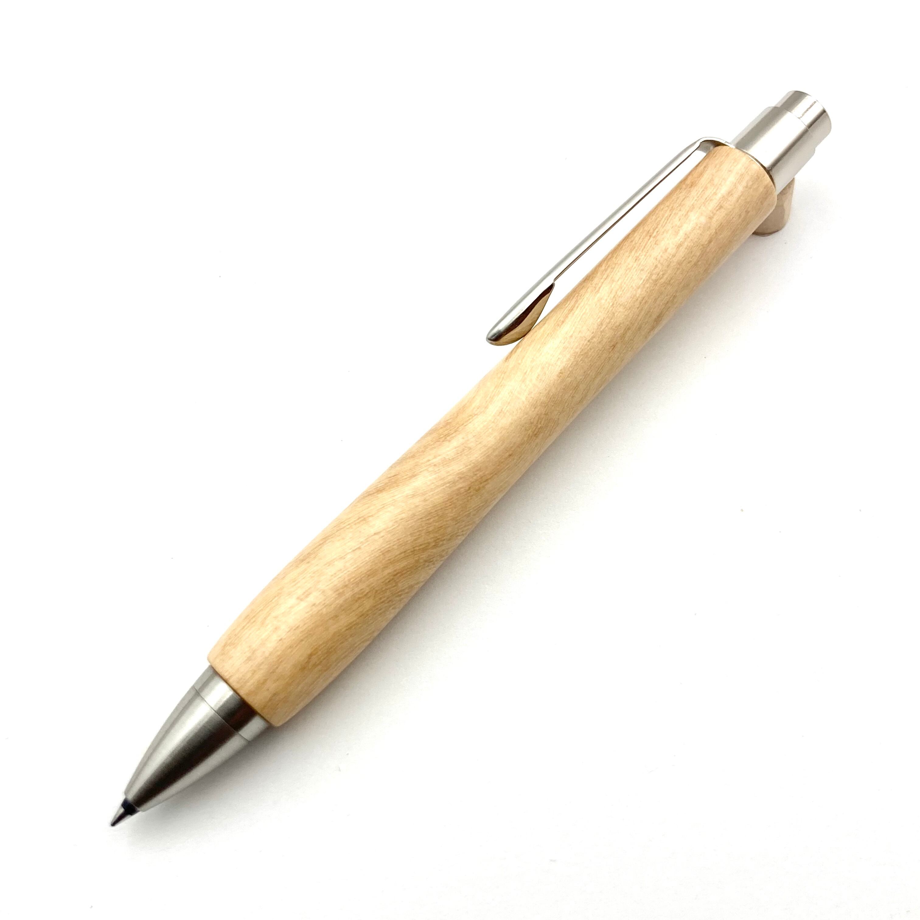 ボールペンのノックシステムは、ドイツ最高のクリックメカニズムを採用してあります。このメカニズムはユニークな機構のため、クリックしたときのカチカチ音が静かで、どんな場所でも気兼ねなく使うことができます。滑らかに動くこのプッシュ感覚を一度味わうと他には戻れなくなってしまうほどの魅力があります。 100分の1単位の加工精度で削り出されたペン先は、軸ブレも全くありません。