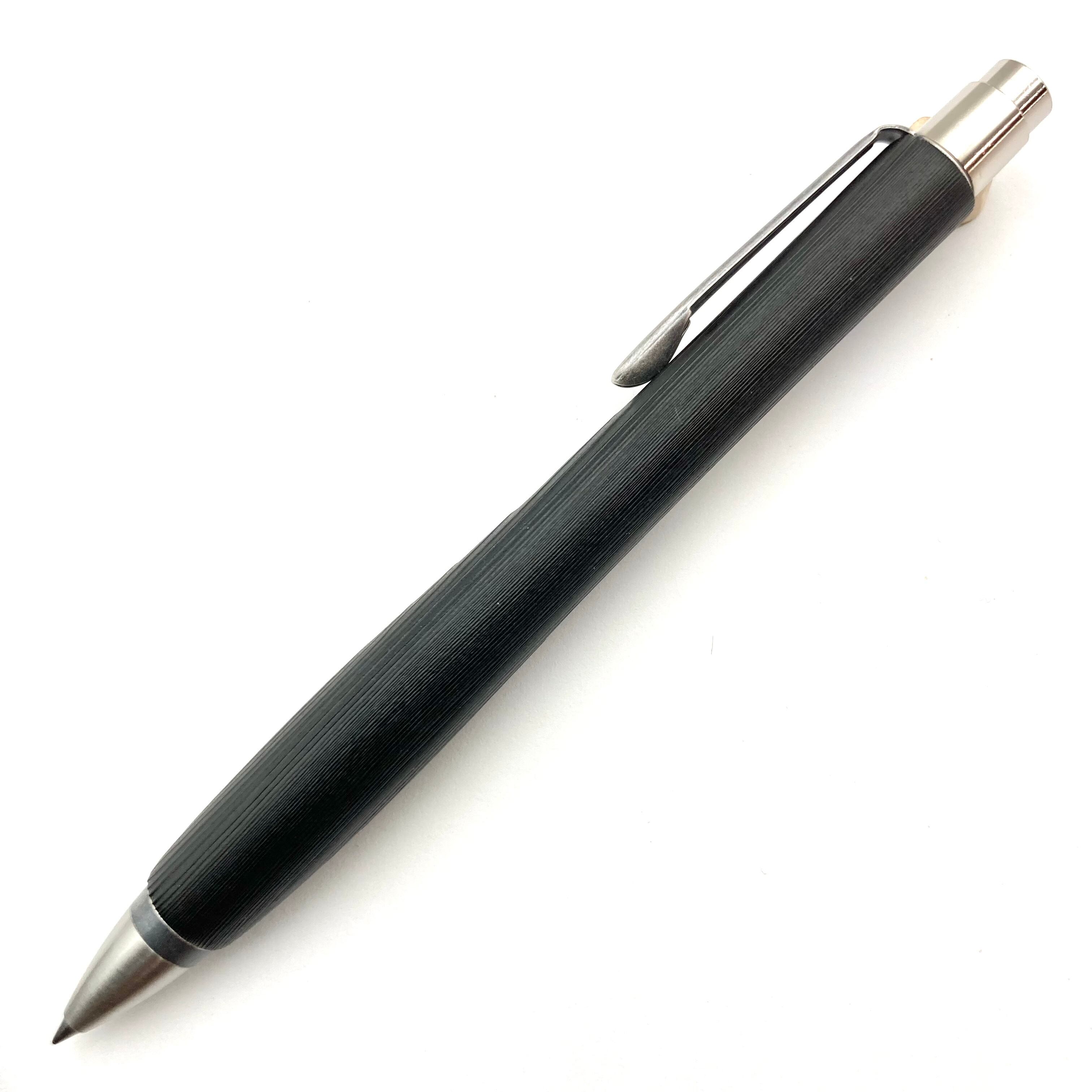 ボールペンのノックシステムは、ドイツ最高のクリックメカニズムを採用してあります。このメカニズムはユニークな機構のため、クリックしたときのカチカチ音が静かで、どんな場所でも気兼ねなく使うことができます。滑らかに動くこのプッシュ感覚を一度味わうと他には戻れなくなってしまうほどの魅力があります。 100分の1単位の加工精度で削り出されたペン先は、軸ブレも全くありません。