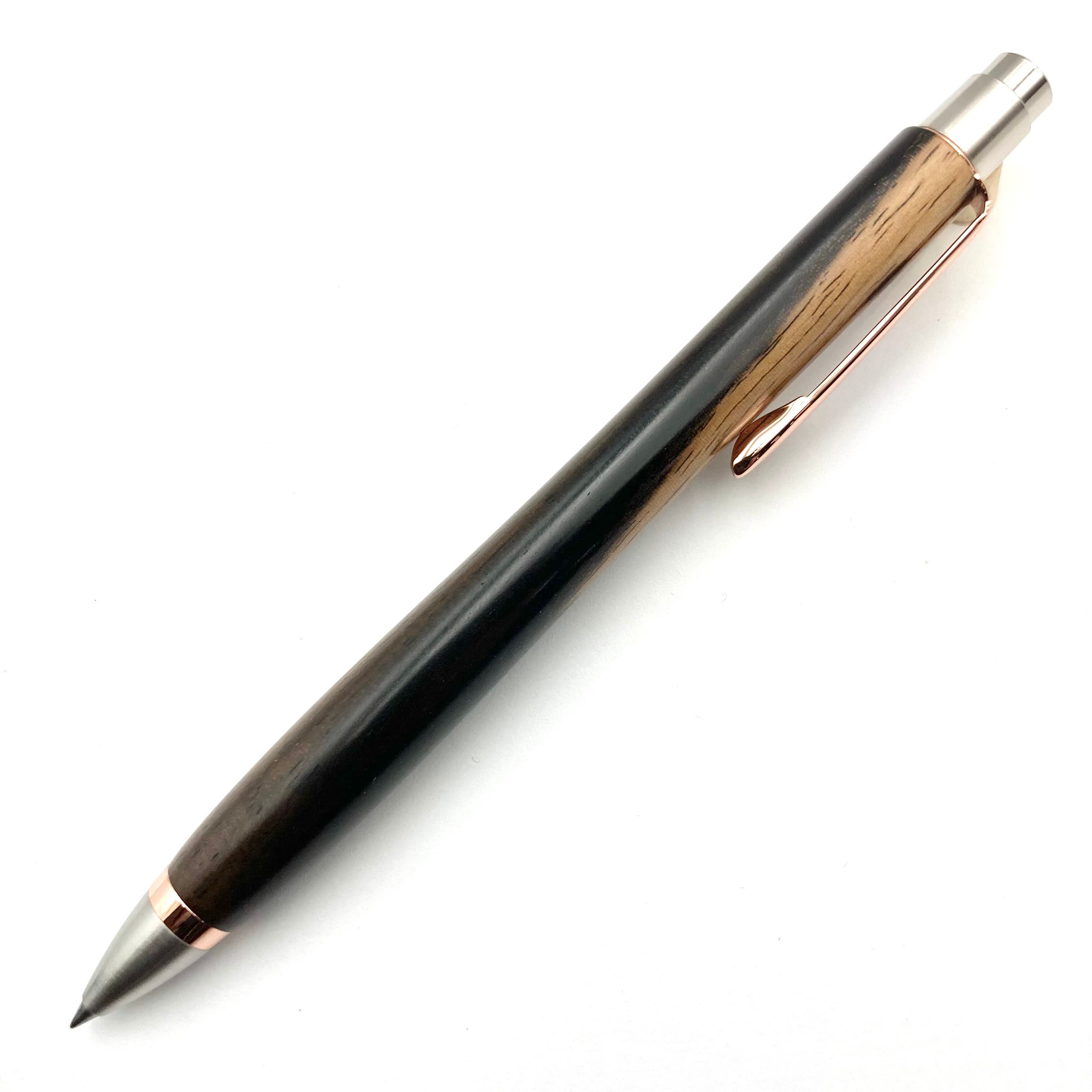 ボールペンのノックシステムは、ドイツ最高のクリックメカニズムを採用してあります。このメカニズムはユニークな機構のため、クリックしたときのカチカチ音が静かで、どんな場所でも気兼ねなく使うことができます。滑らかに動くこのプッシュ感覚を一度味わうと他には戻れなくなってしまうほどの魅力があります。 100分の1単位の加工精度で削り出されたペン先は、軸ブレも全くありません。