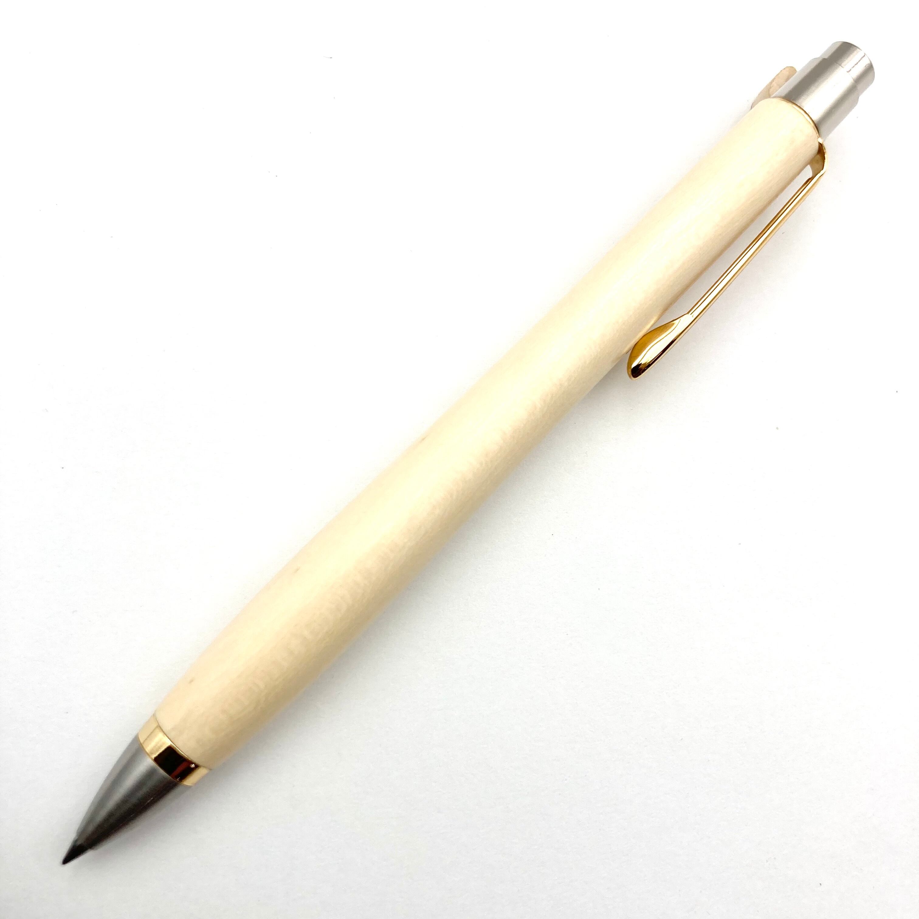 ボールペンのノックシステムは、ドイツ最高のクリックメカニズムを採用してあります。このメカニズムはユニークな機構のため、クリックしたときのカチカチ音が静かで、どんな場所でも気兼ねなく使うことができます。滑らかに動くこのプッシュ感覚を一度味わうと他には戻れなくなってしまうほどの魅力があります。 100分の1単位の加工精度で削り出されたペン先は、軸ブレも全くありません。