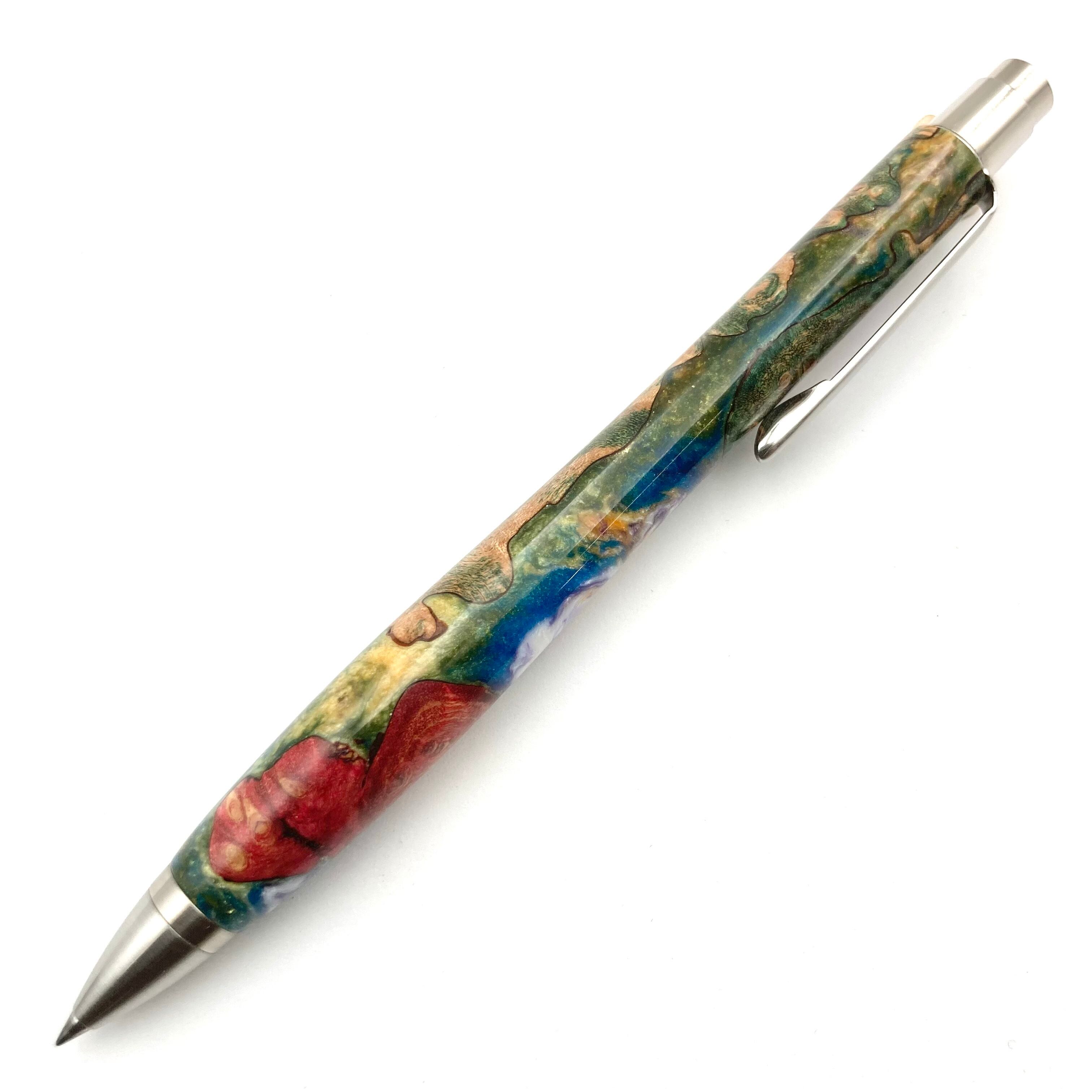 ボールペンのノックシステムは、ドイツ最高のクリックメカニズムを採用してあります。このメカニズムはユニークな機構のため、クリックしたときのカチカチ音が静かで、どんな場所でも気兼ねなく使うことができます。滑らかに動くこのプッシュ感覚を一度味わうと他には戻れなくなってしまうほどの魅力があります。 100分の1単位の加工精度で削り出されたペン先は、軸ブレも全くありません。