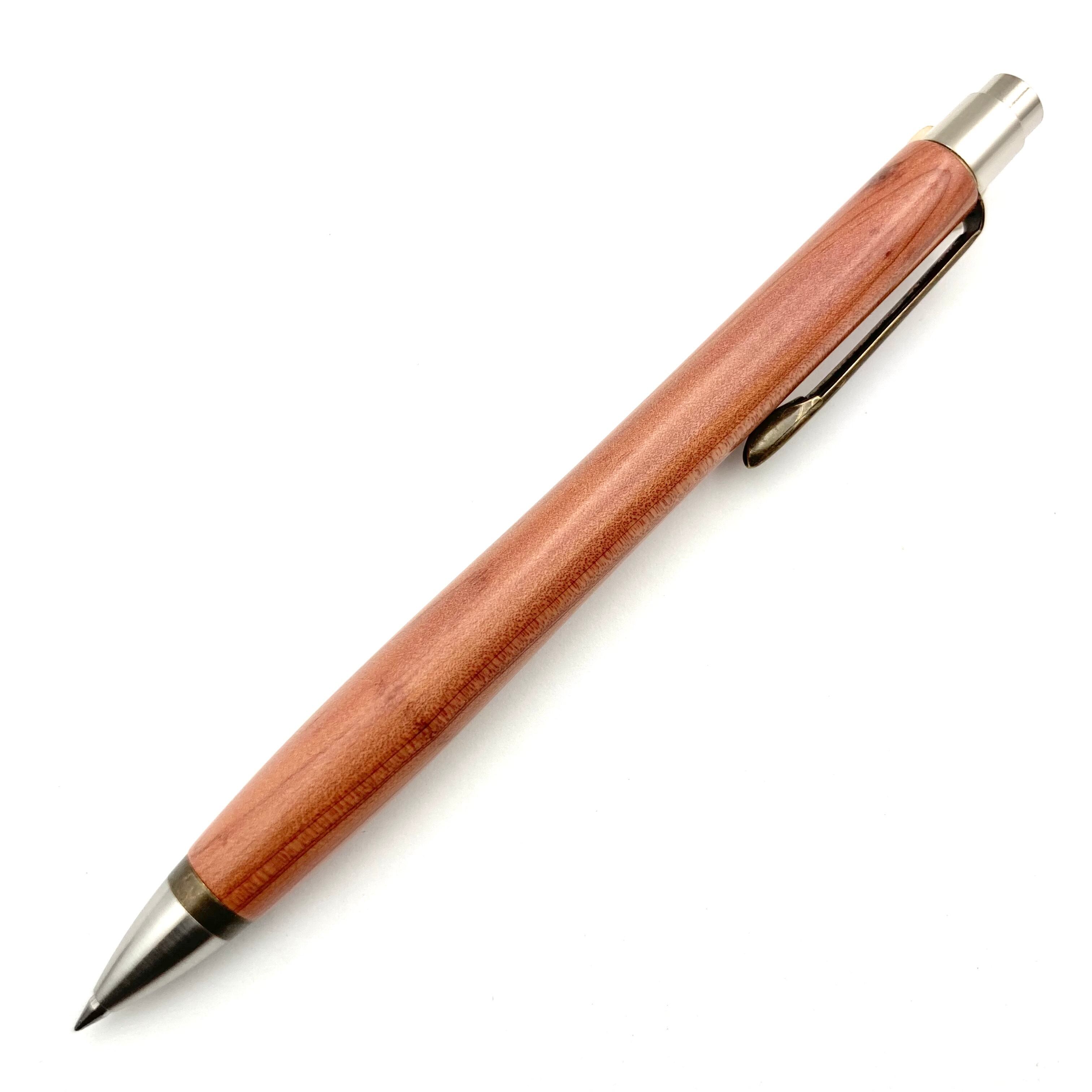 ボールペンのノックシステムは、ドイツ最高のクリックメカニズムを採用してあります。このメカニズムはユニークな機構のため、クリックしたときのカチカチ音が静かで、どんな場所でも気兼ねなく使うことができます。滑らかに動くこのプッシュ感覚を一度味わうと他には戻れなくなってしまうほどの魅力があります。 100分の1単位の加工精度で削り出されたペン先は、軸ブレも全くありません。