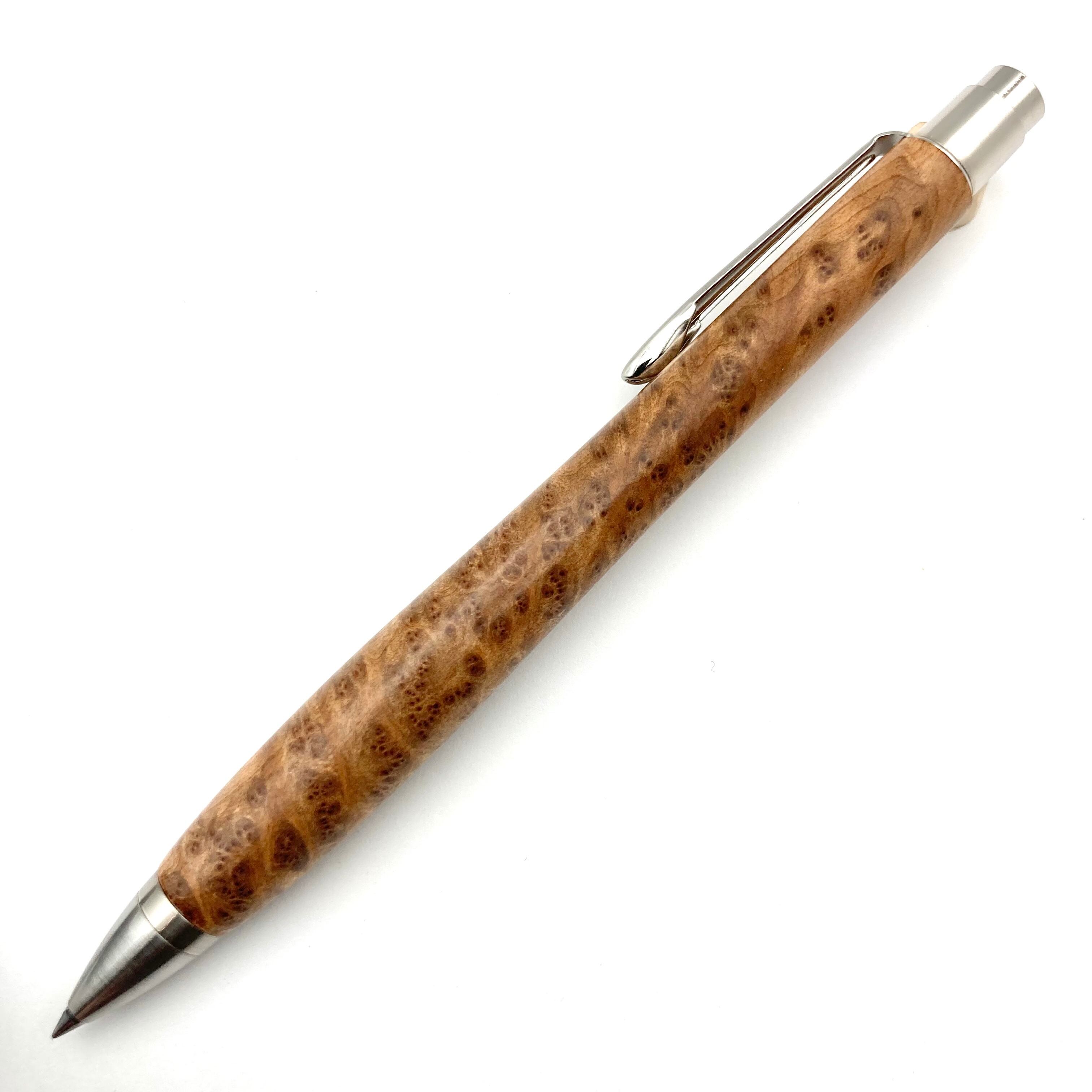 ボールペンのノックシステムは、ドイツ最高のクリックメカニズムを採用してあります。このメカニズムはユニークな機構のため、クリックしたときのカチカチ音が静かで、どんな場所でも気兼ねなく使うことができます。滑らかに動くこのプッシュ感覚を一度味わうと他には戻れなくなってしまうほどの魅力があります。 100分の1単位の加工精度で削り出されたペン先は、軸ブレも全くありません。