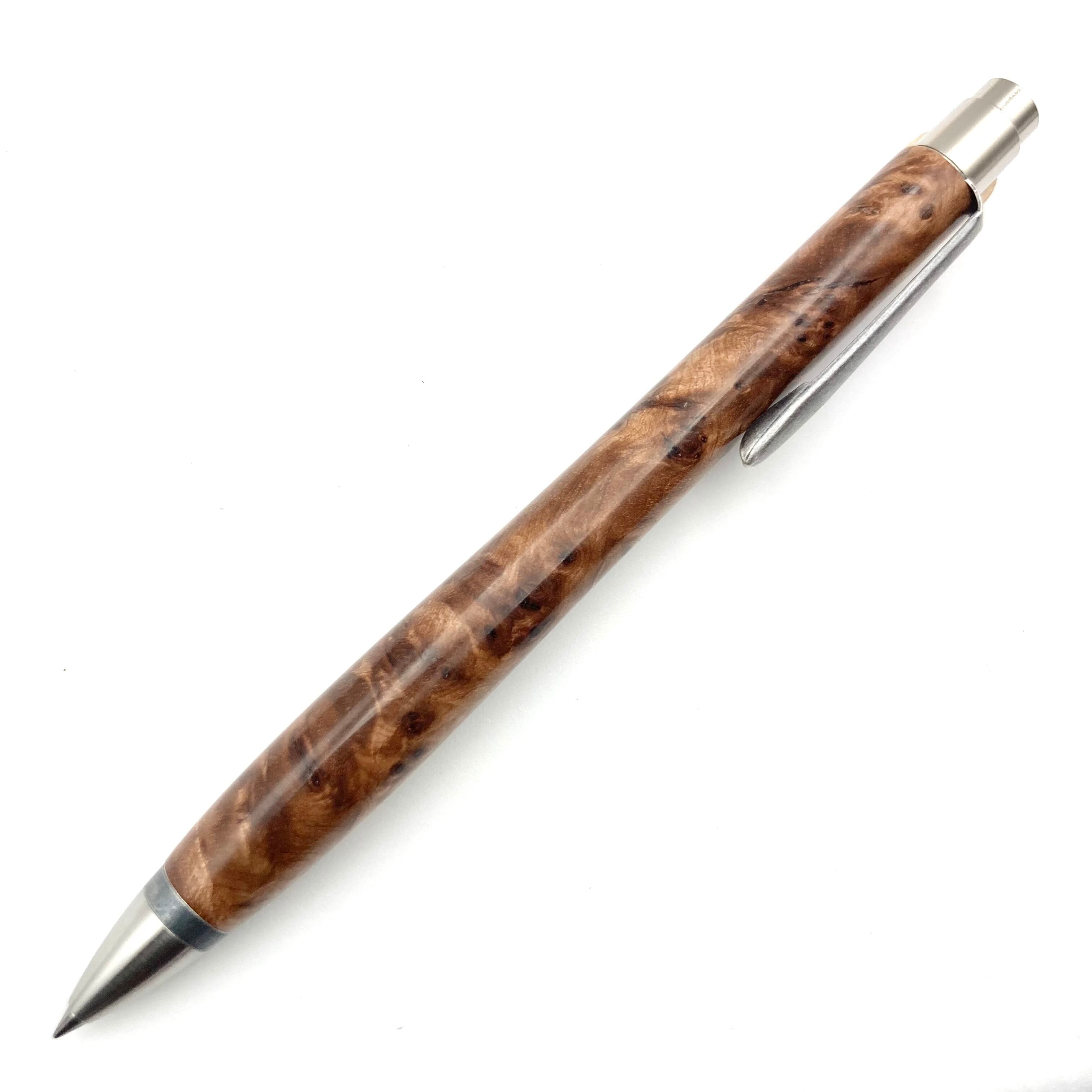 ボールペンのノックシステムは、ドイツ最高のクリックメカニズムを採用してあります。このメカニズムはユニークな機構のため、クリックしたときのカチカチ音が静かで、どんな場所でも気兼ねなく使うことができます。滑らかに動くこのプッシュ感覚を一度味わうと他には戻れなくなってしまうほどの魅力があります。 100分の1単位の加工精度で削り出されたペン先は、軸ブレも全くありません。