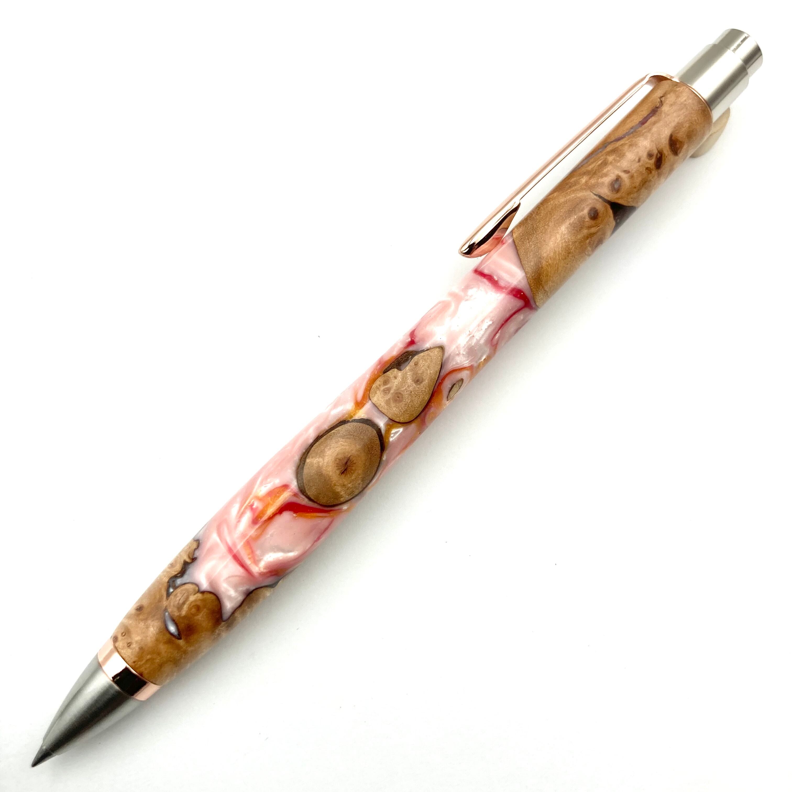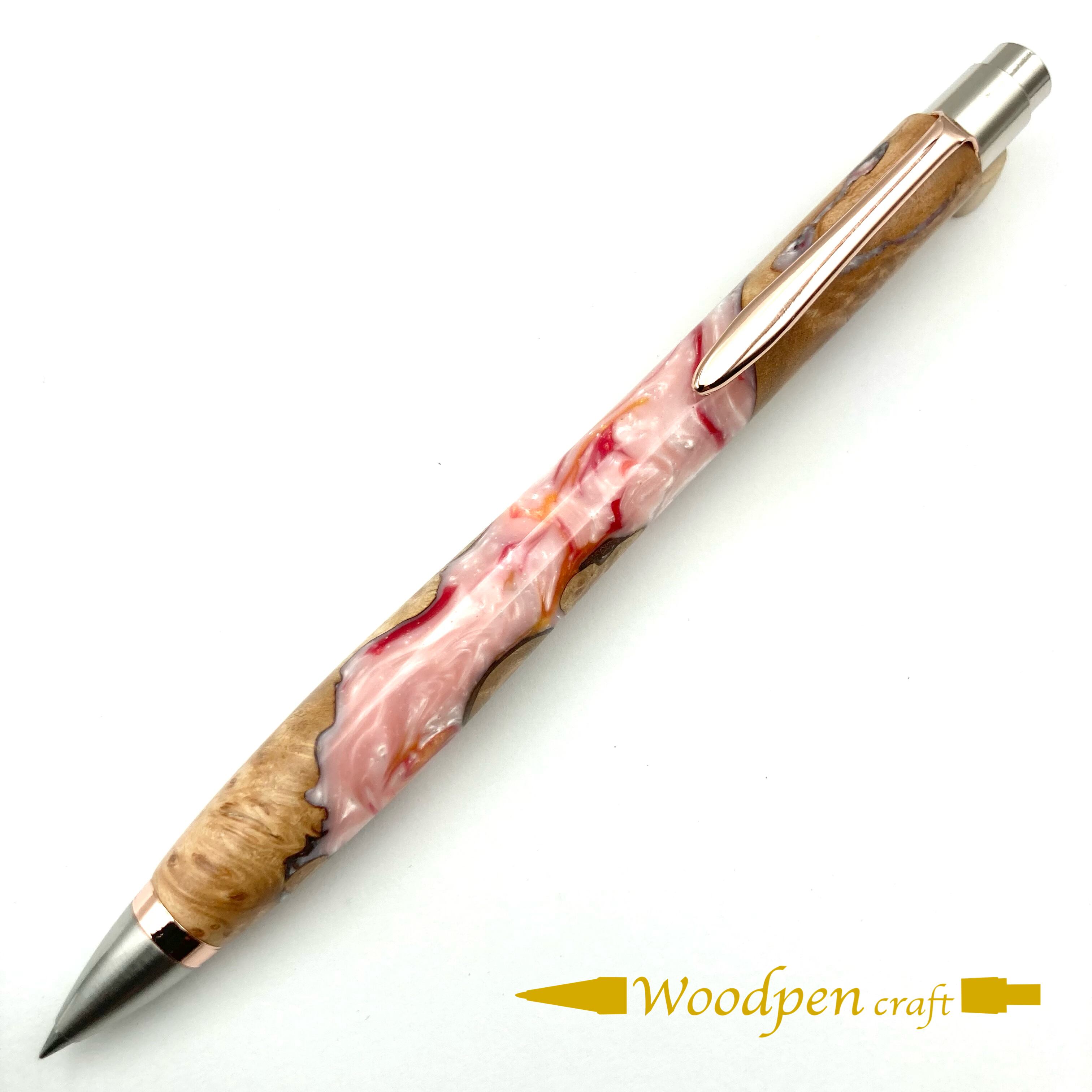 ボールペンのノックシステムは、ドイツ最高のクリックメカニズムを採用してあります。このメカニズムはユニークな機構のため、クリックしたときのカチカチ音が静かで、どんな場所でも気兼ねなく使うことができます。滑らかに動くこのプッシュ感覚を一度味わうと他には戻れなくなってしまうほどの魅力があります。 100分の1単位の加工精度で削り出されたペン先は、軸ブレも全くありません。