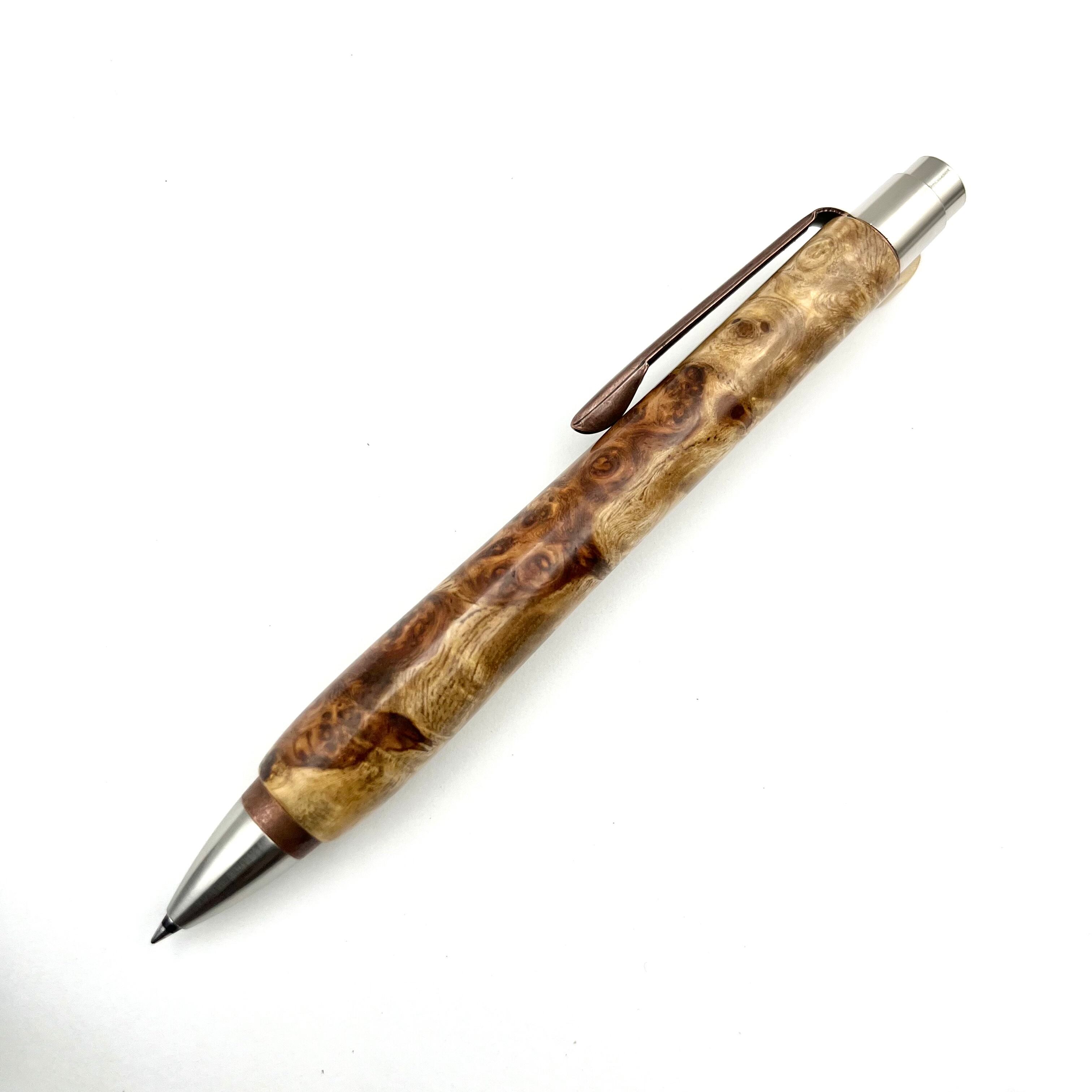 ボールペンのノックシステムは、ドイツ最高のクリックメカニズムを採用してあります。このメカニズムはユニークな機構のため、クリックしたときのカチカチ音が静かで、どんな場所でも気兼ねなく使うことができます。滑らかに動くこのプッシュ感覚を一度味わうと他には戻れなくなってしまうほどの魅力があります。 100分の1単位の加工精度で削り出されたペン先は、軸ブレも全くありません。