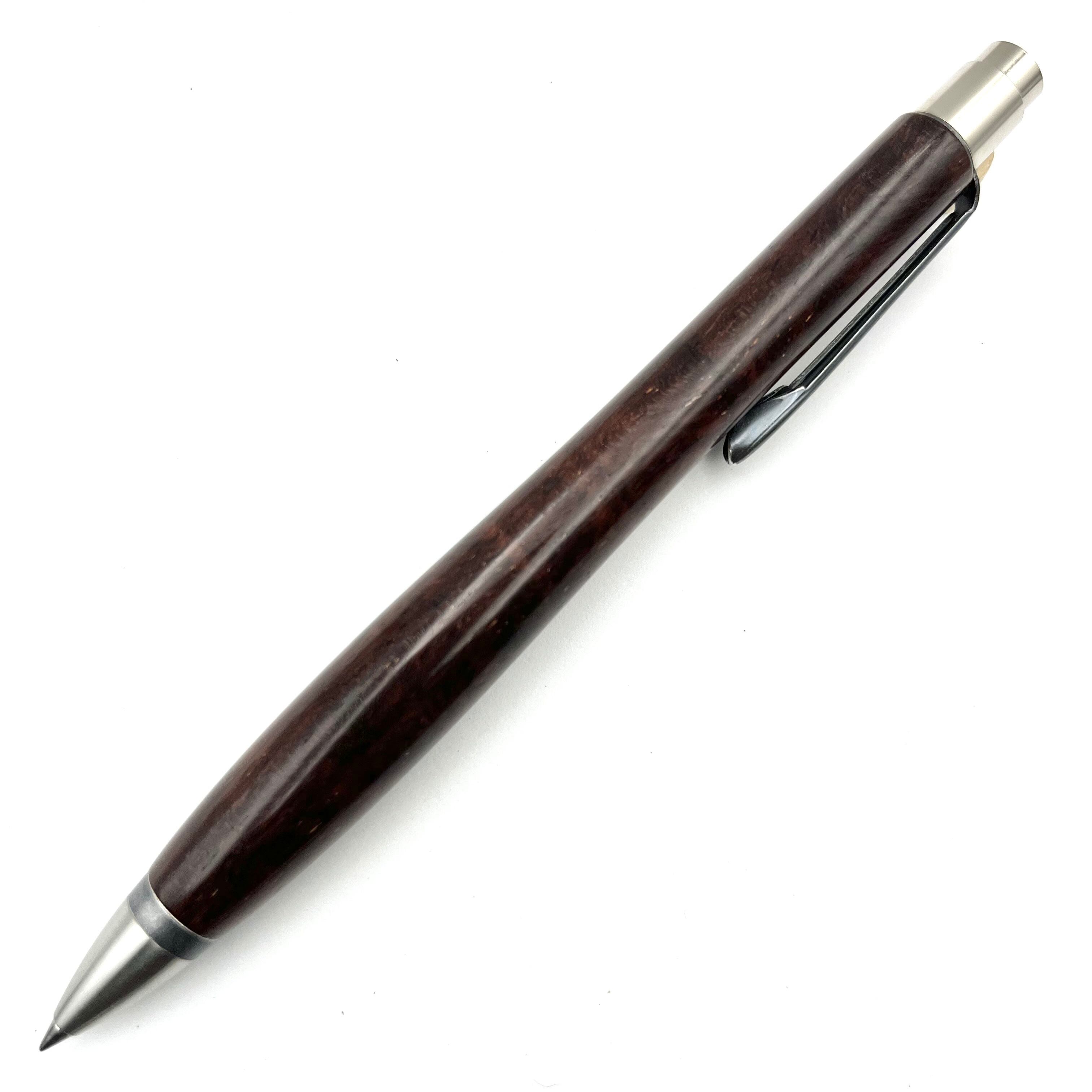 ボールペンのノックシステムは、ドイツ最高のクリックメカニズムを採用してあります。このメカニズムはユニークな機構のため、クリックしたときのカチカチ音が静かで、どんな場所でも気兼ねなく使うことができます。滑らかに動くこのプッシュ感覚を一度味わうと他には戻れなくなってしまうほどの魅力があります。 100分の1単位の加工精度で削り出されたペン先は、軸ブレも全くありません。