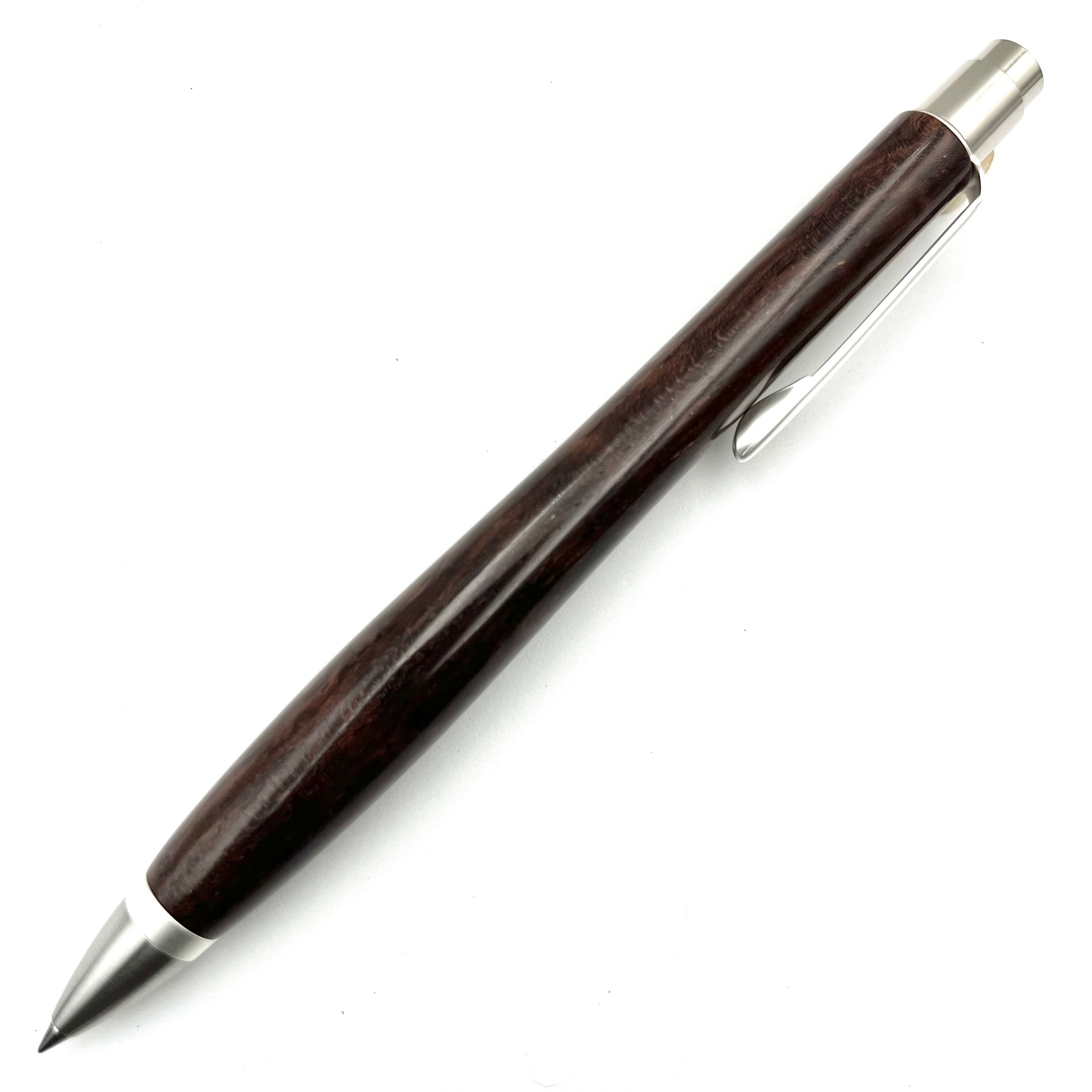 ボールペンのノックシステムは、ドイツ最高のクリックメカニズムを採用してあります。このメカニズムはユニークな機構のため、クリックしたときのカチカチ音が静かで、どんな場所でも気兼ねなく使うことができます。滑らかに動くこのプッシュ感覚を一度味わうと他には戻れなくなってしまうほどの魅力があります。 100分の1単位の加工精度で削り出されたペン先は、軸ブレも全くありません。