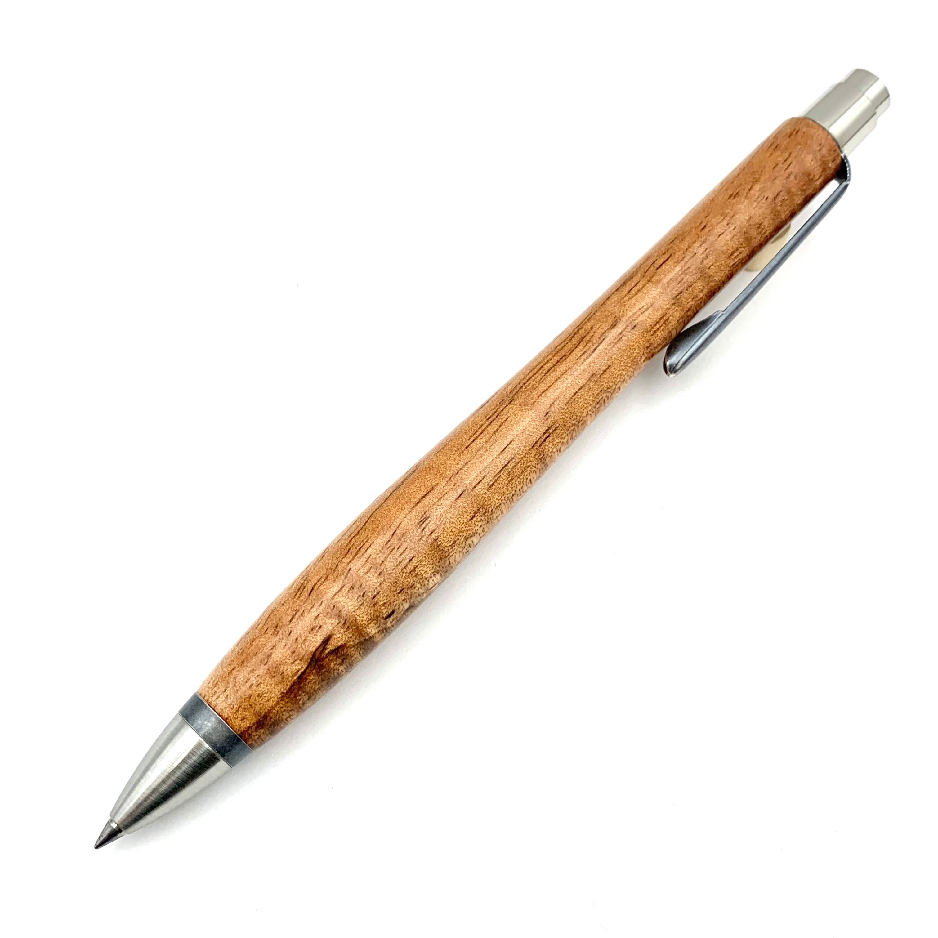 ボールペンのノックシステムは、ドイツ最高のクリックメカニズムを採用してあります。このメカニズムはユニークな機構のため、クリックしたときのカチカチ音が静かで、どんな場所でも気兼ねなく使うことができます。滑らかに動くこのプッシュ感覚を一度味わうと他には戻れなくなってしまうほどの魅力があります。 100分の1単位の加工精度で削り出されたペン先は、軸ブレも全くありません。